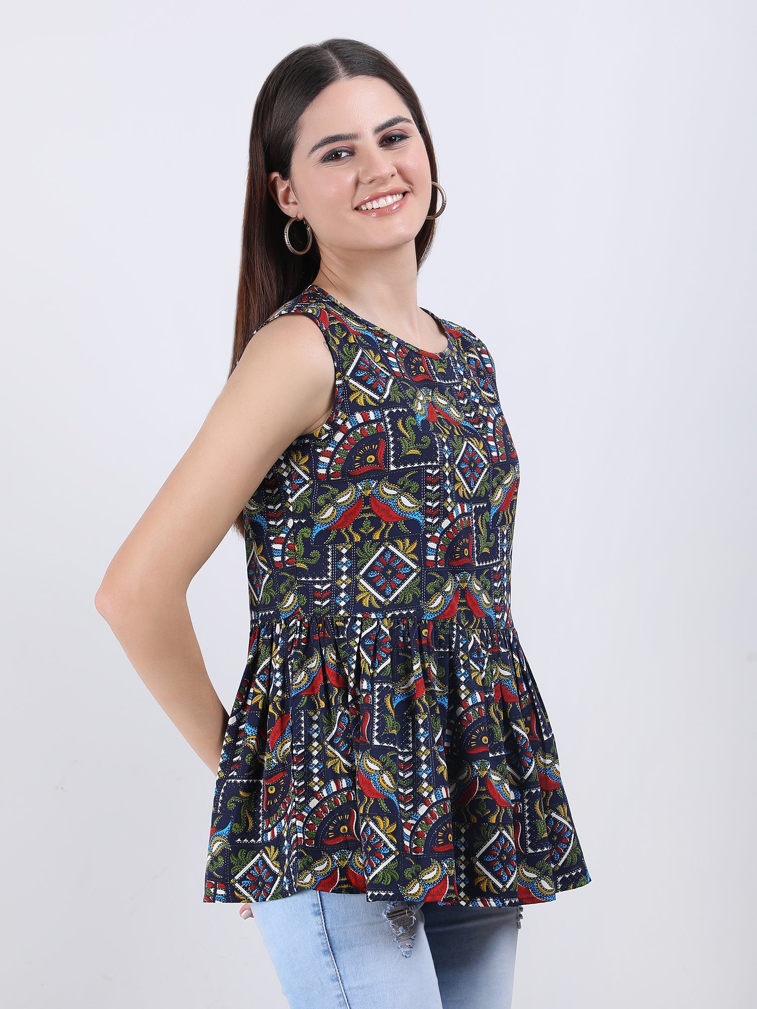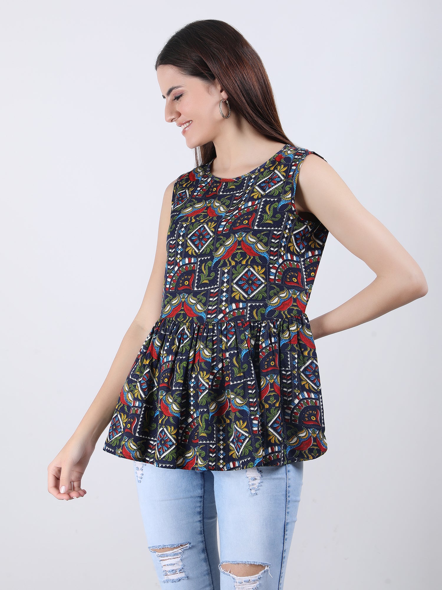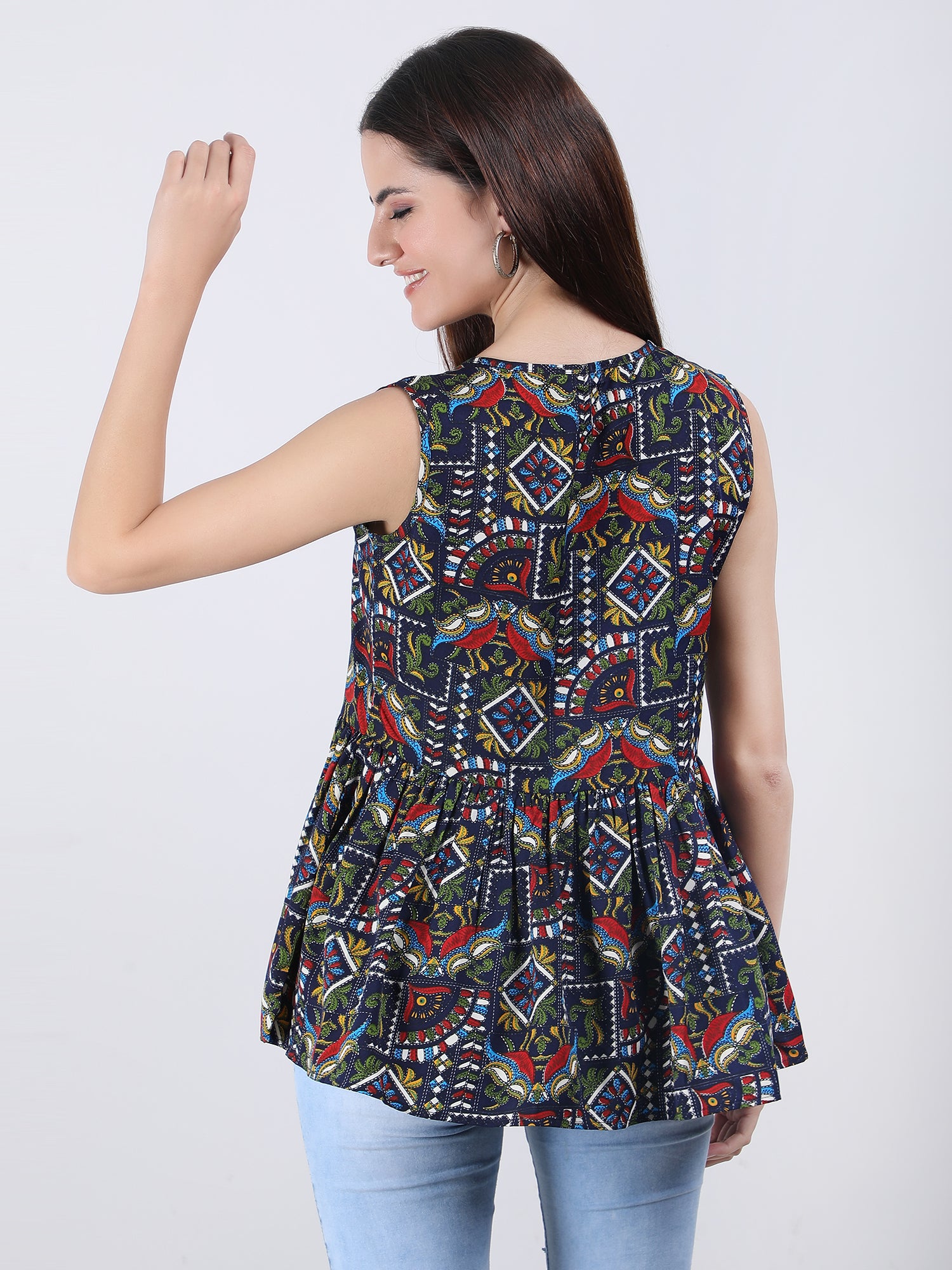 The print is intricately designed and printed onto the fabric, ensuring that the colours will not fade or bleed, even after multiple washes. The Top is versatile and can be dressed up or down, making it perfect for any occasion.