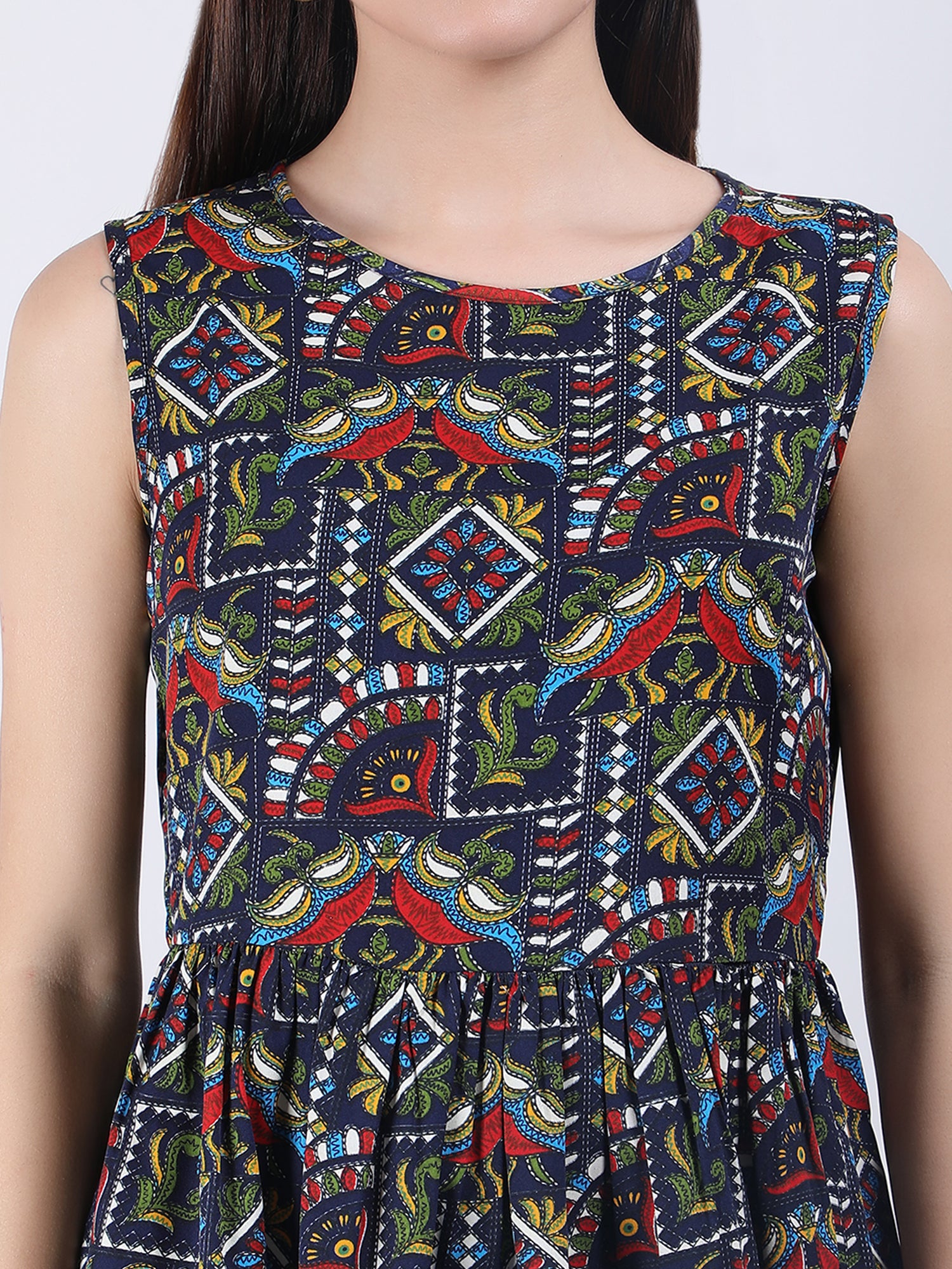 VAPPS Madhubani Print Crepe Round Neck Top - Navy Blue