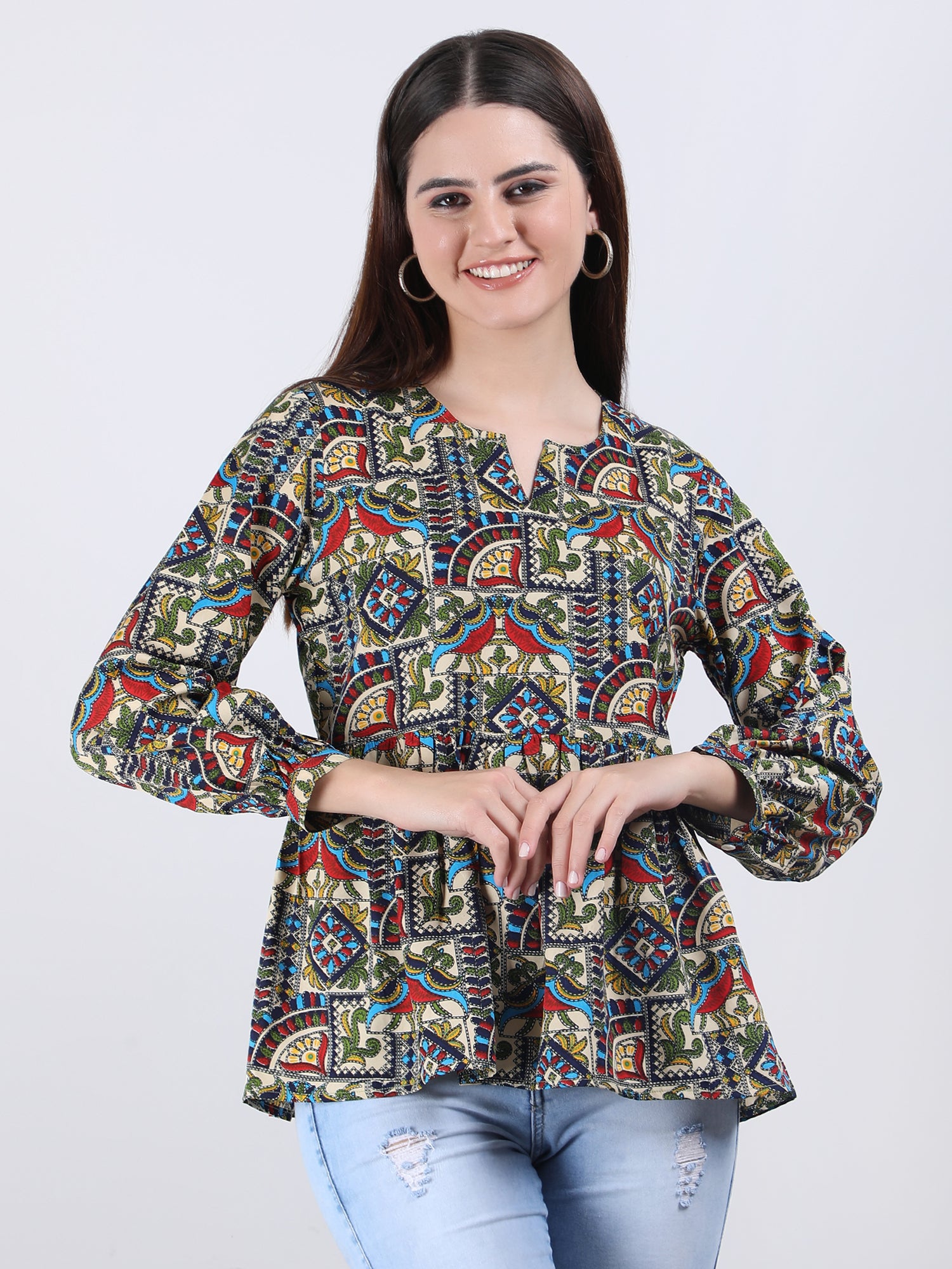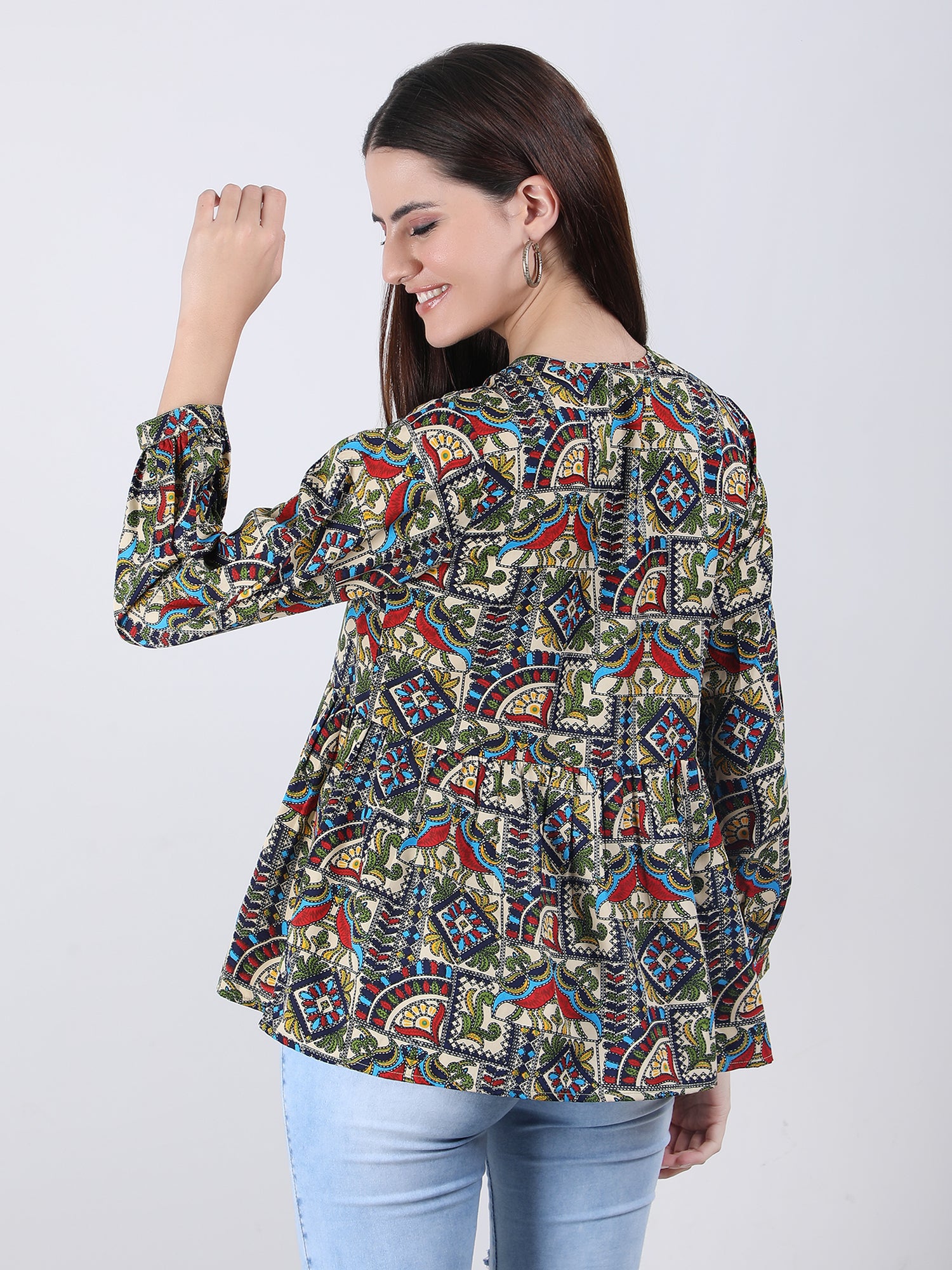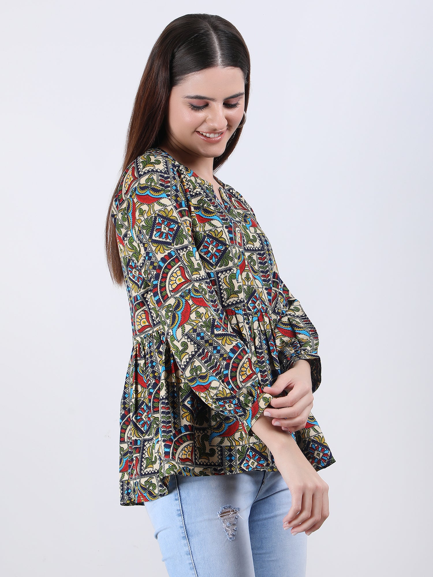 The print is intricately designed and printed onto the fabric, ensuring that the colours will not fade or bleed, even after multiple washes. The Top is versatile and can be dressed up or down, making it perfect for any occasion.