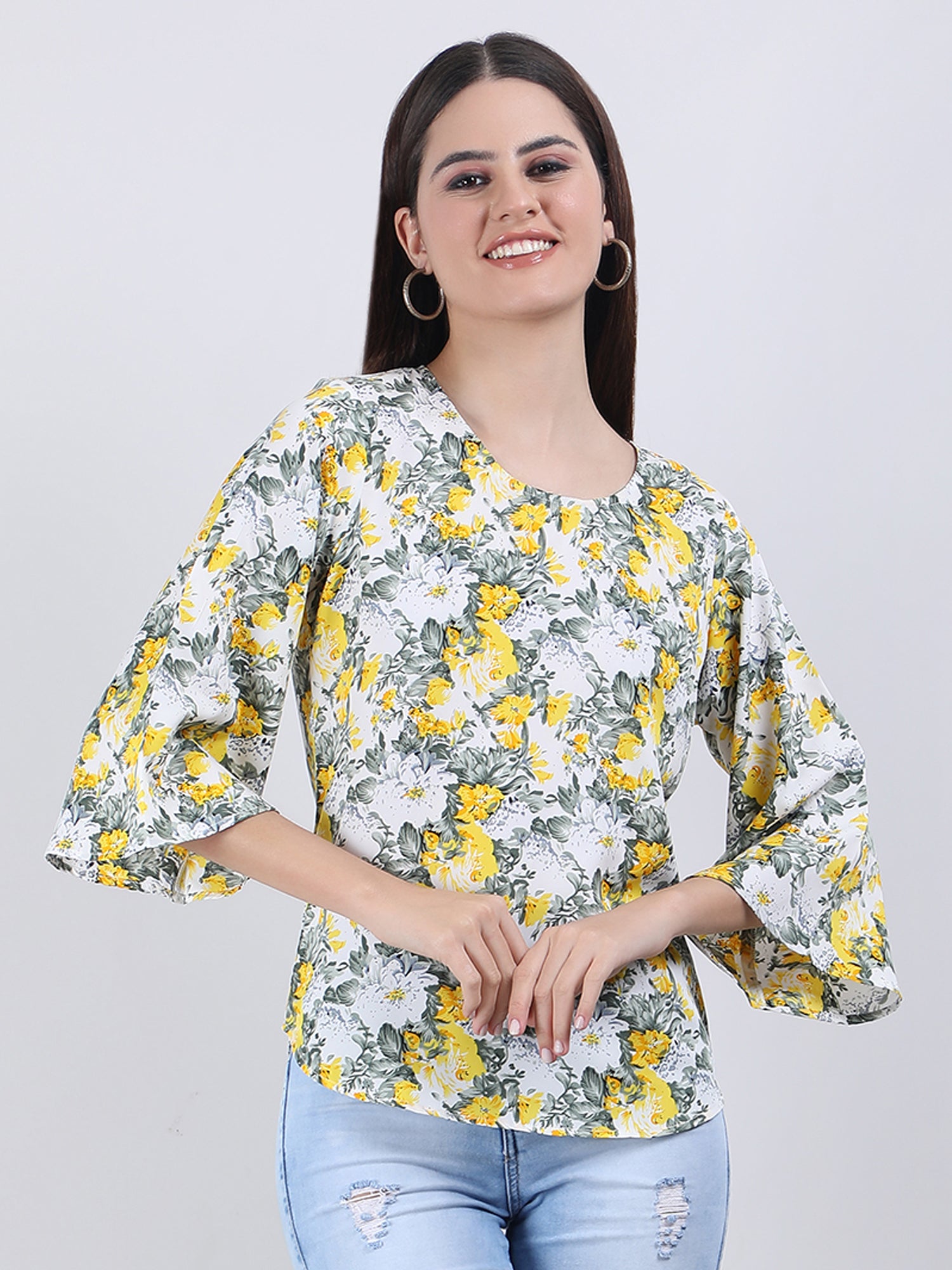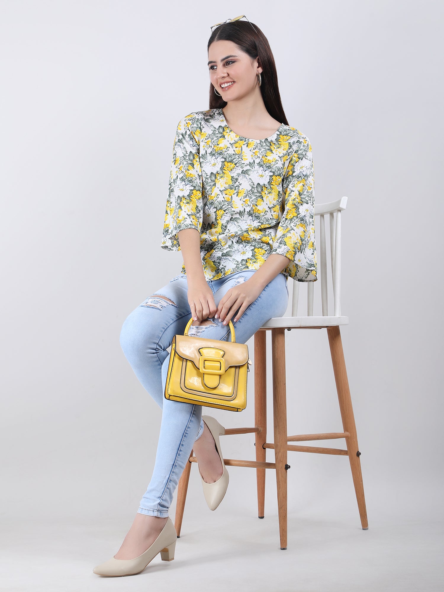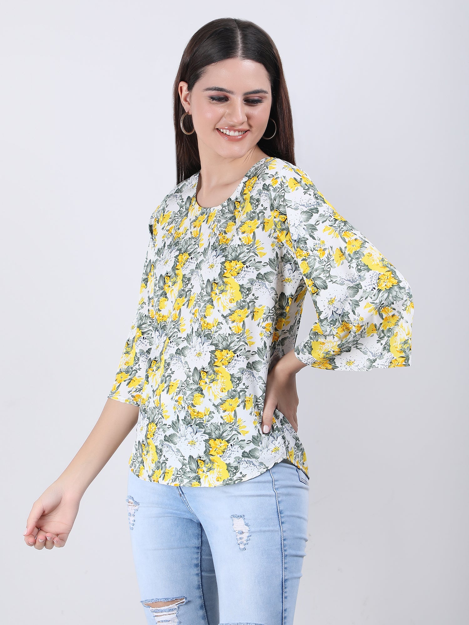 VAPPS Floral Print Crepe Round Neck Top - Yellow