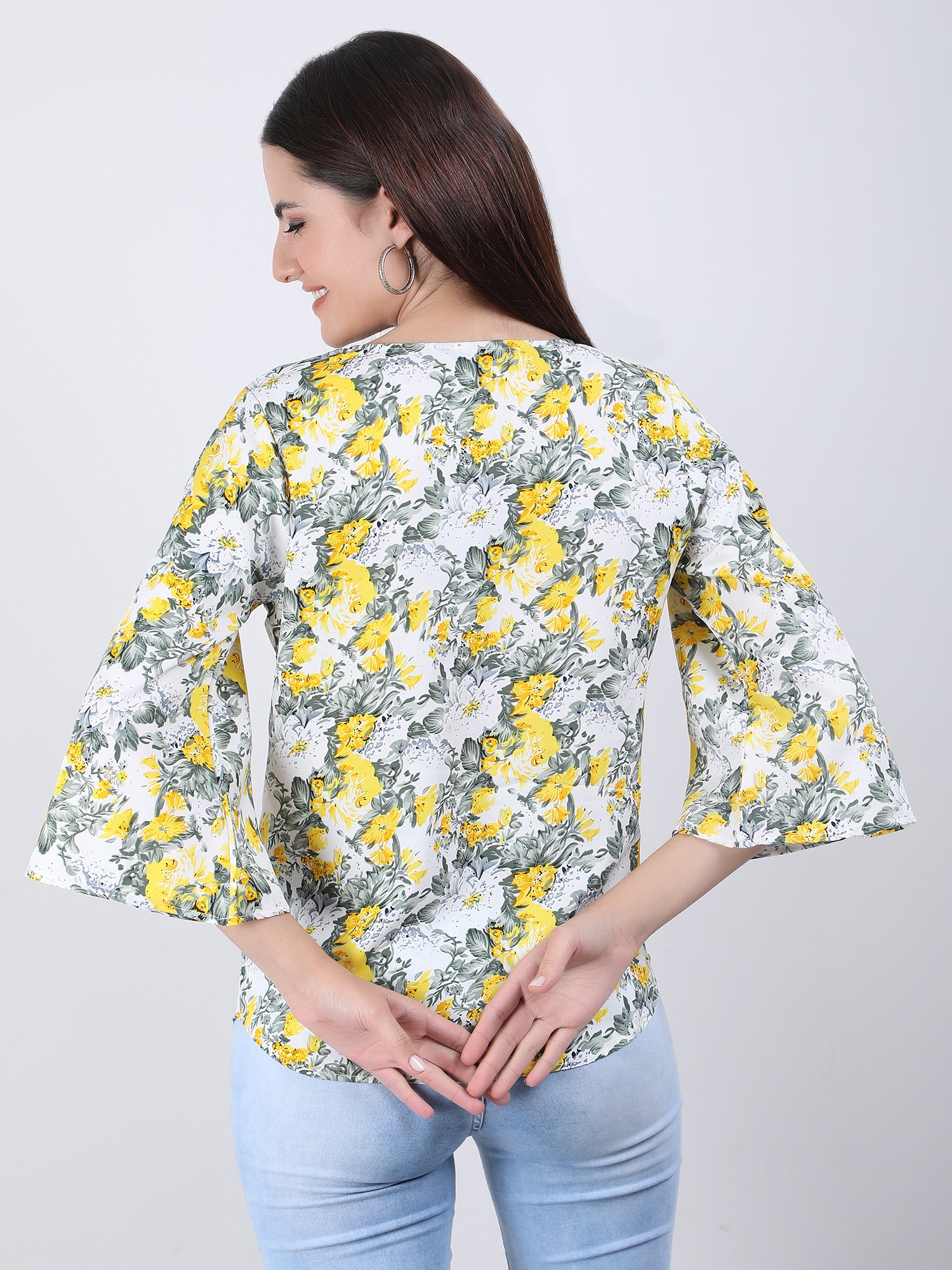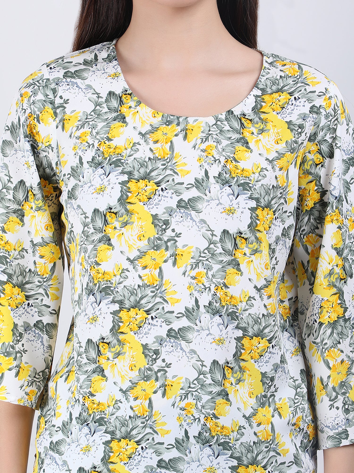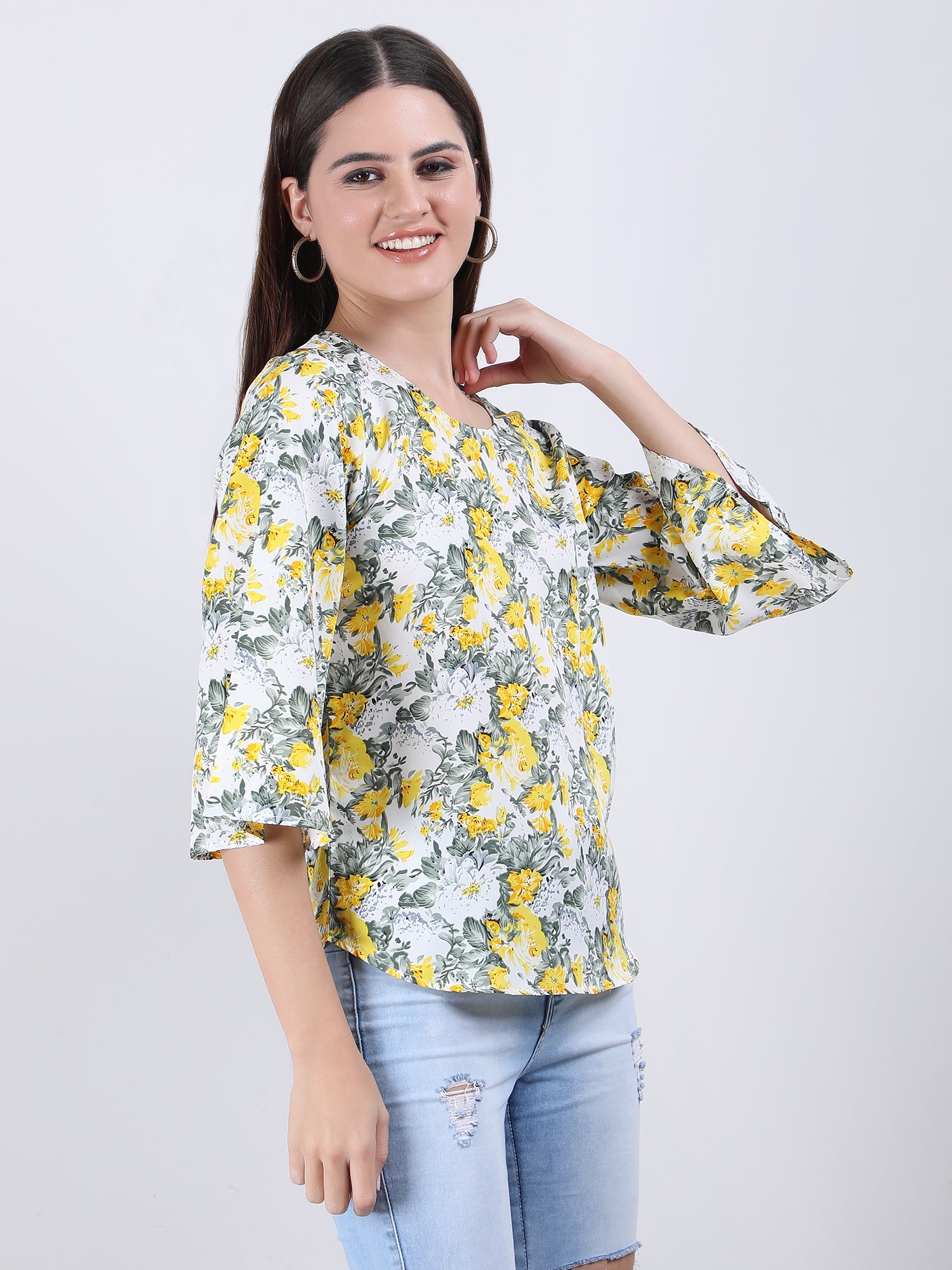 VAPPS Floral Print Crepe Round Neck Top - Yellow