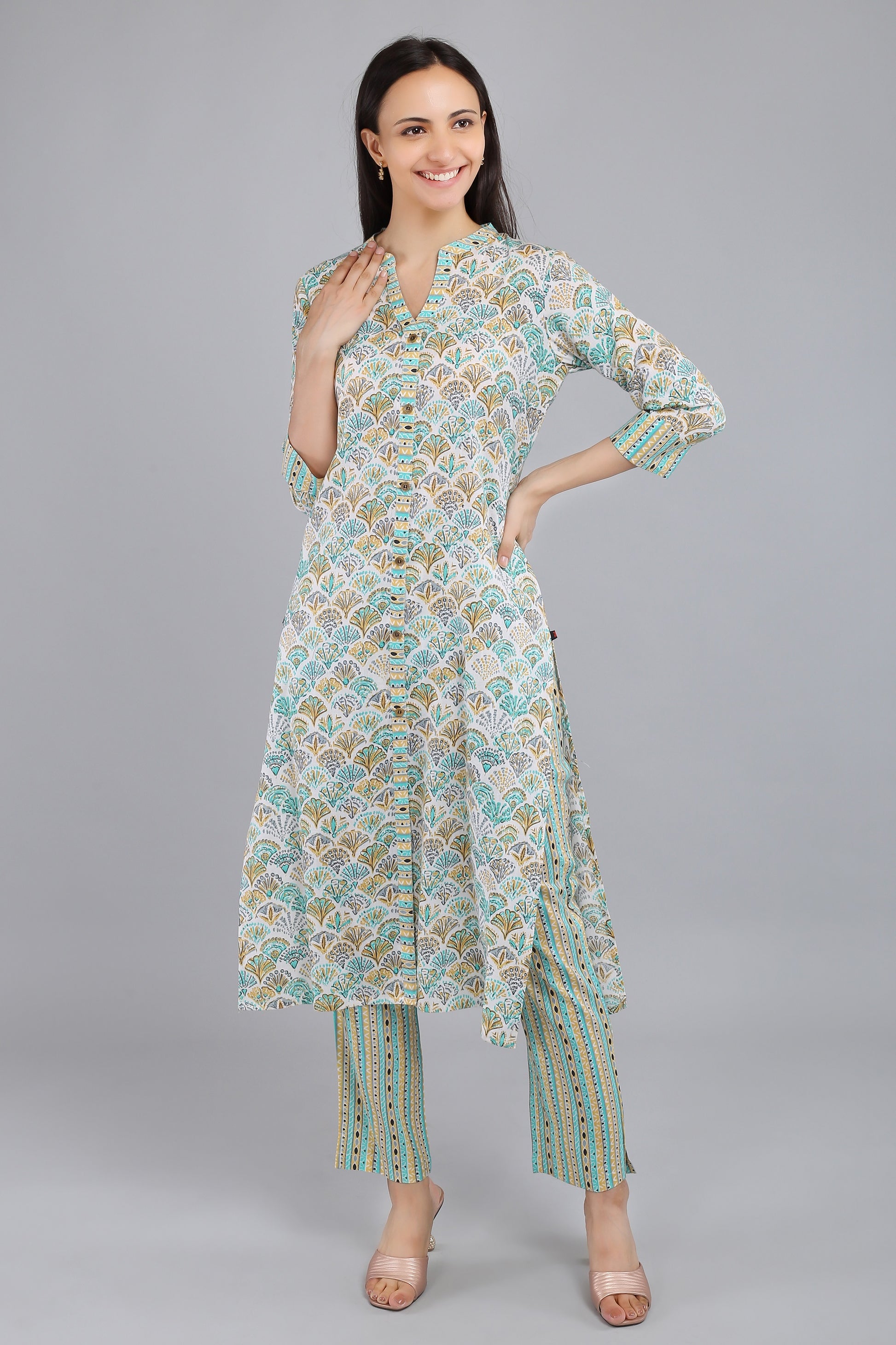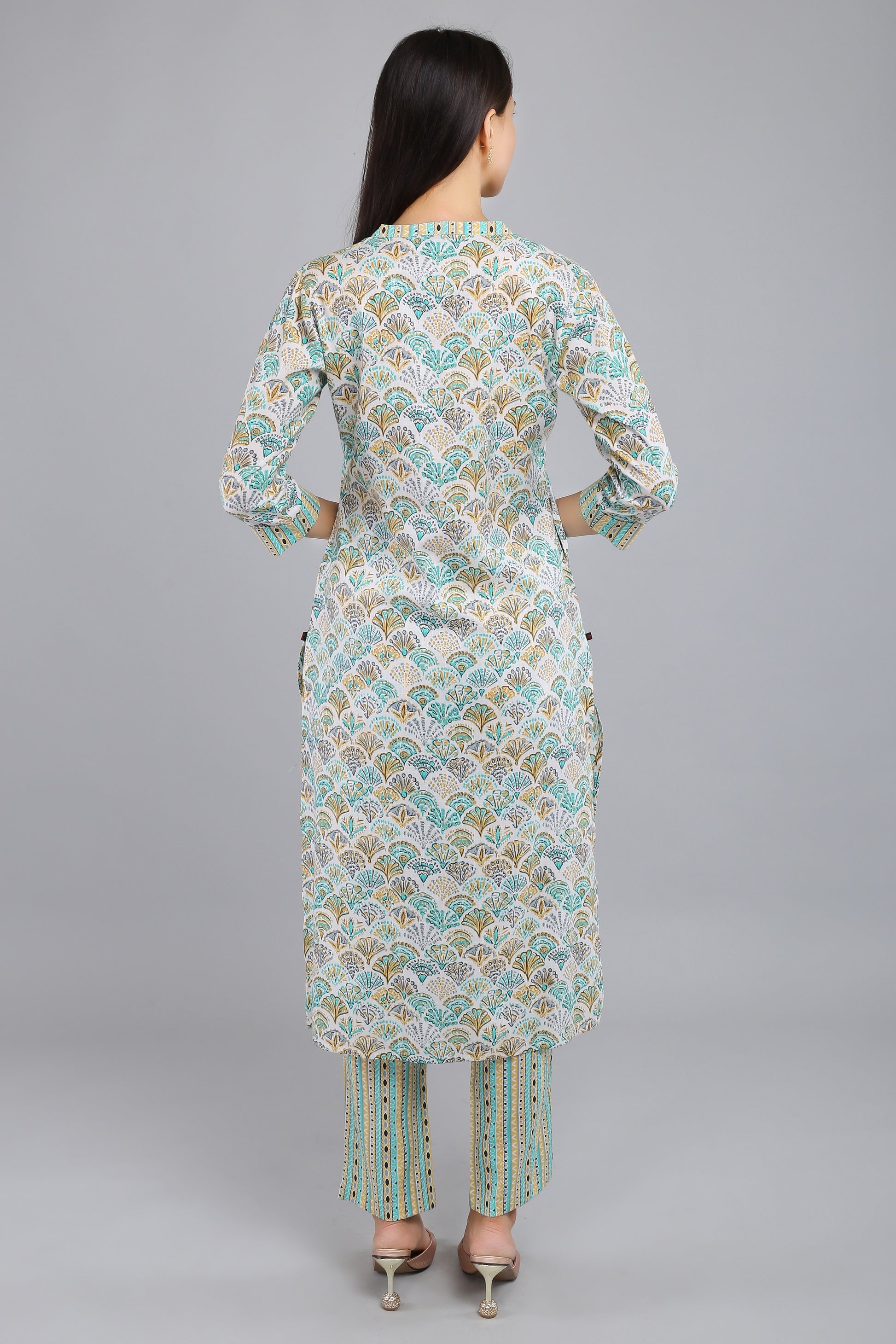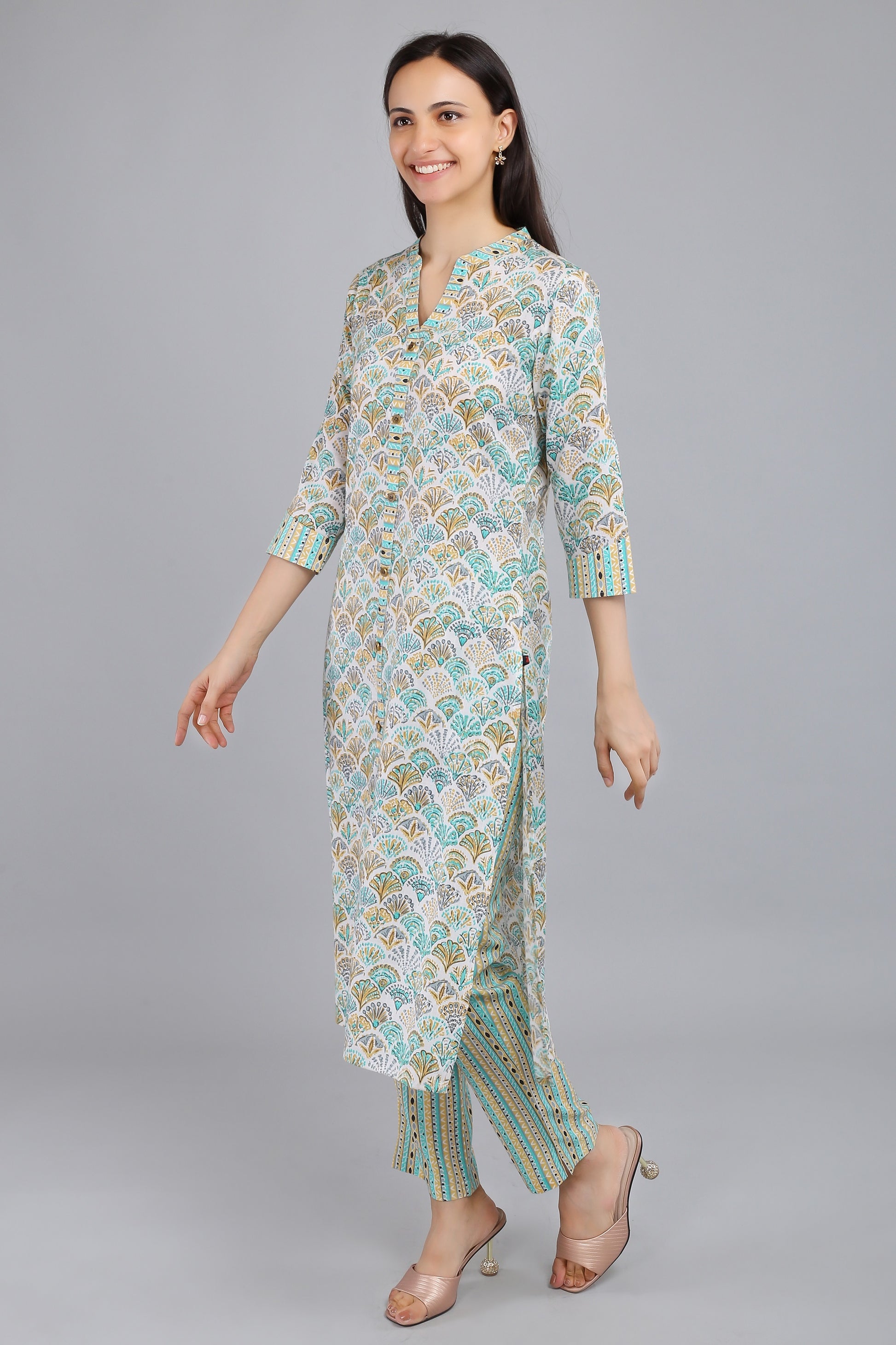 VAPPS Printed Cotton Kurta and Pant Set - Green