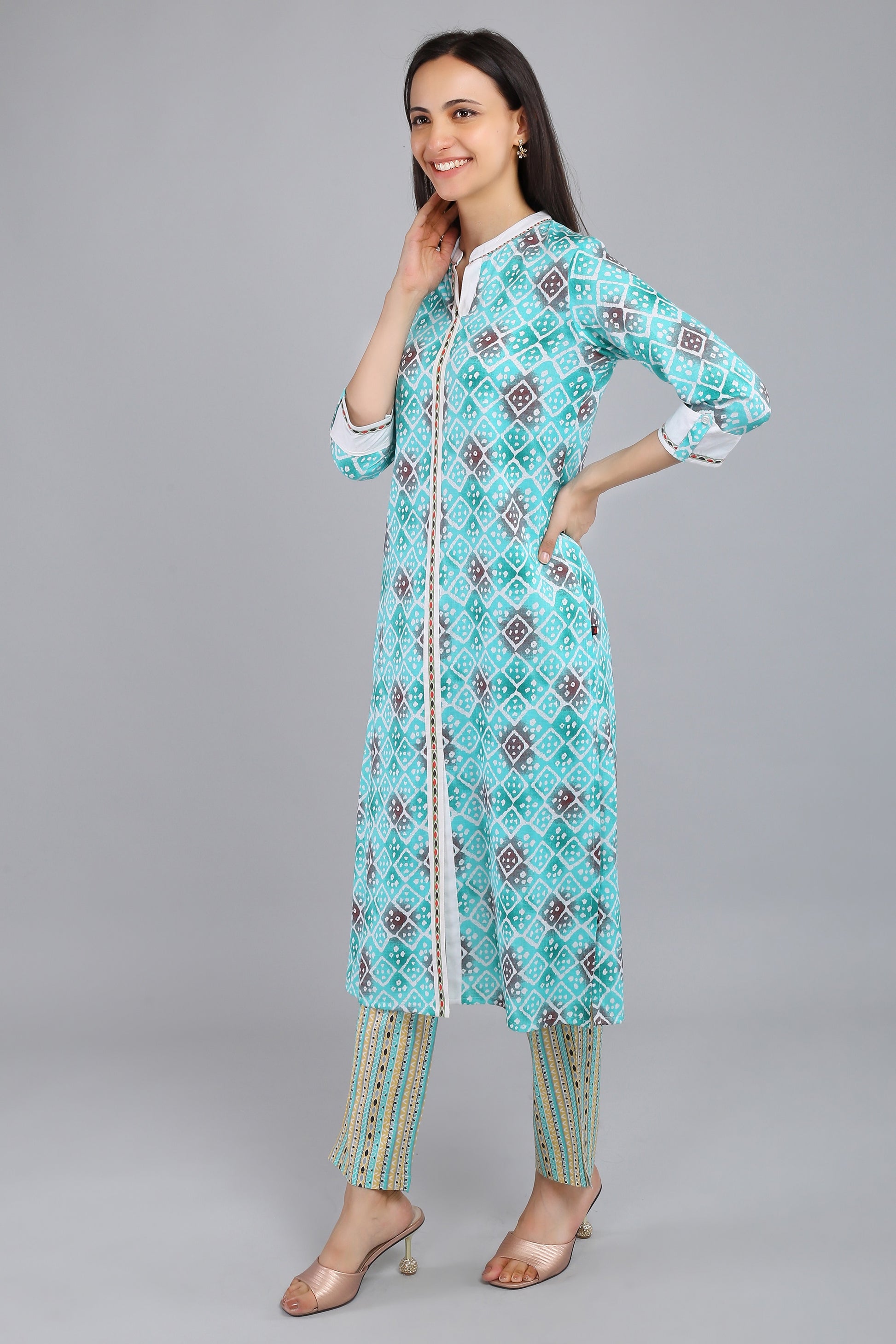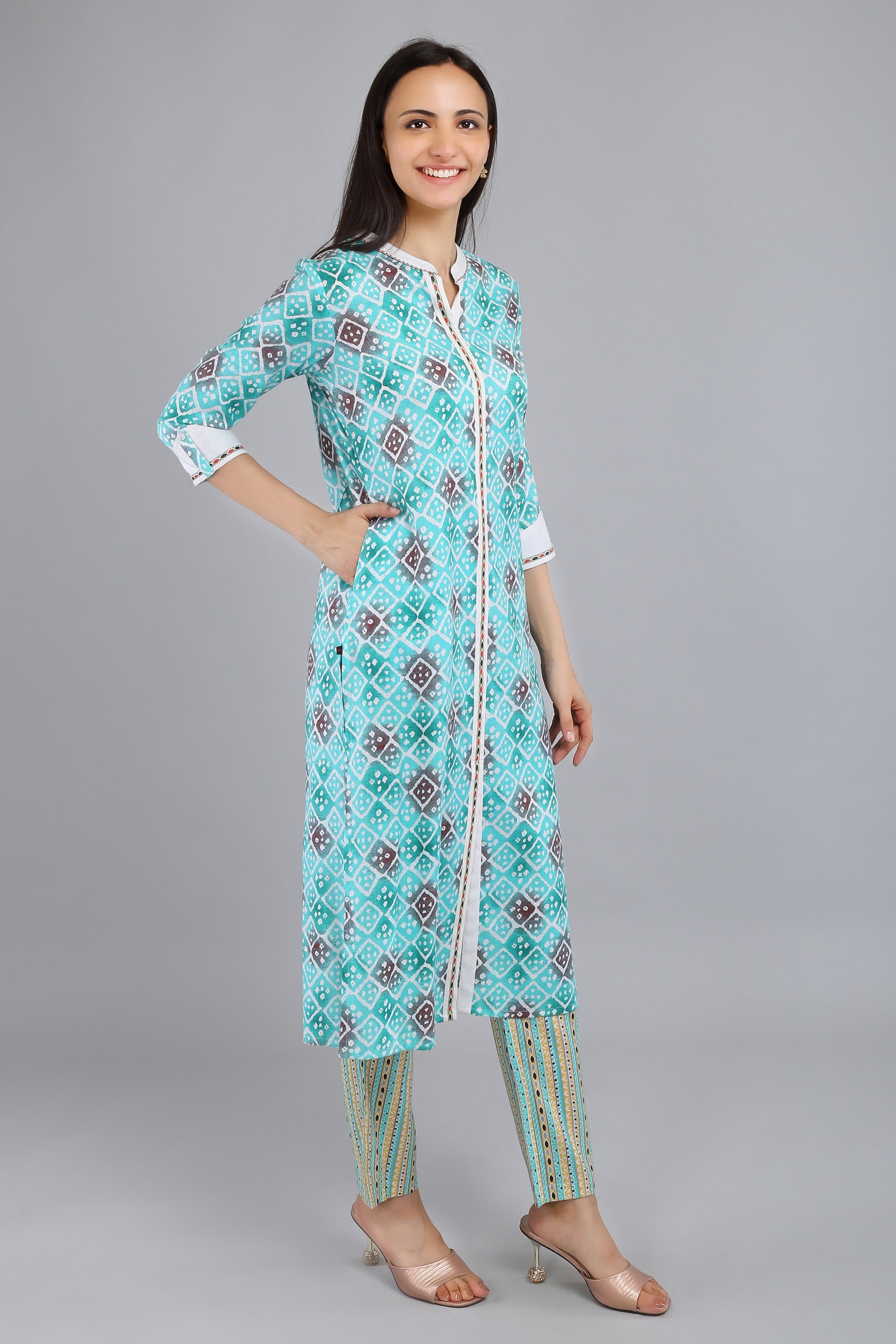VAPPS Printed Cotton Kurta and Pant Set - Green