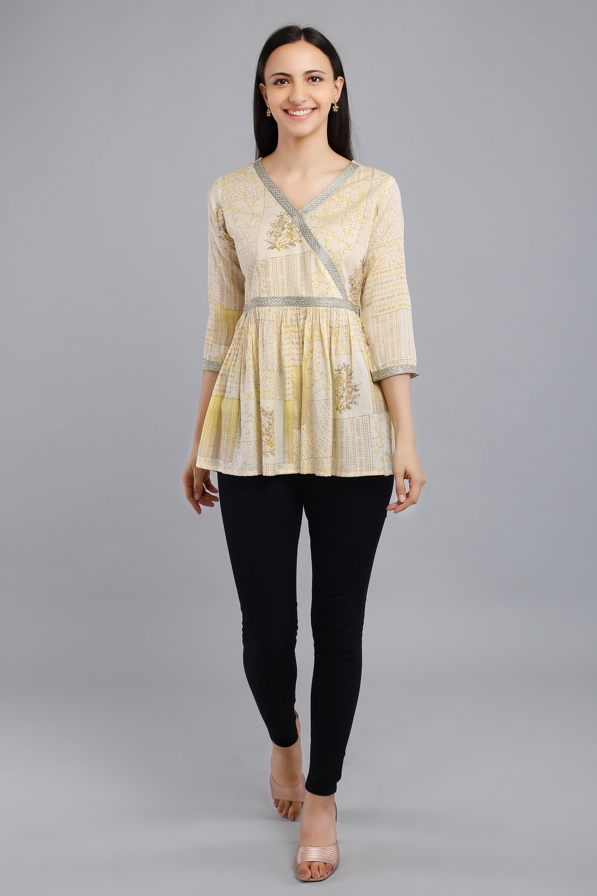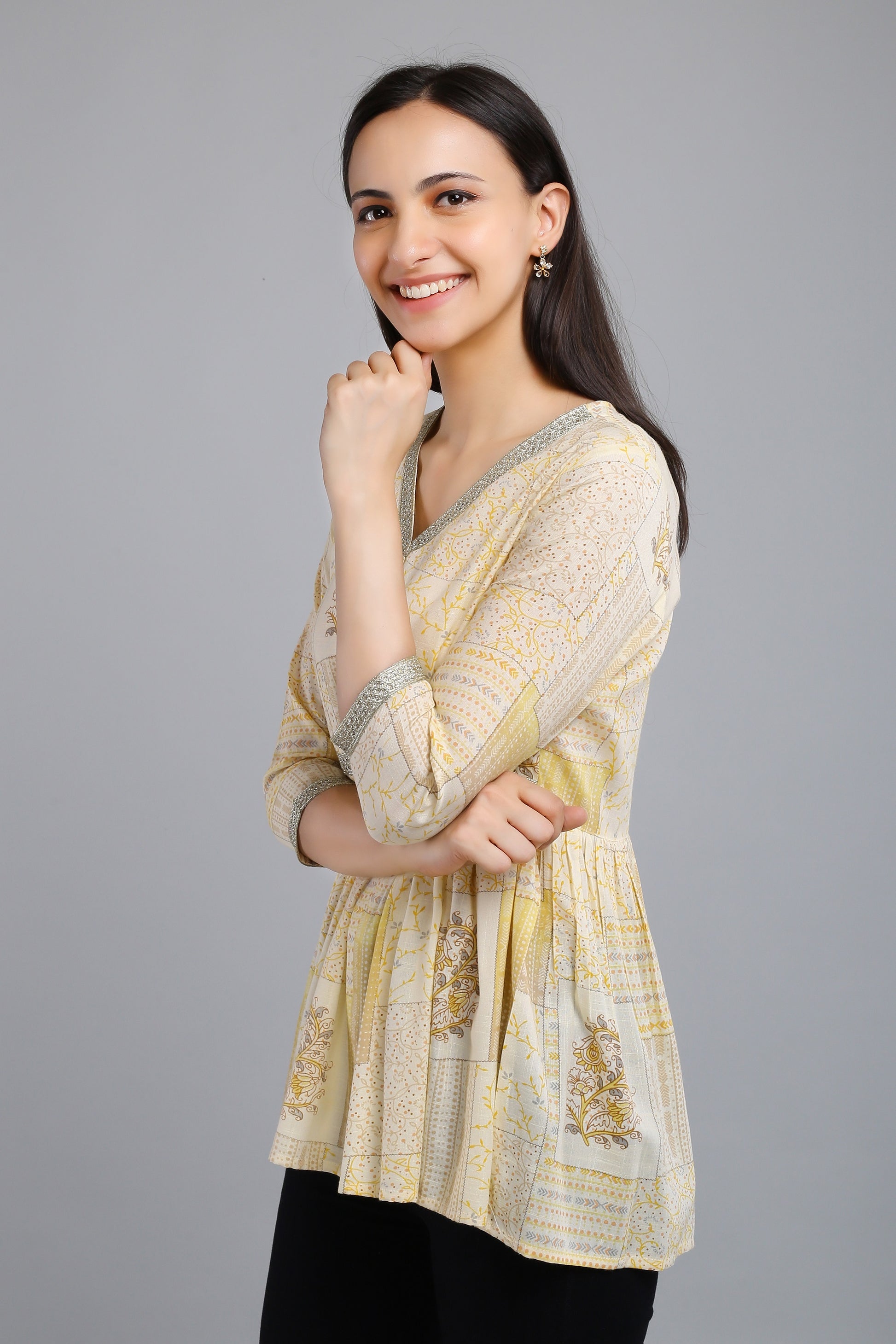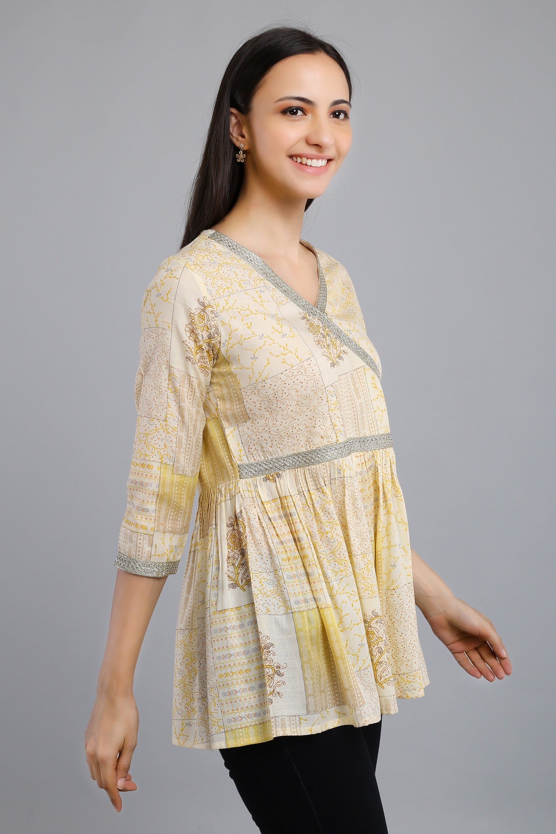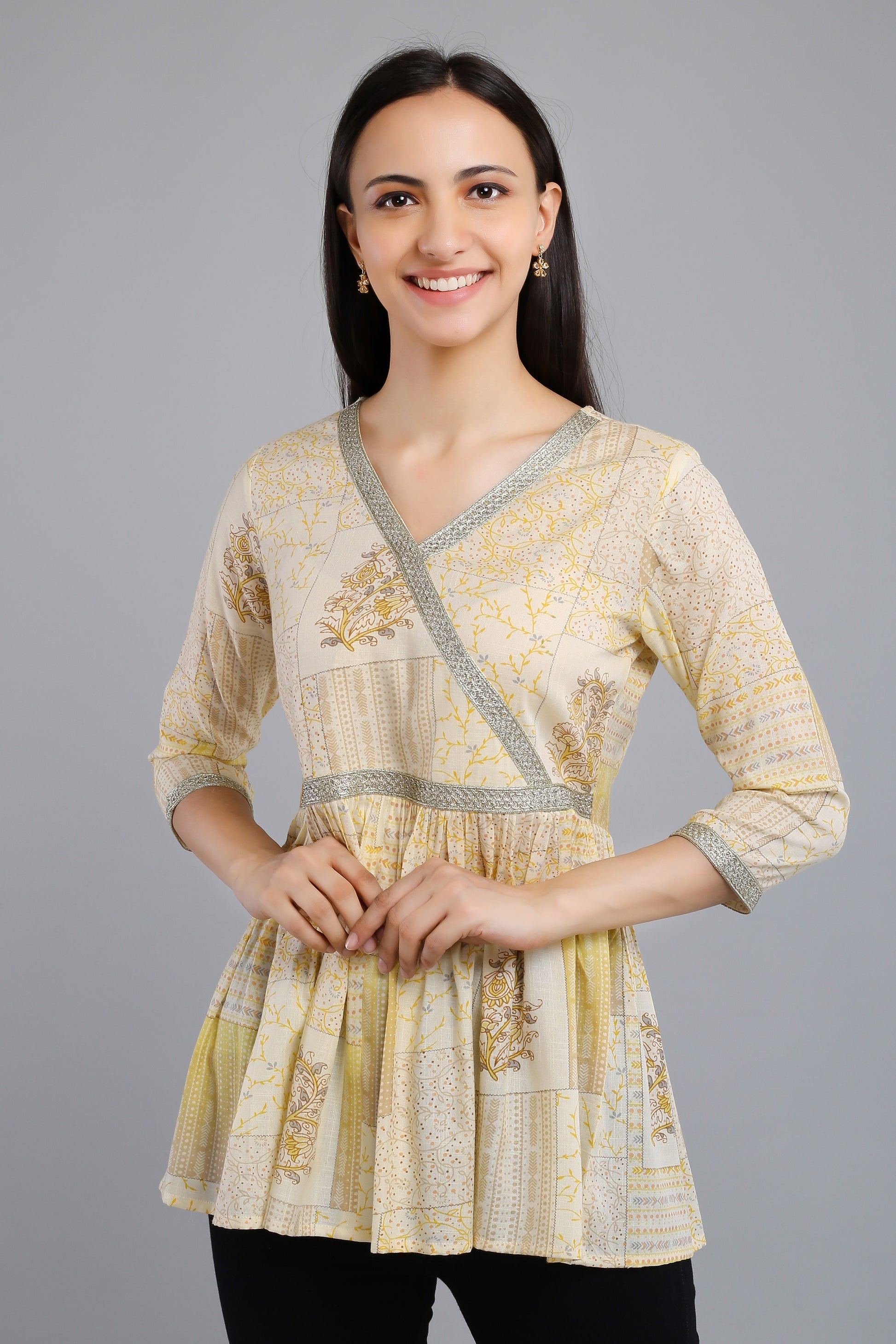 VAPPS Printed Cotton Angrakha Style Flared Tunic - Yellow