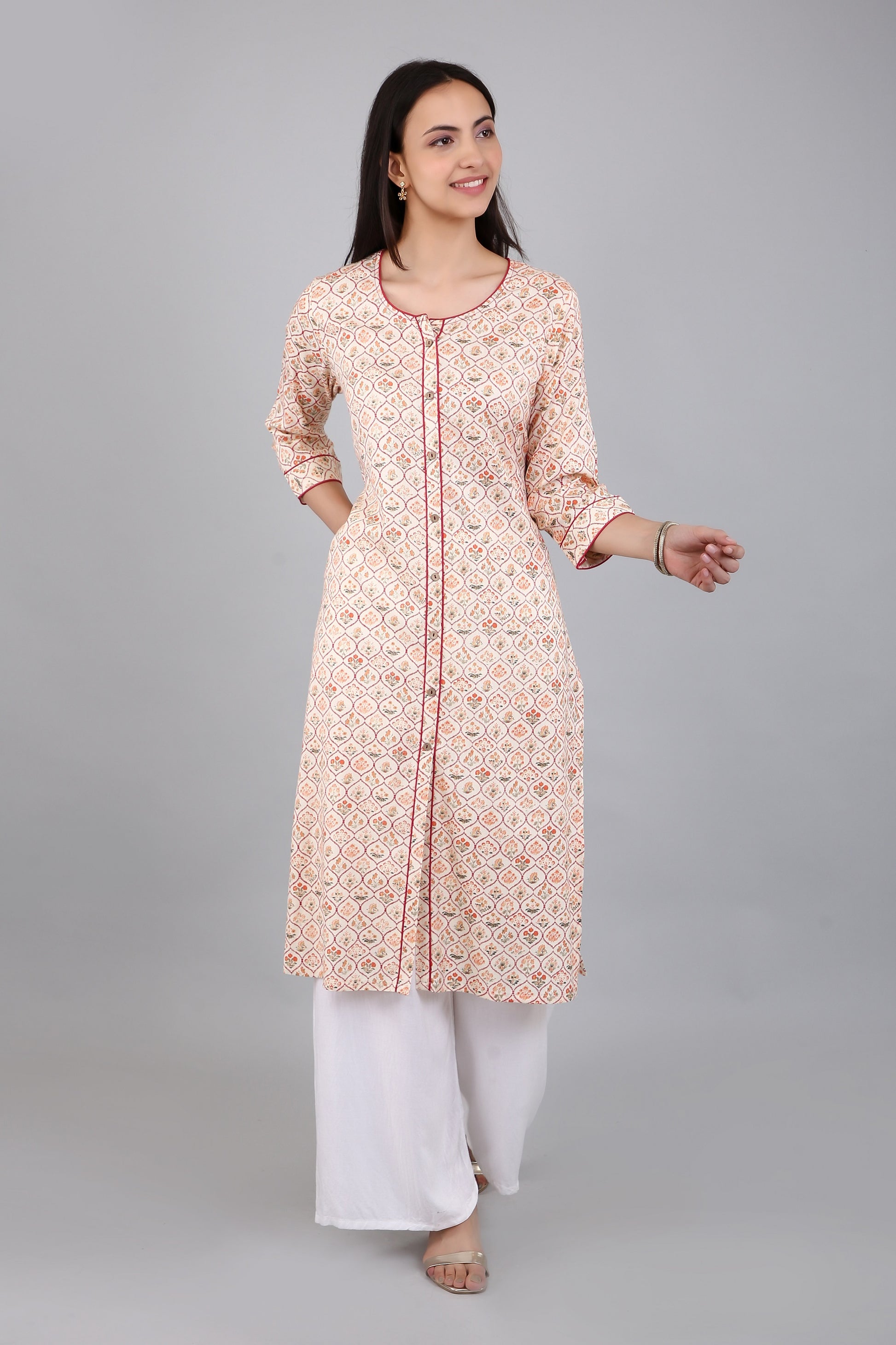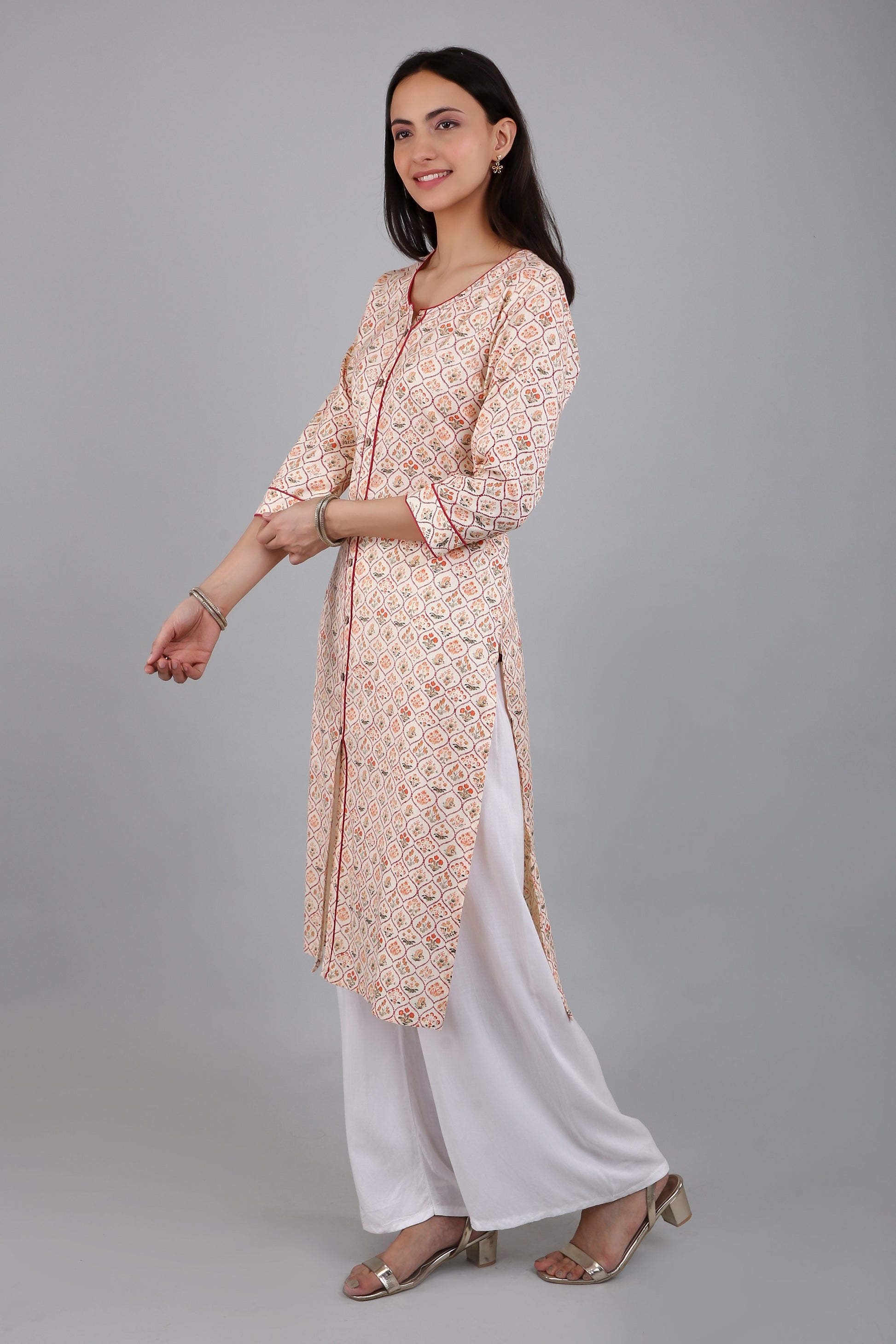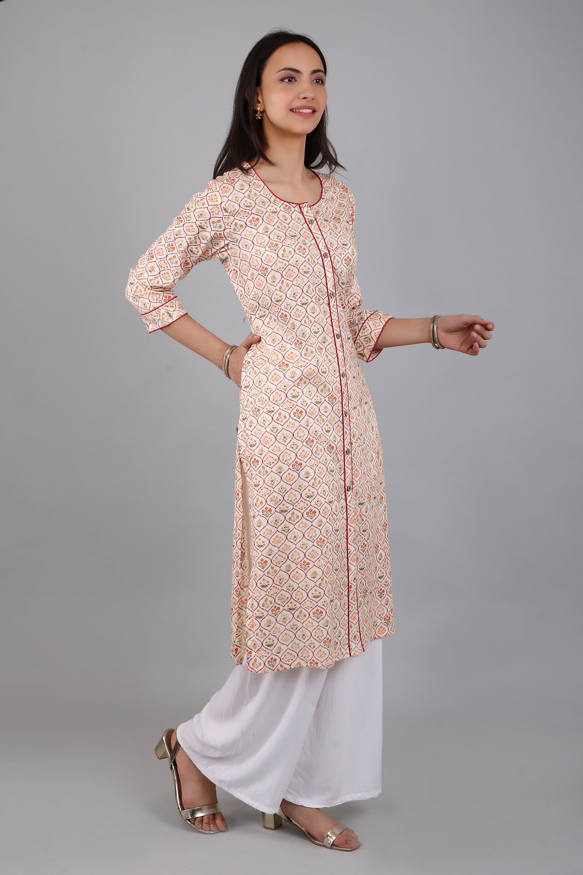 The A-line silhouette of the kurta flares out gracefully from the waist, providing a comfortable fit for all body types. The side slits add a touch of elegance and sophistication to the kurta, while also allowing for ease of movement.
