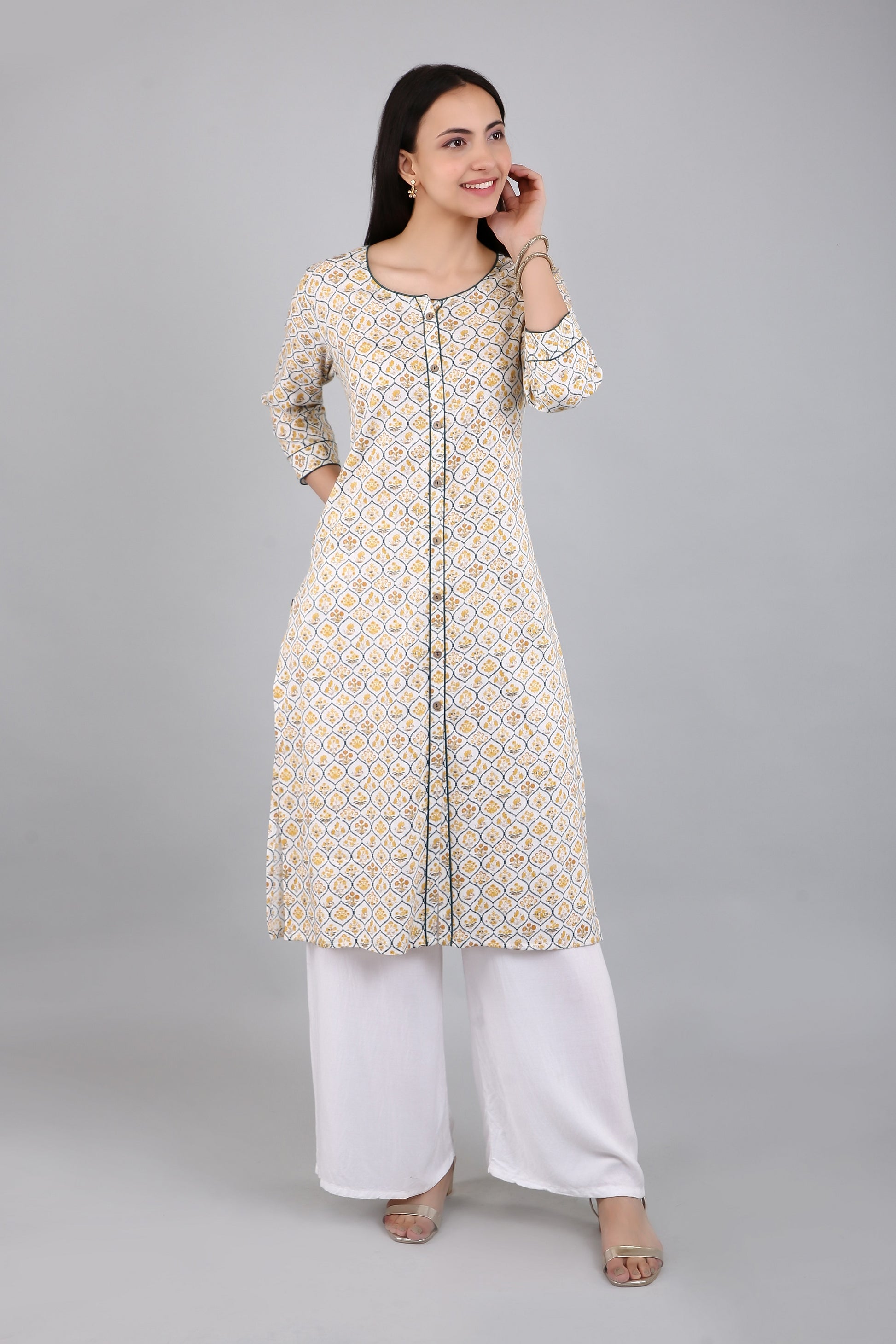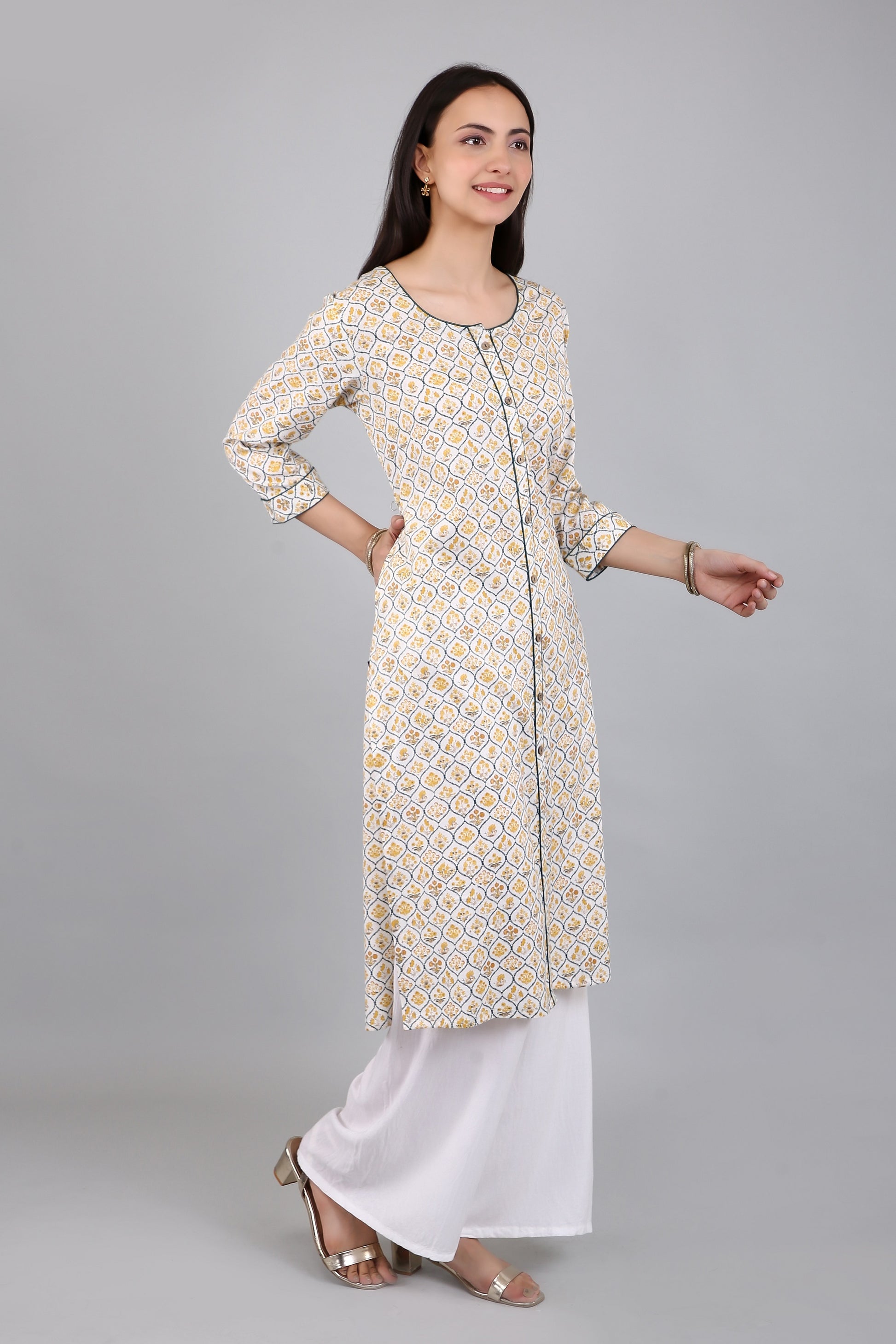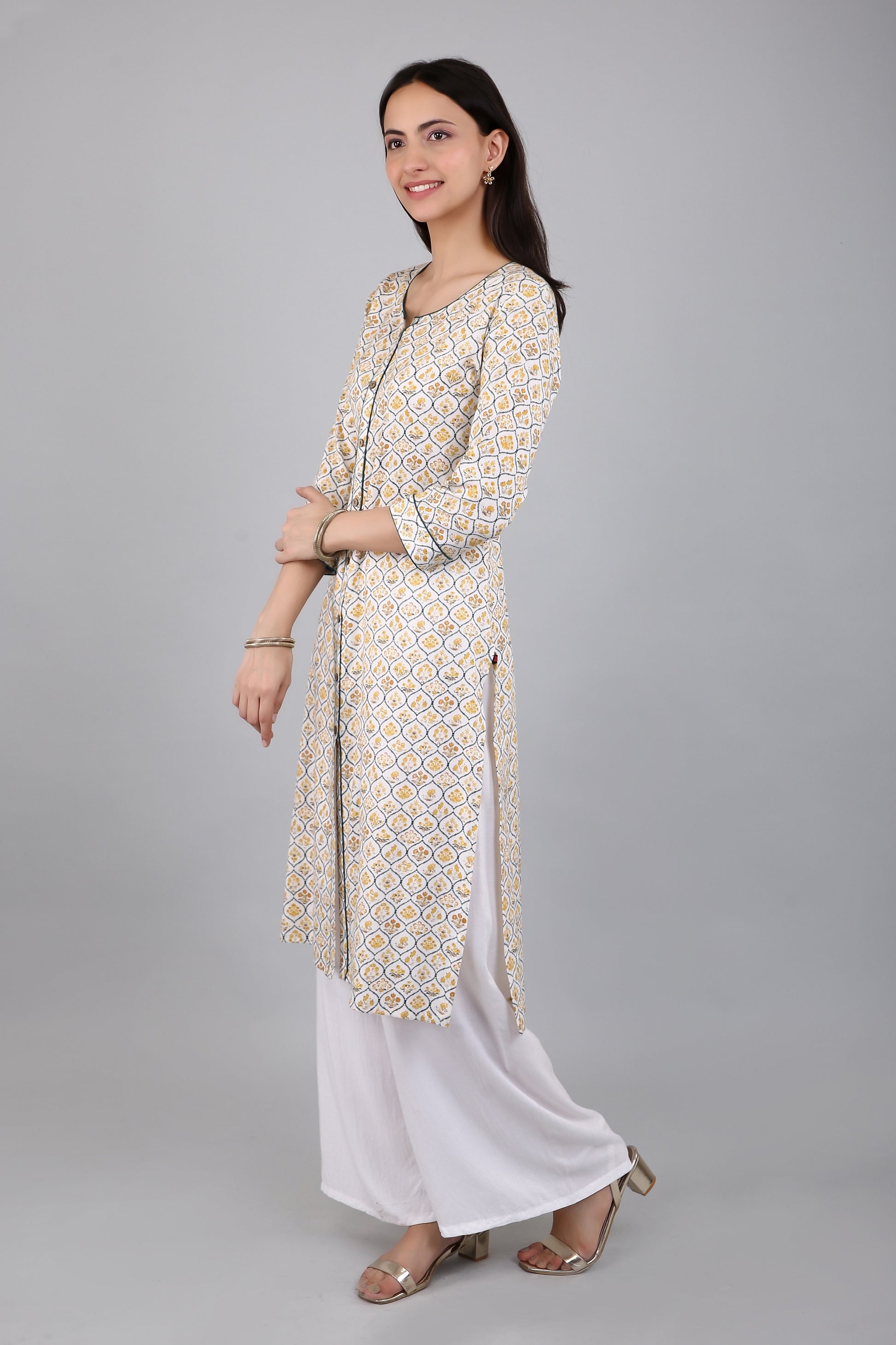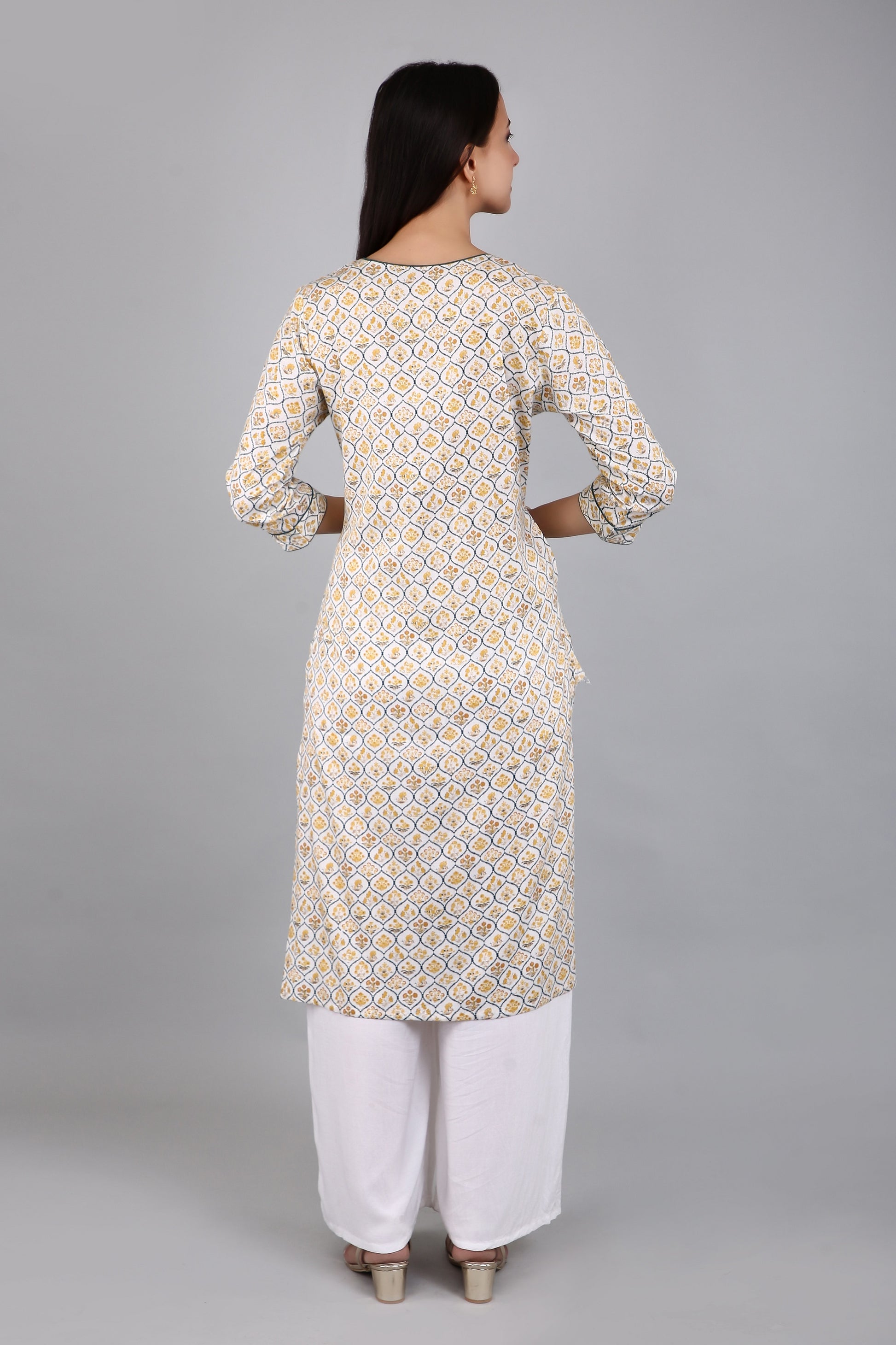 The A-line silhouette of the kurta flares out gracefully from the waist, providing a comfortable fit for all body types. The side slits add a touch of elegance and sophistication to the kurta, while also allowing for ease of movement.