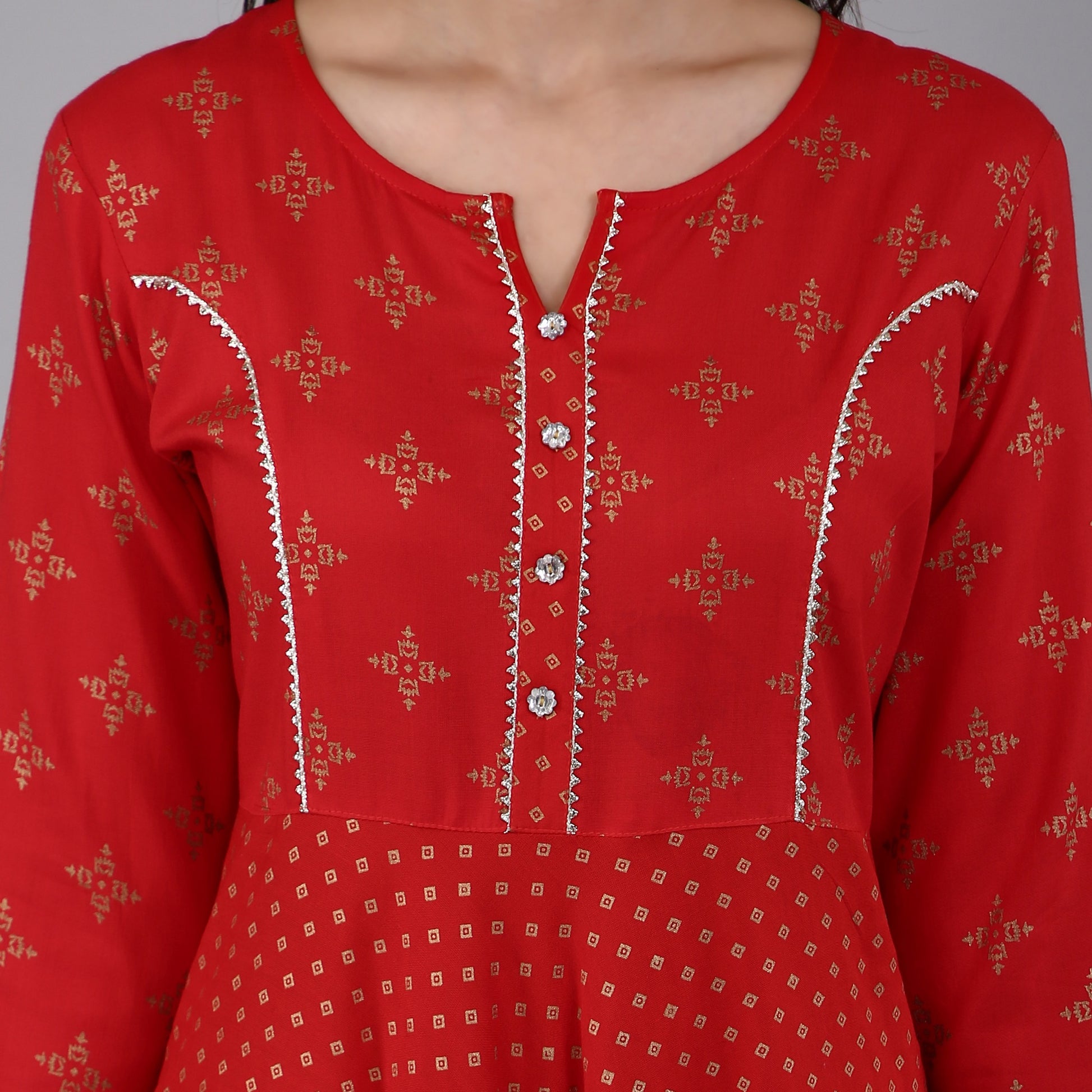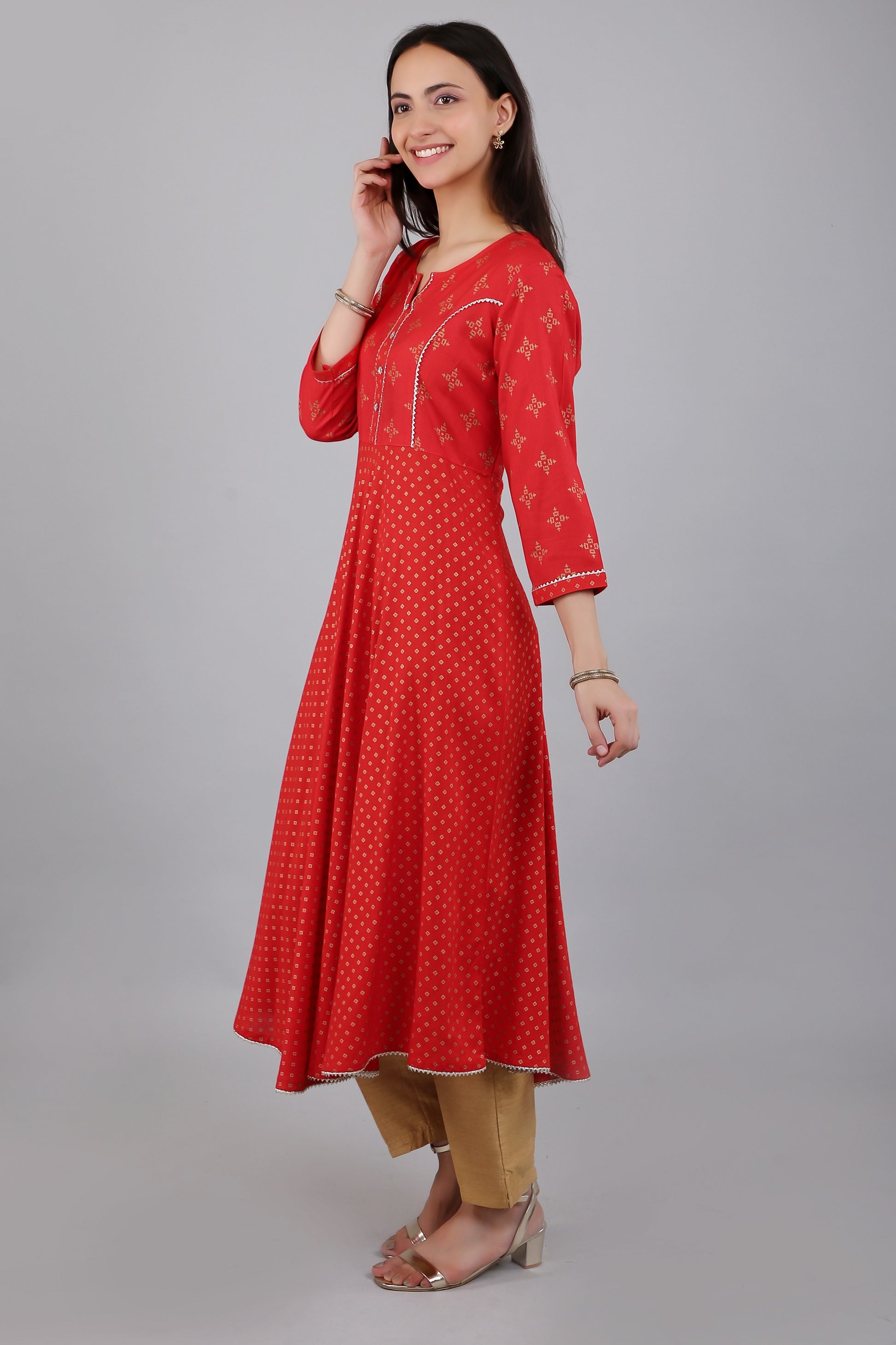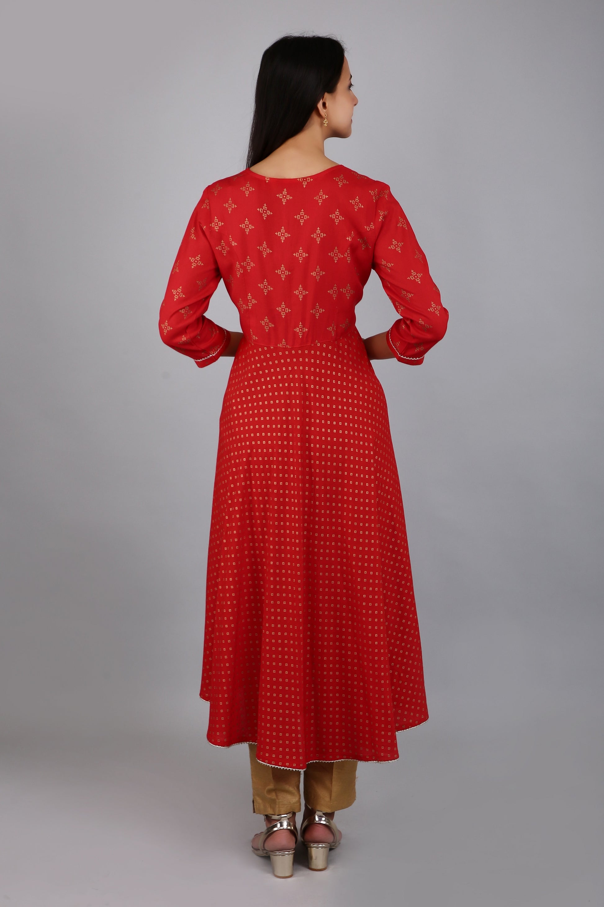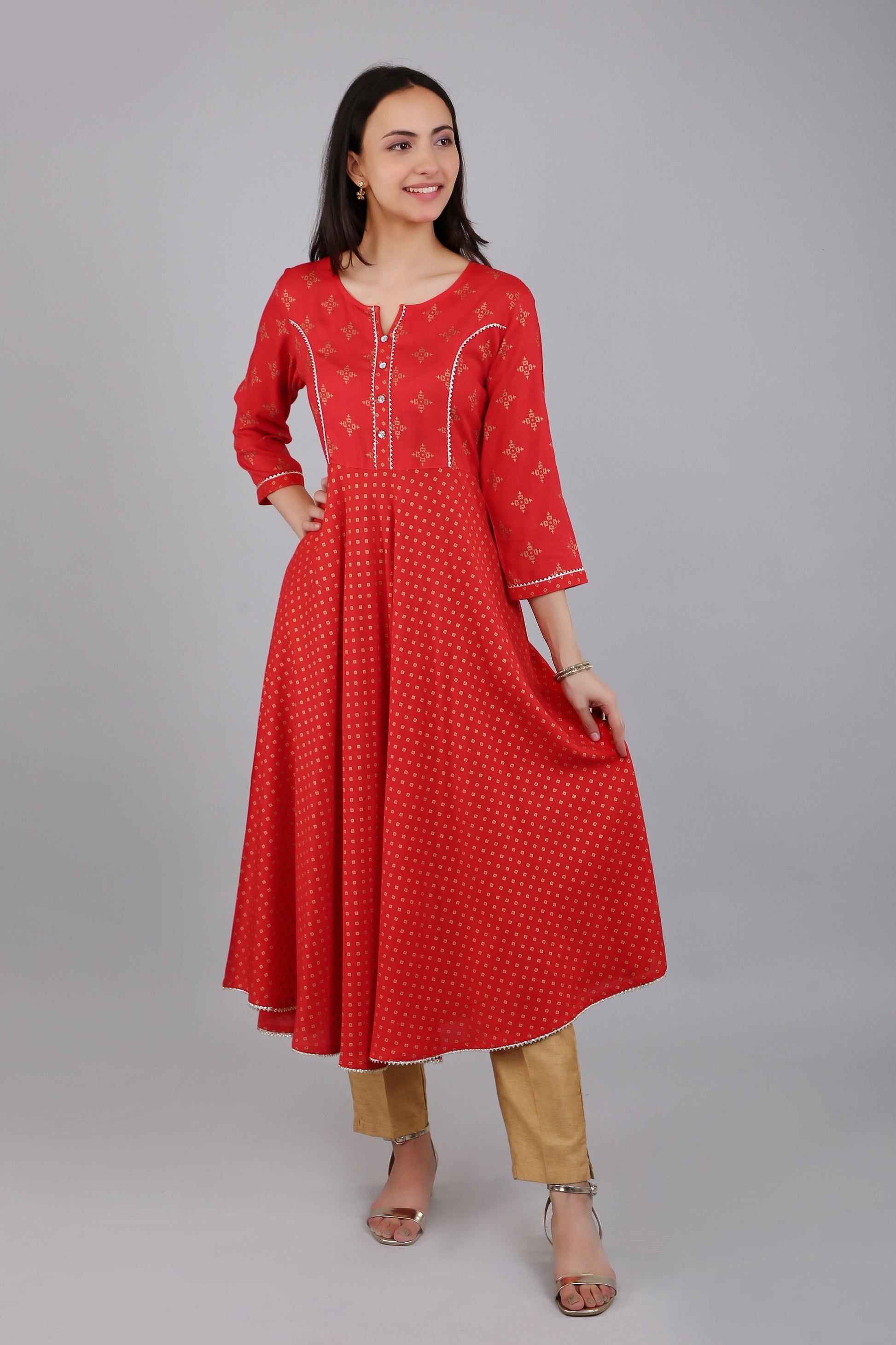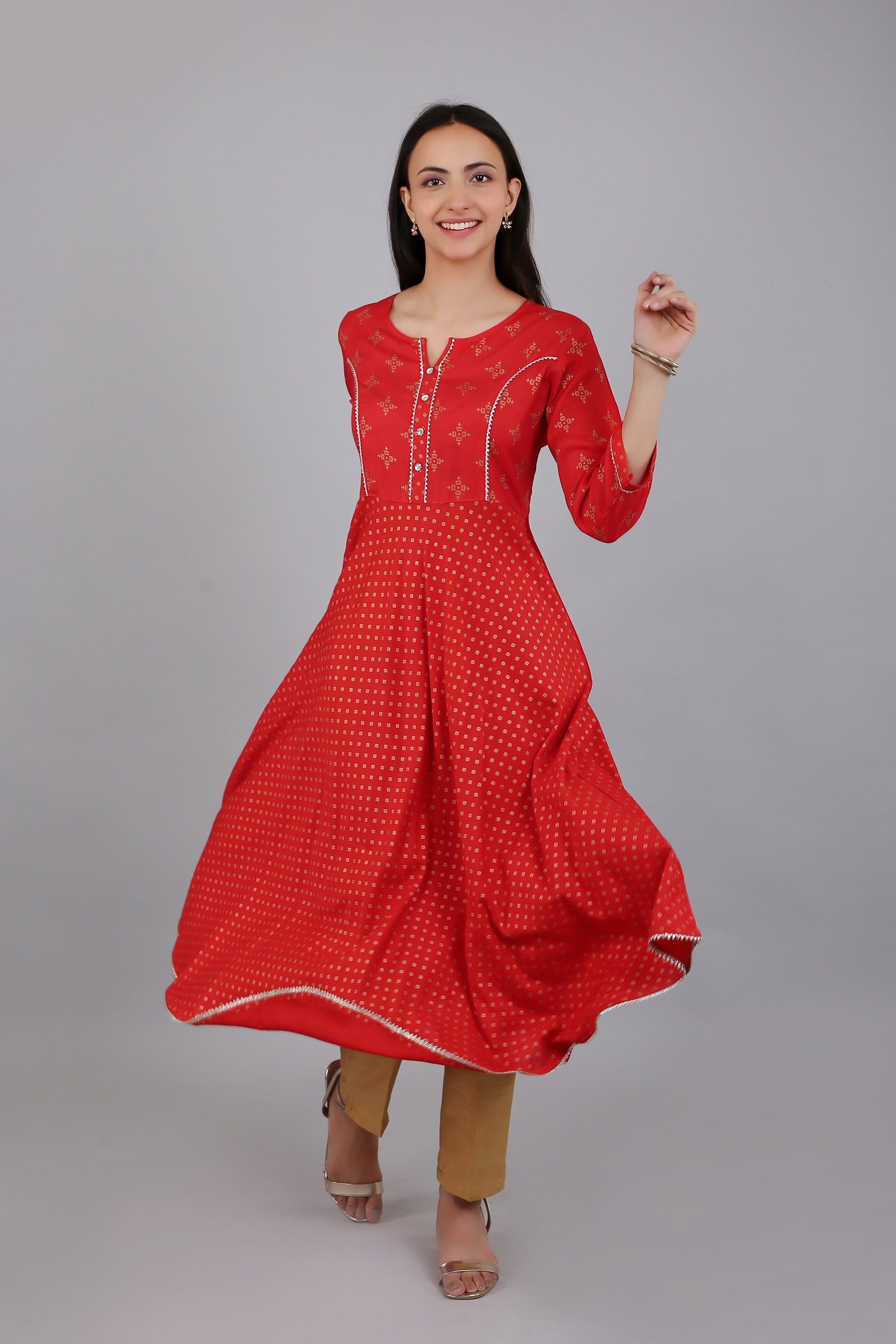 VAPPS Rayon Anarkali Style Printed Kurta for Women and Girls - Red