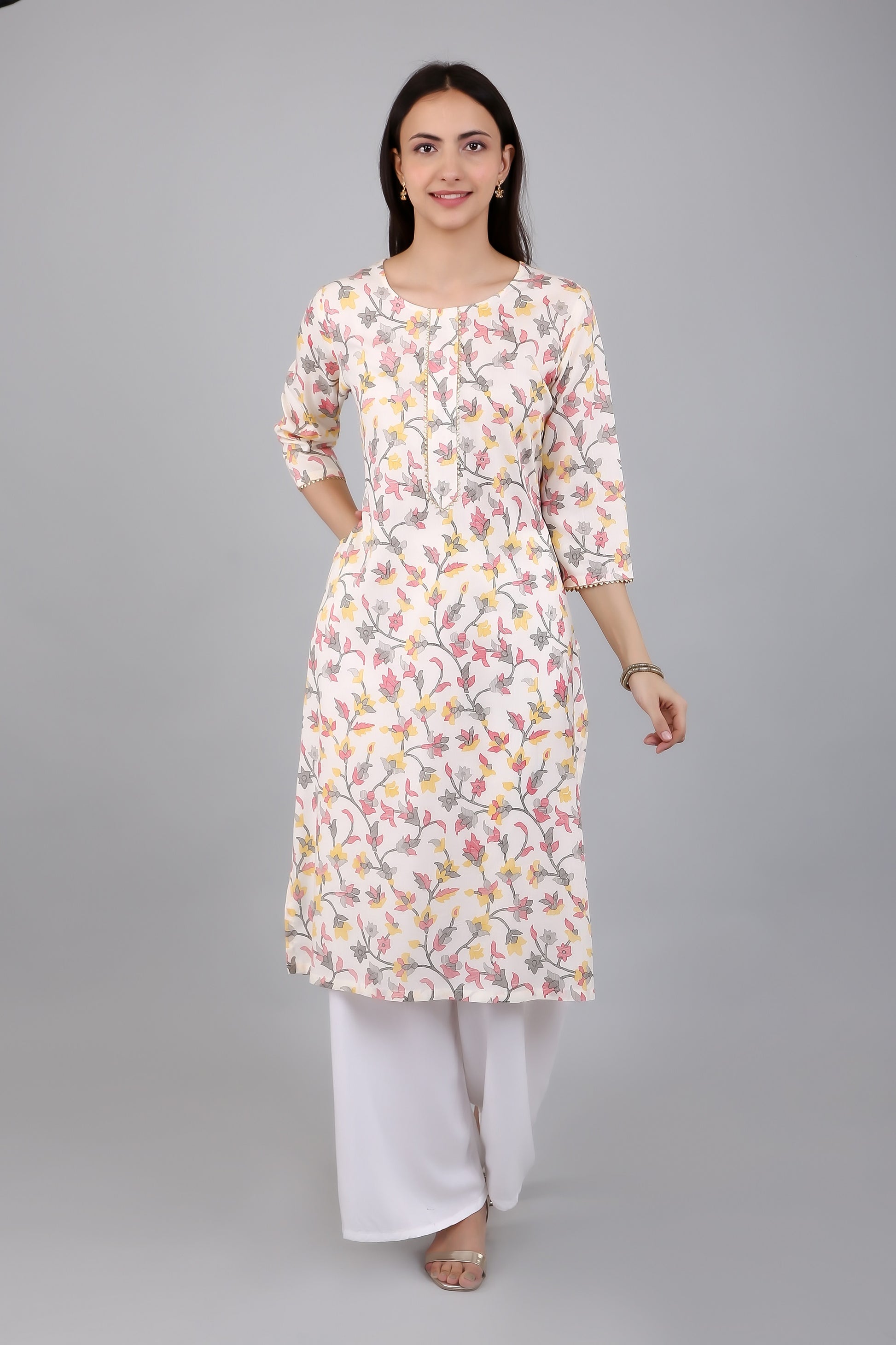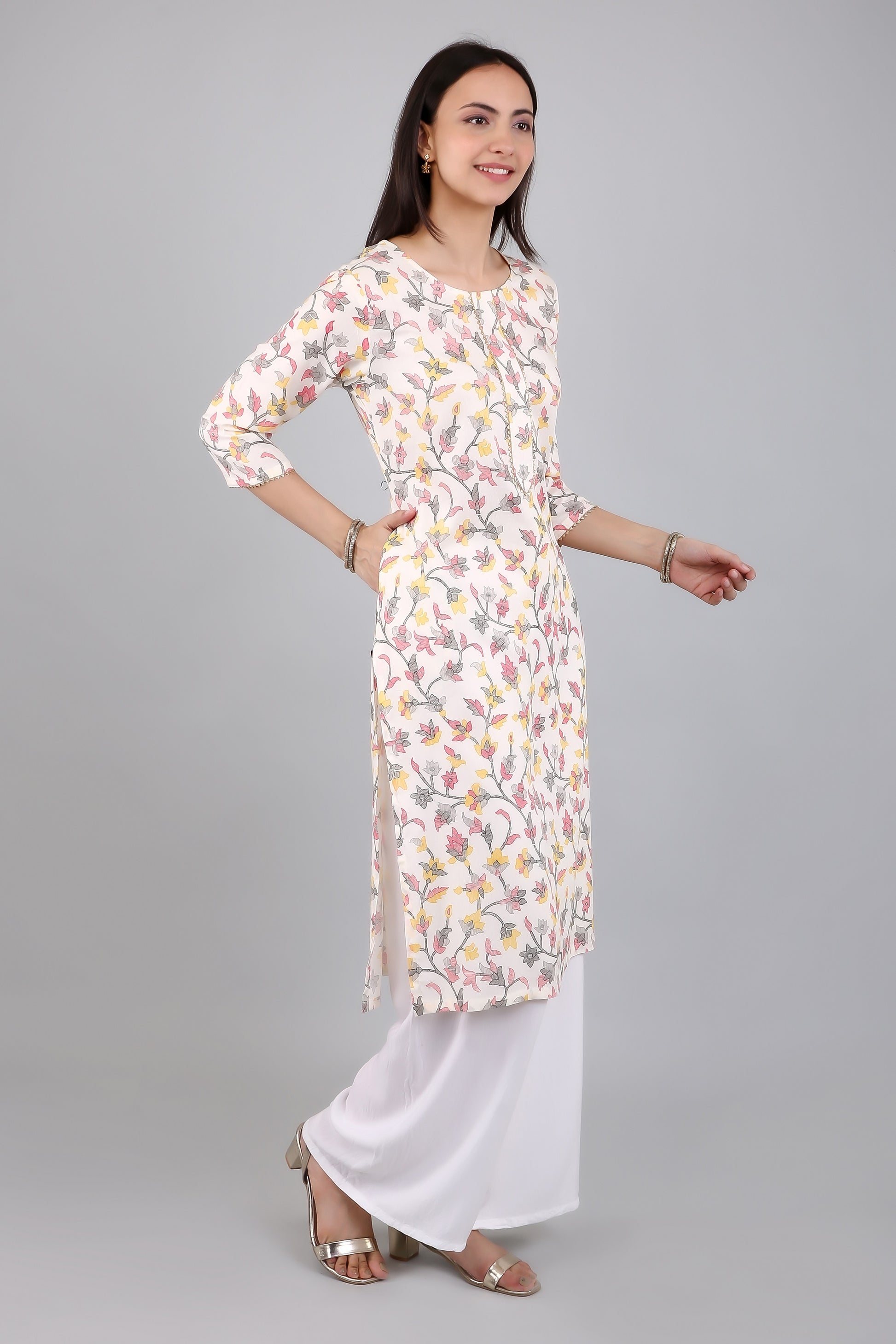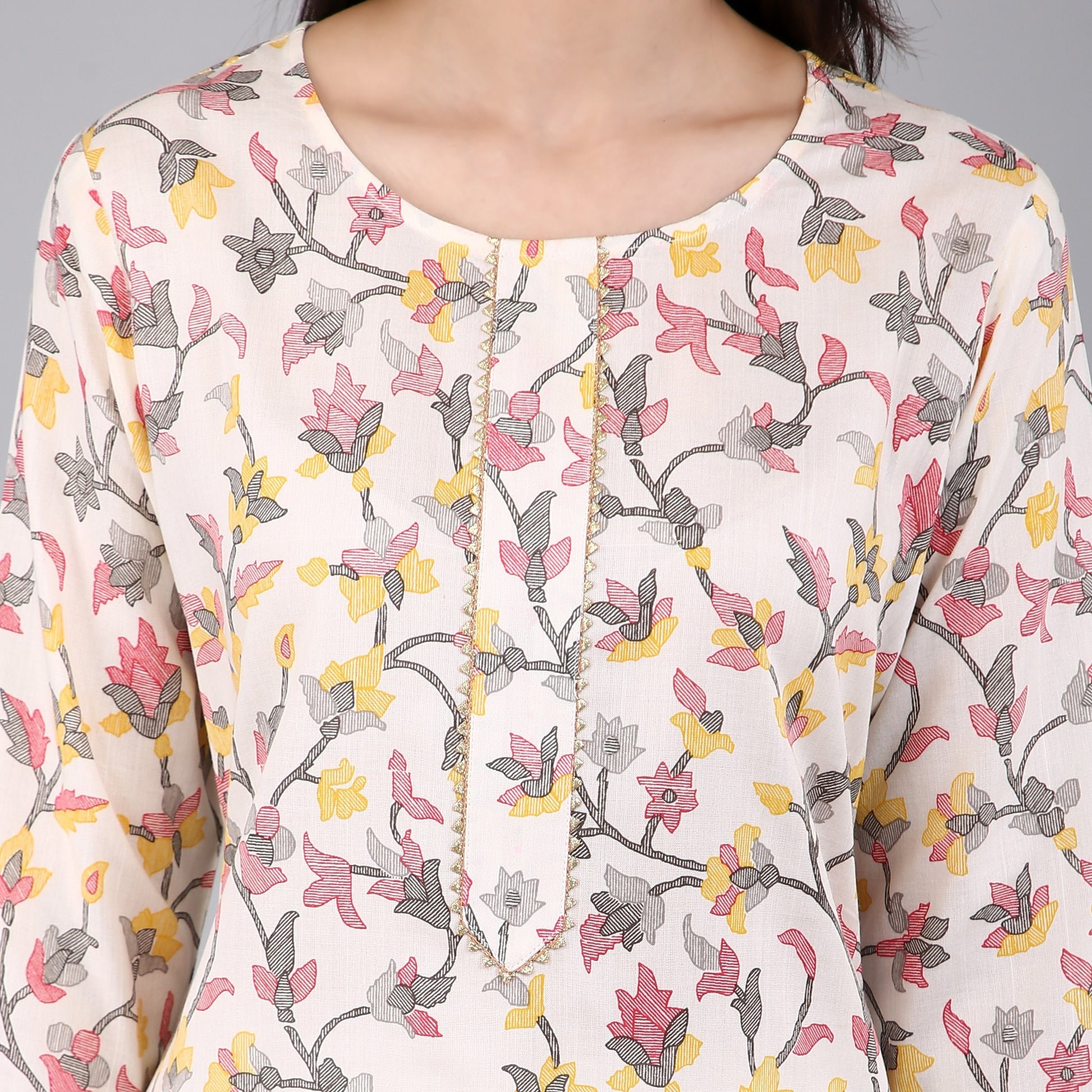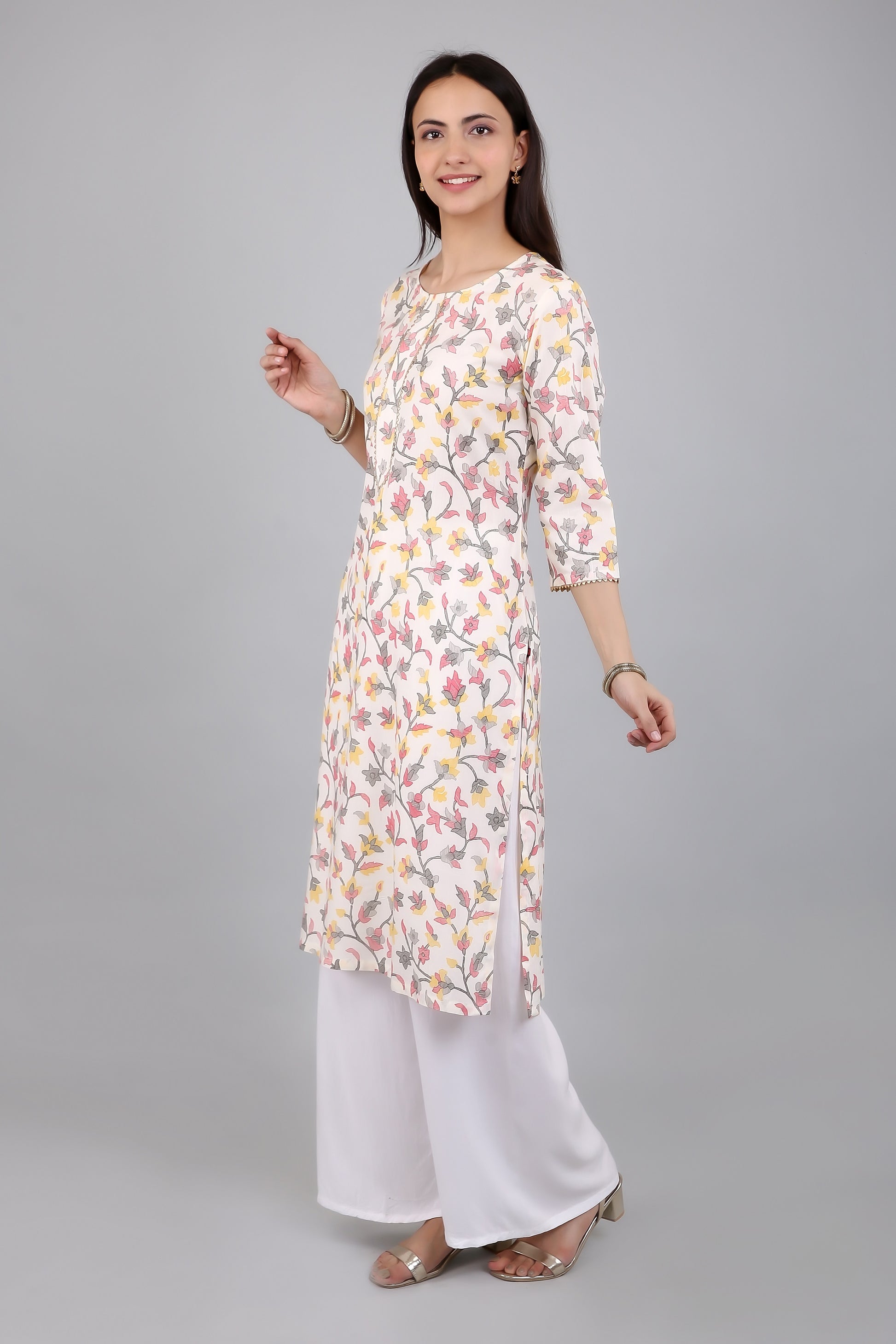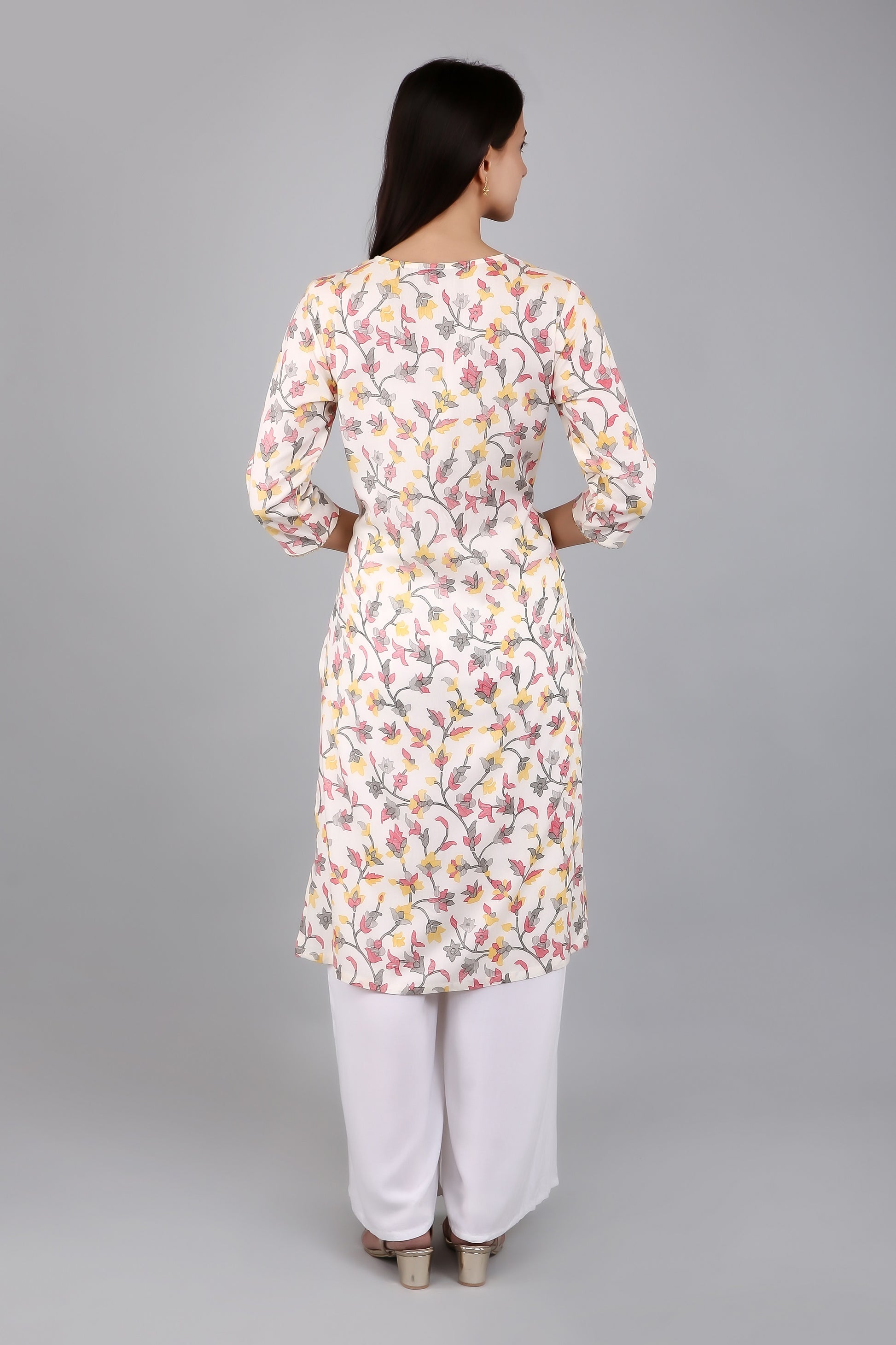 The floral print is intricately designed and printed onto the fabric, ensuring that the colors will not fade or bleed, even after multiple washes. The kurti is versatile and can be dressed up or down, making it perfect for any occasion.
