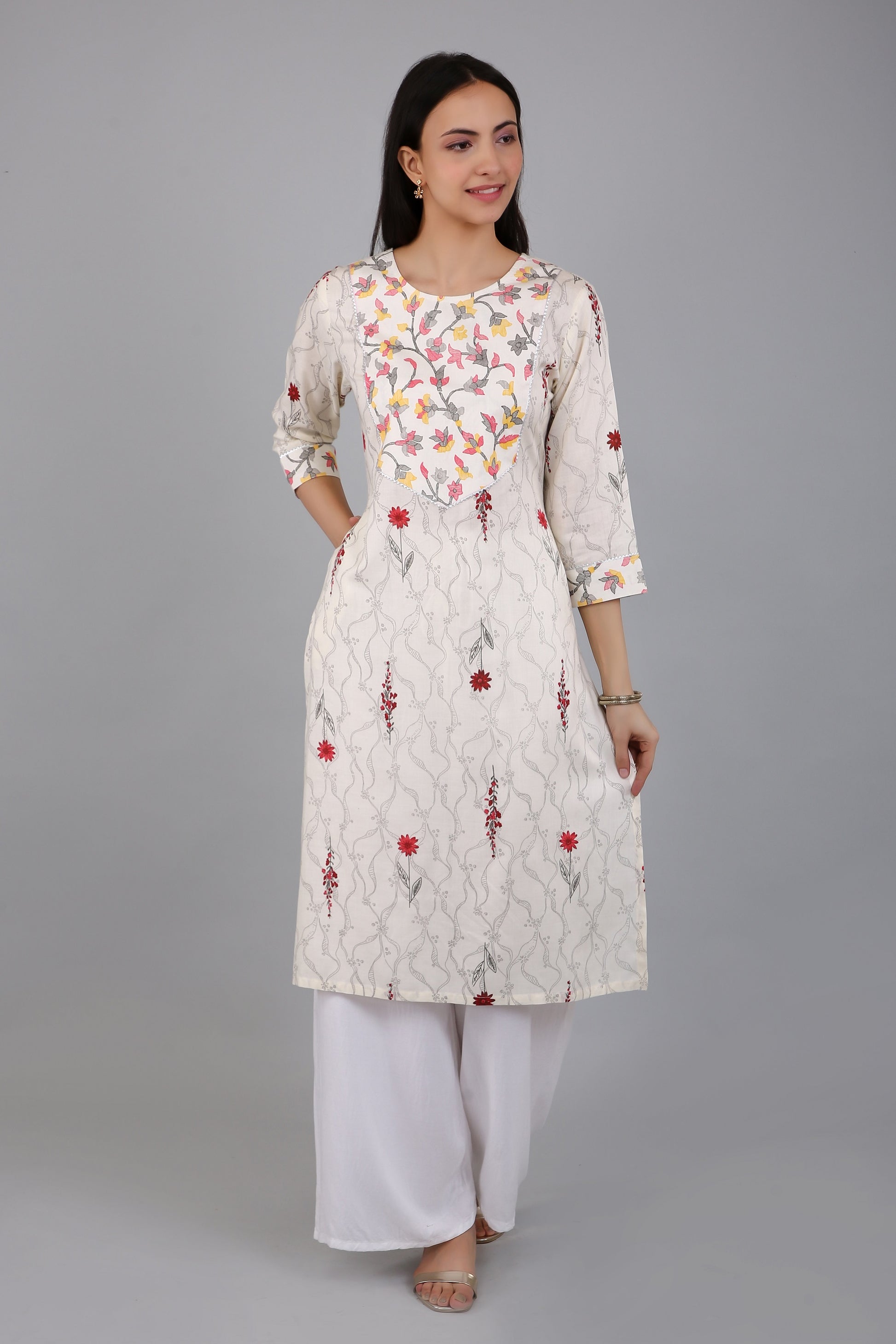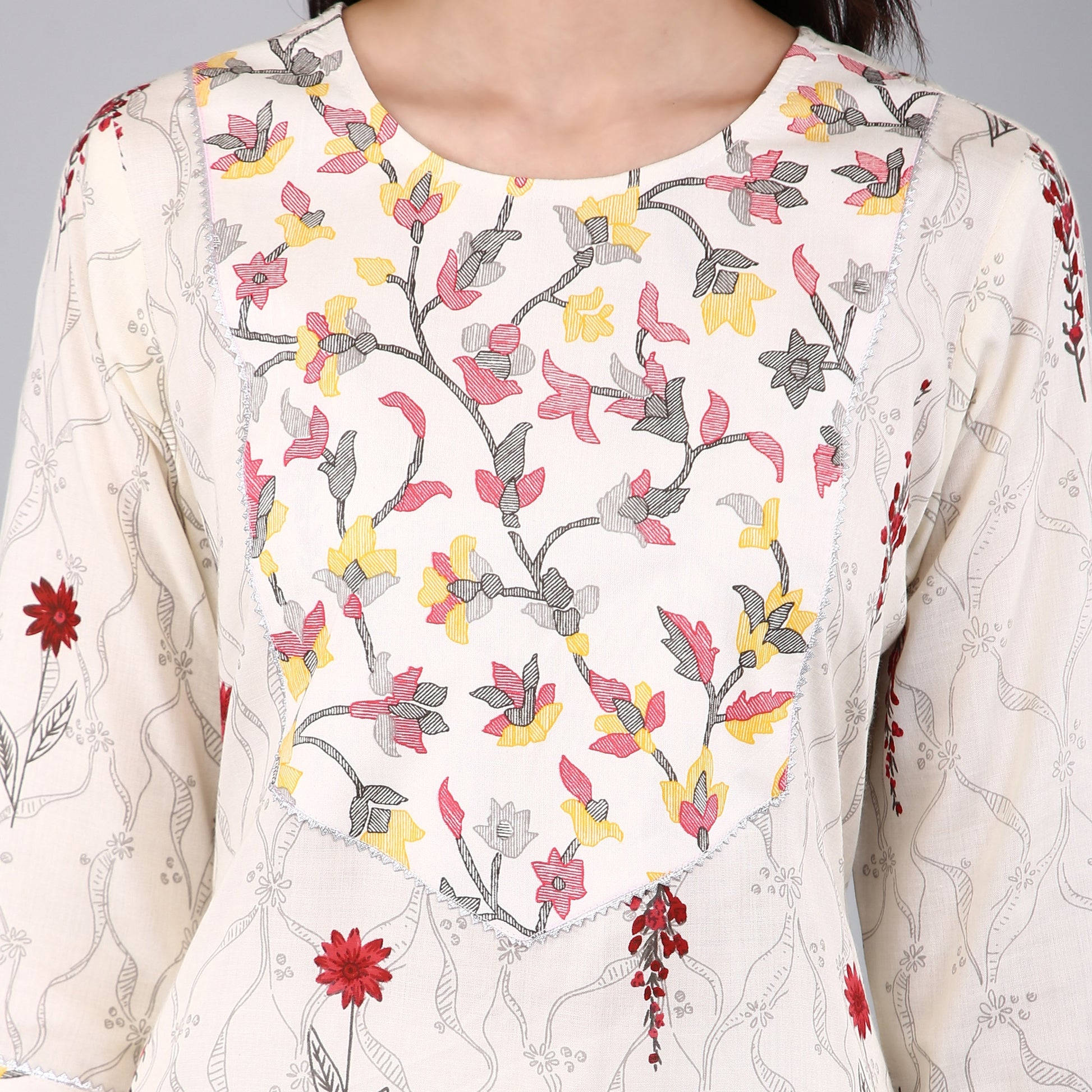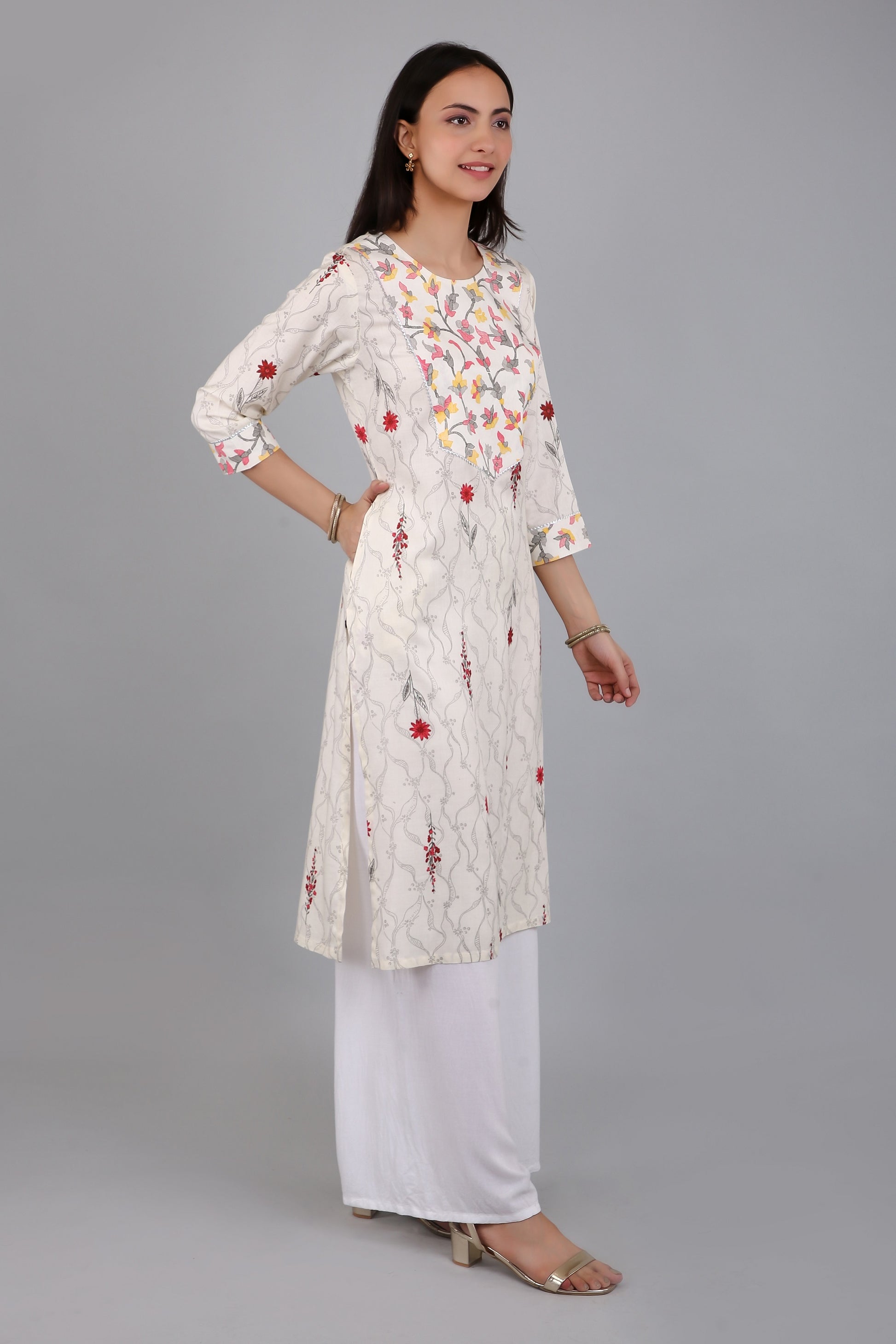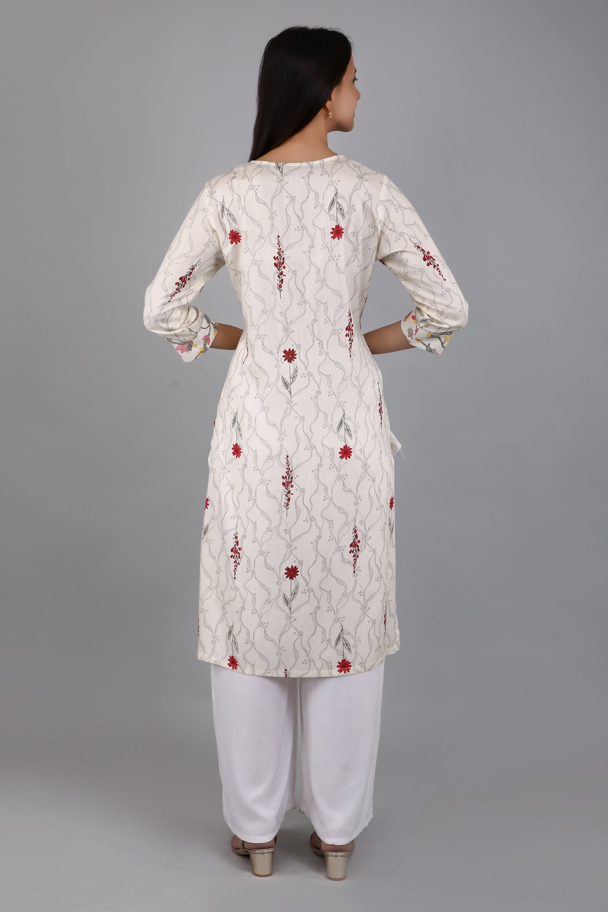 The floral print is intricately designed and printed onto the fabric, ensuring that the colors will not fade or bleed, even after multiple washes. The kurti is versatile and can be dressed up or down, making it perfect for any occasion.