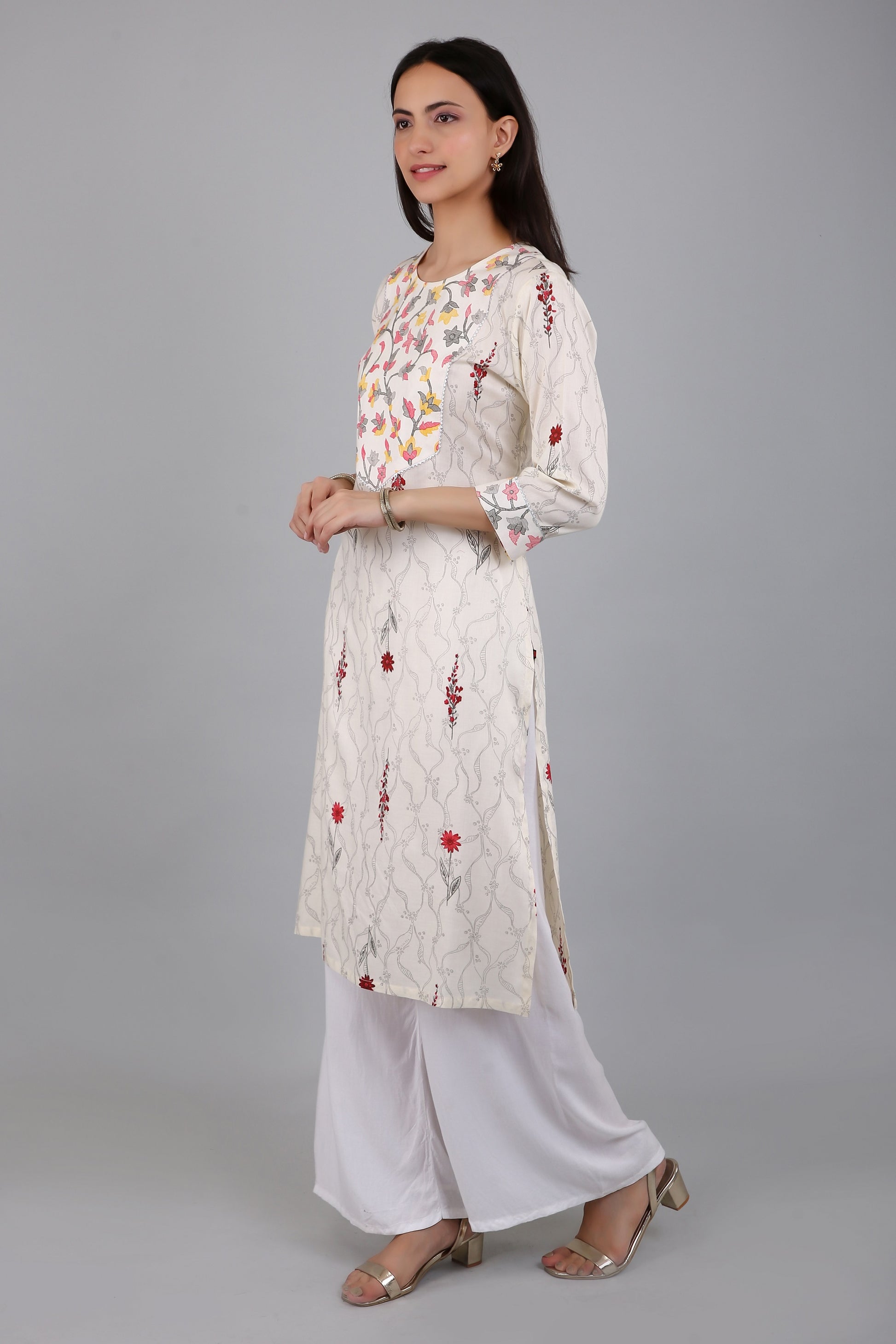 The A-line silhouette of the kurti flares out gracefully from the waist, providing a comfortable fit for all body types. The side slits add a touch of elegance and sophistication to the kurti, while also allowing for ease of movement.