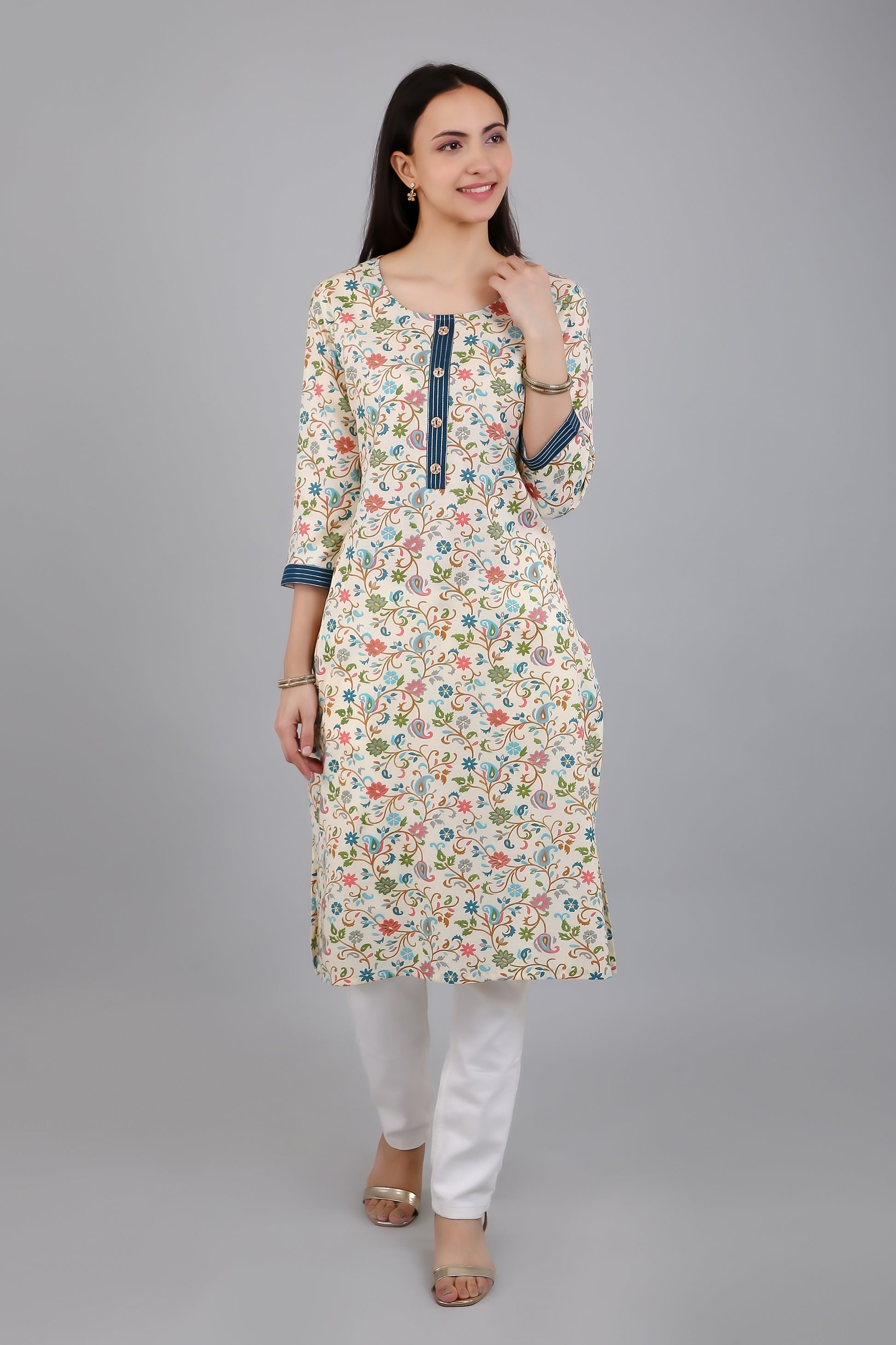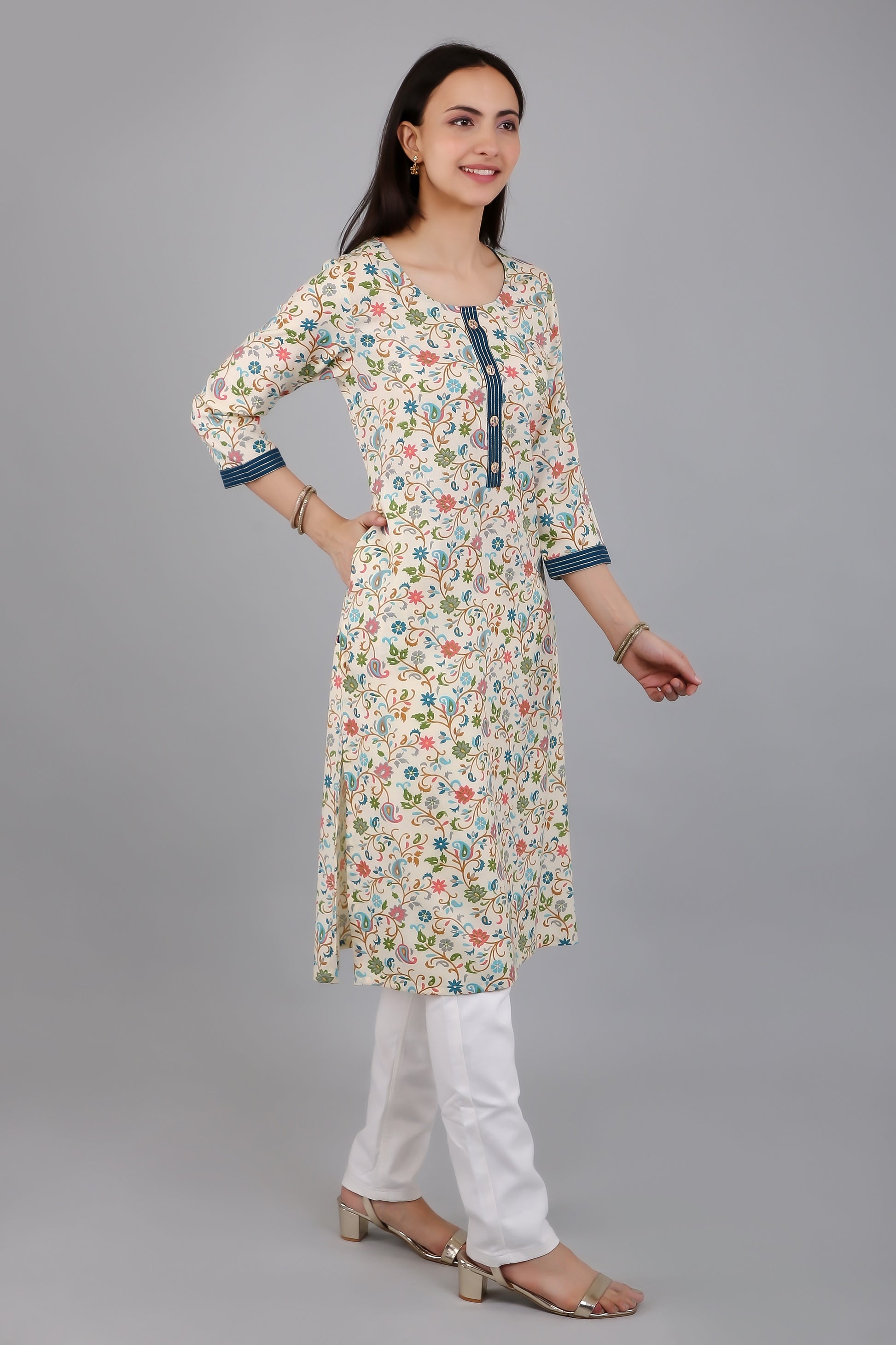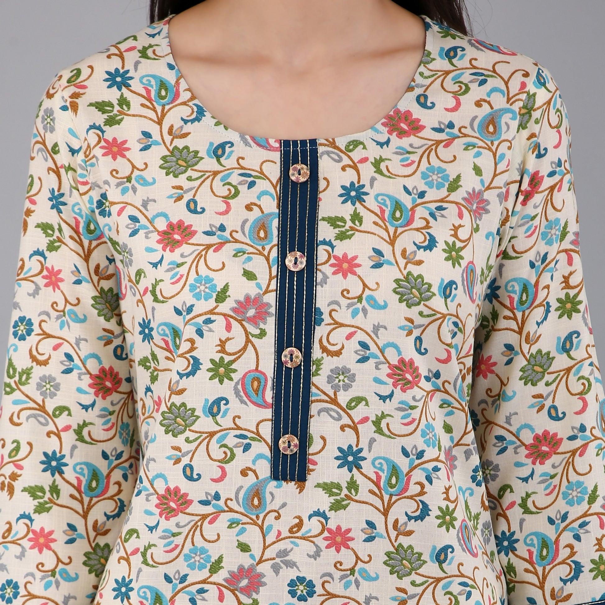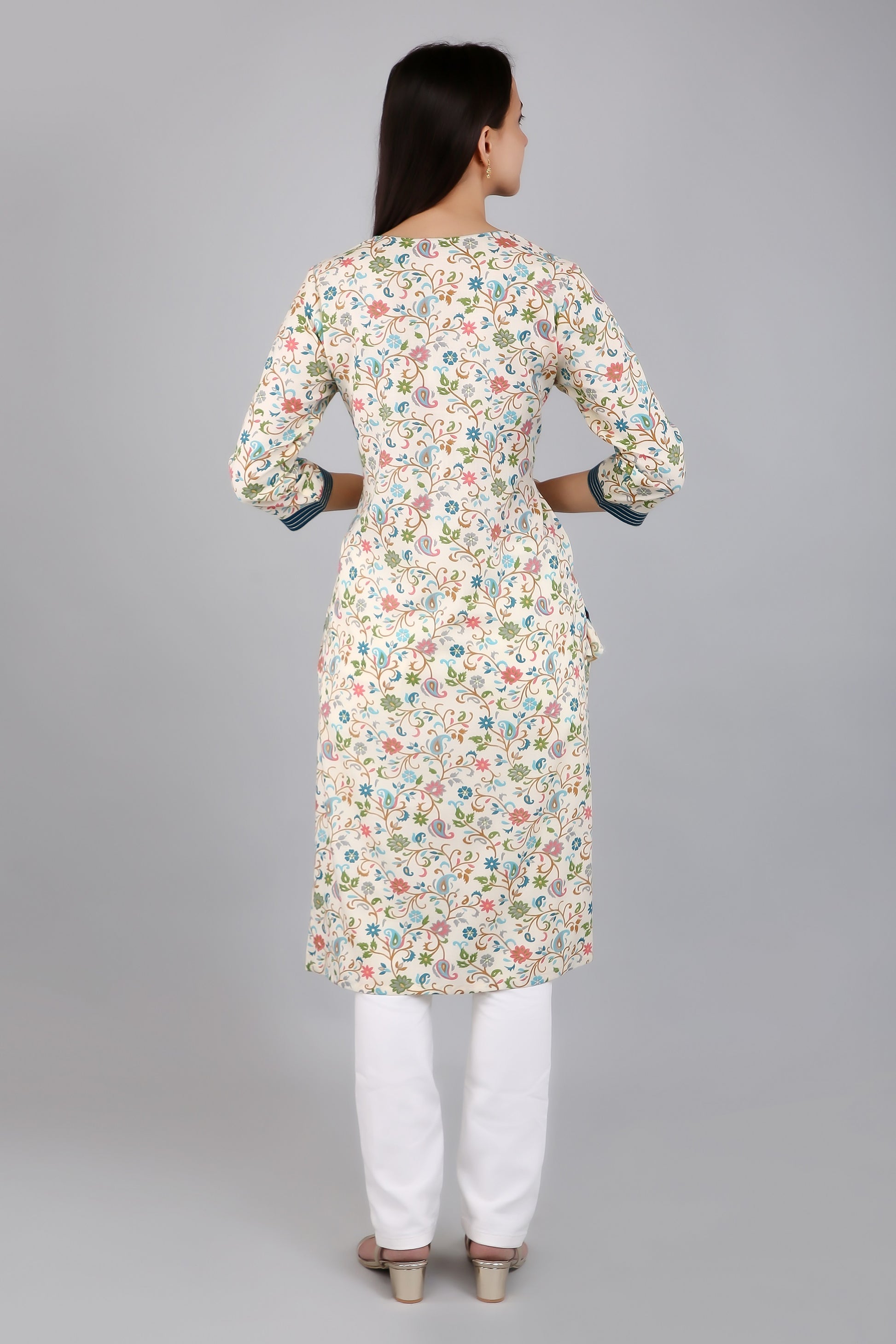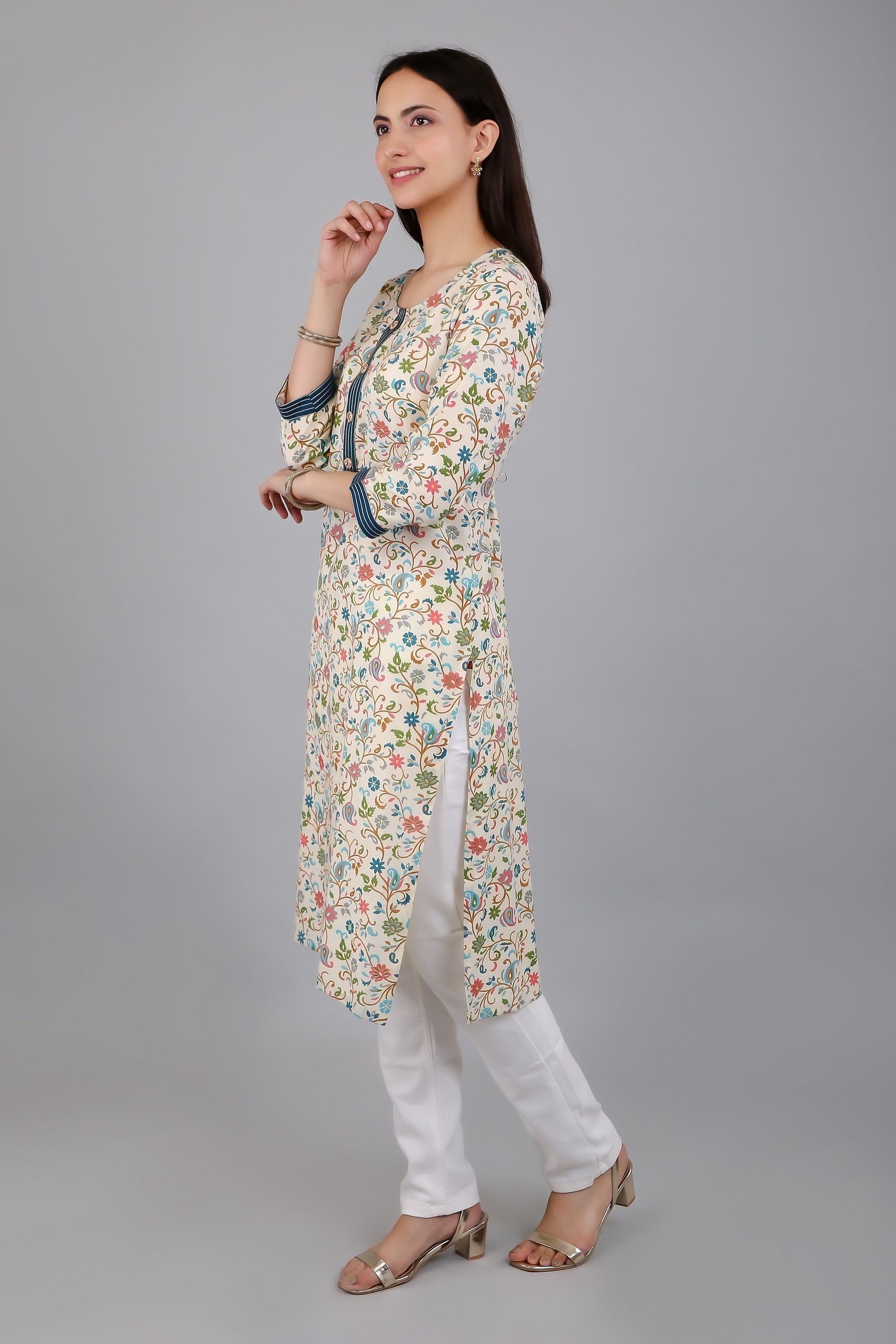 The floral print is intricately designed and printed onto the fabric, ensuring that the colors will not fade or bleed, even after multiple washes. The kurti is versatile and can be dressed up or down, making it perfect for any occasion.