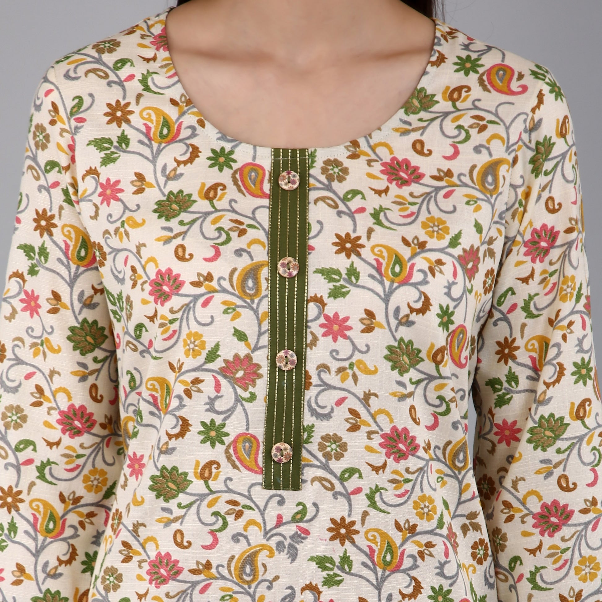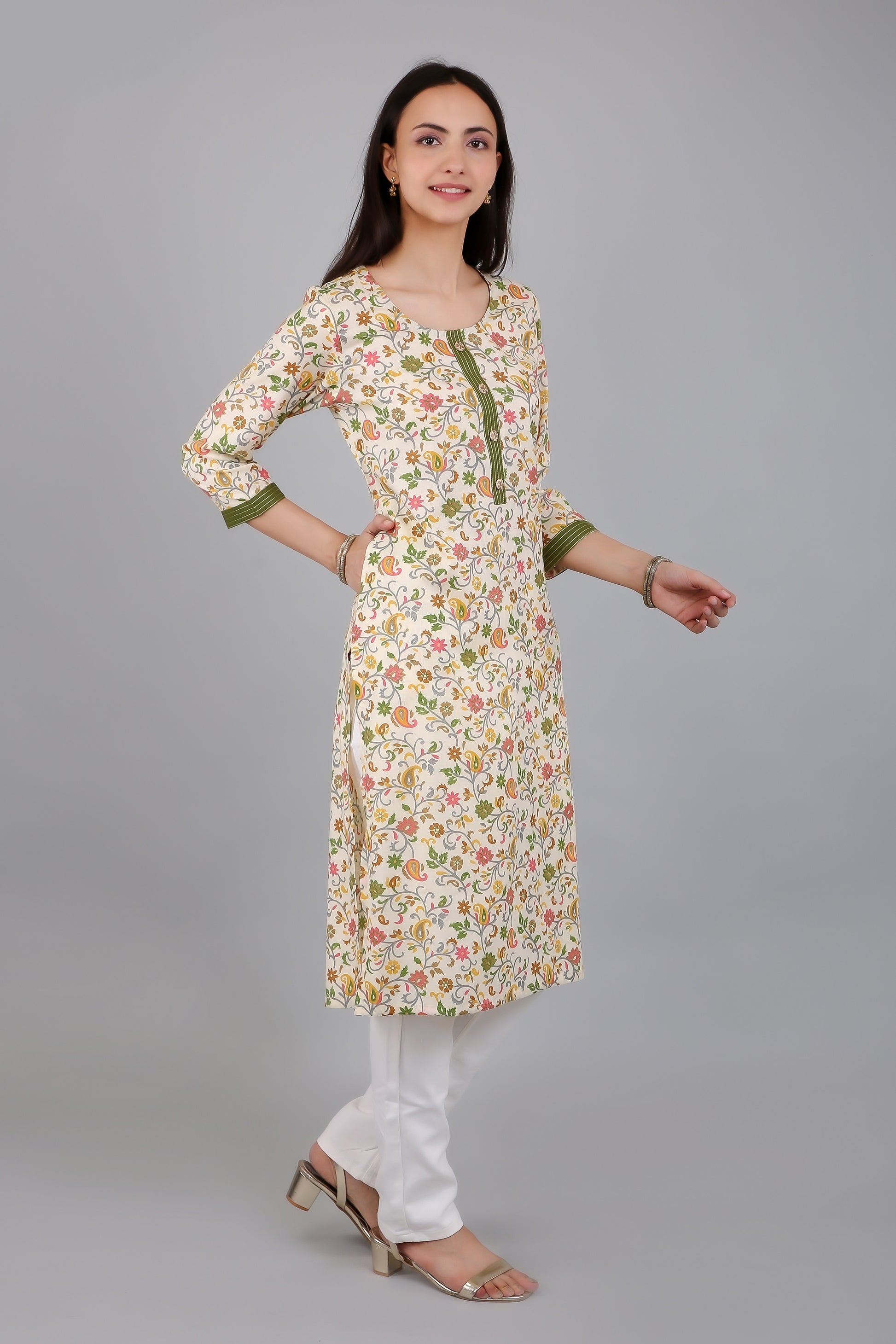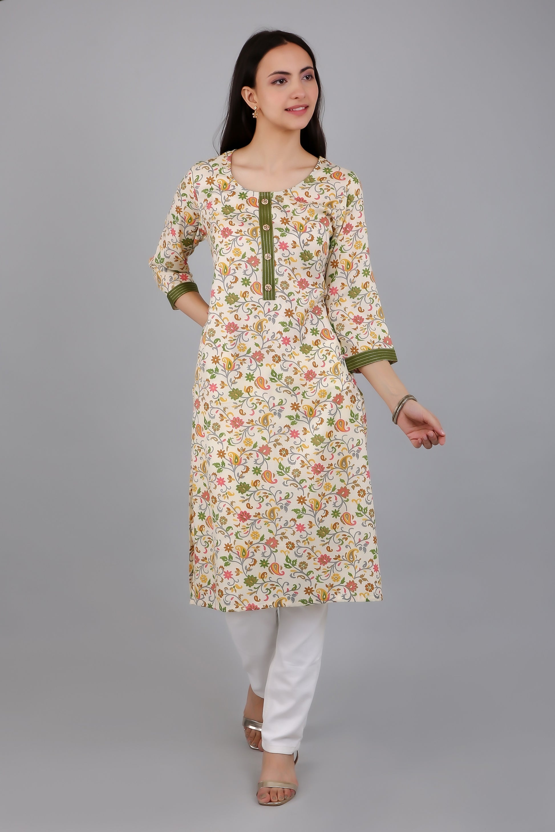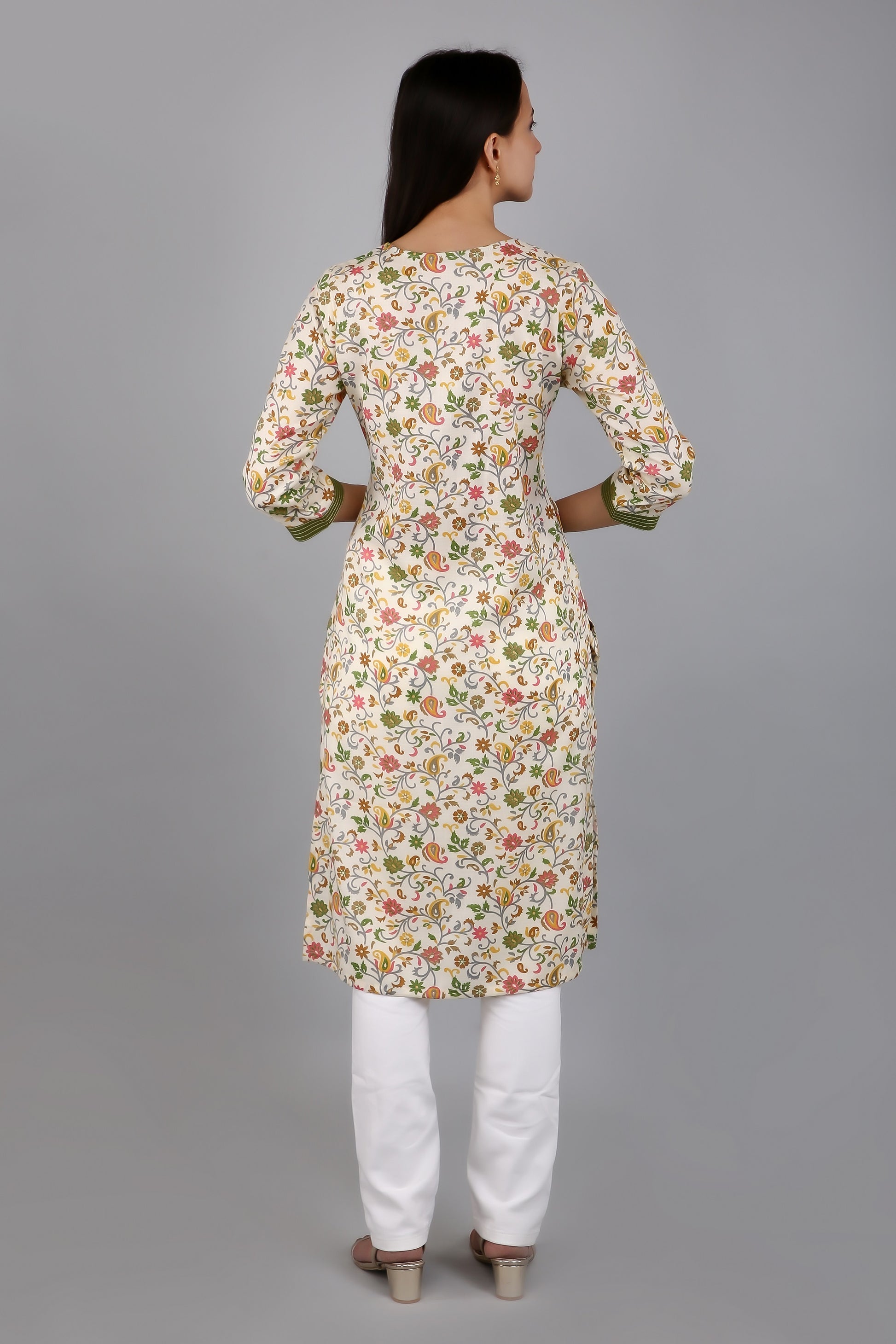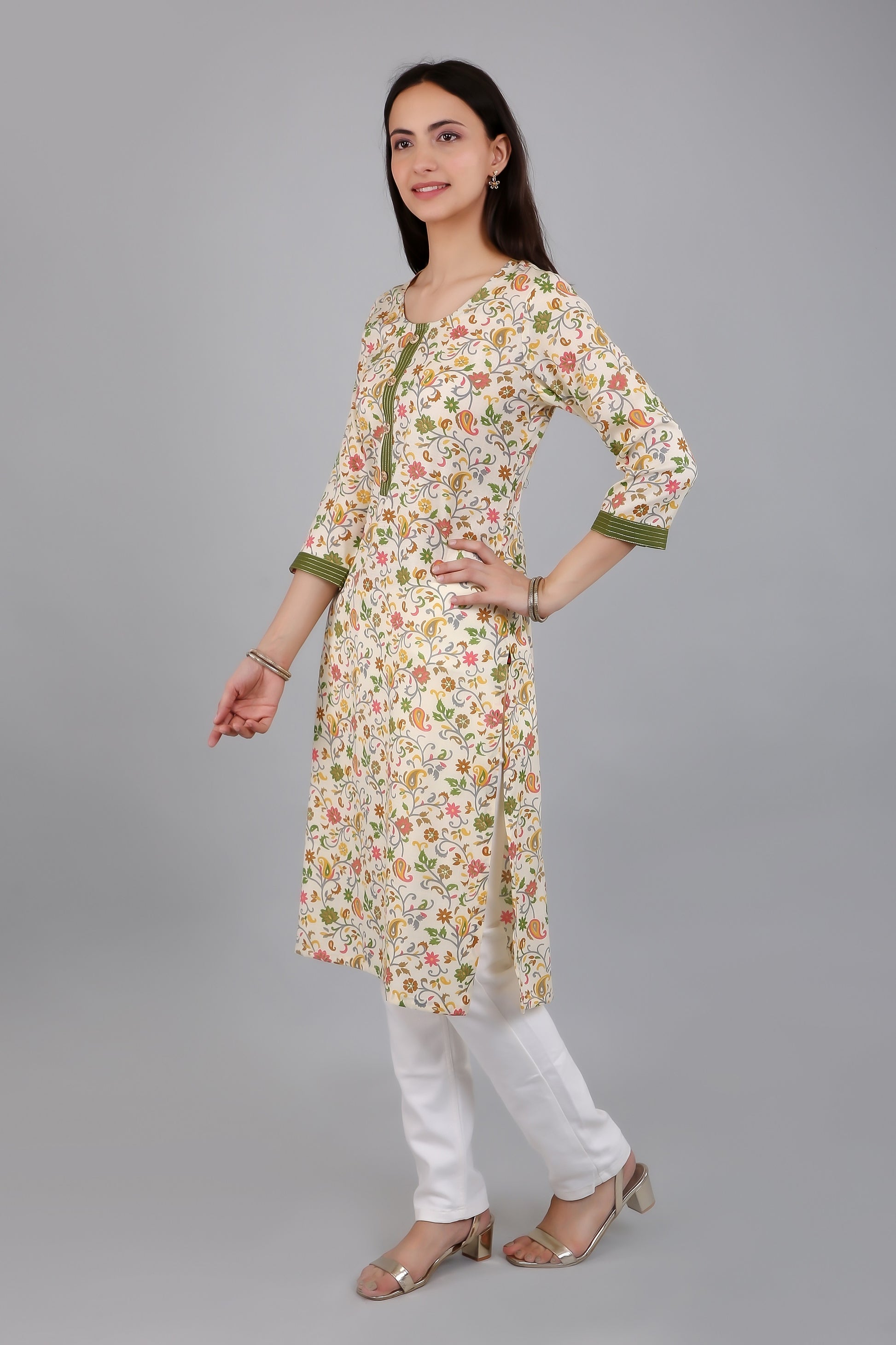 The floral print is intricately designed and printed onto the fabric, ensuring that the colors will not fade or bleed, even after multiple washes. The kurti is versatile and can be dressed up or down, making it perfect for any occasion.