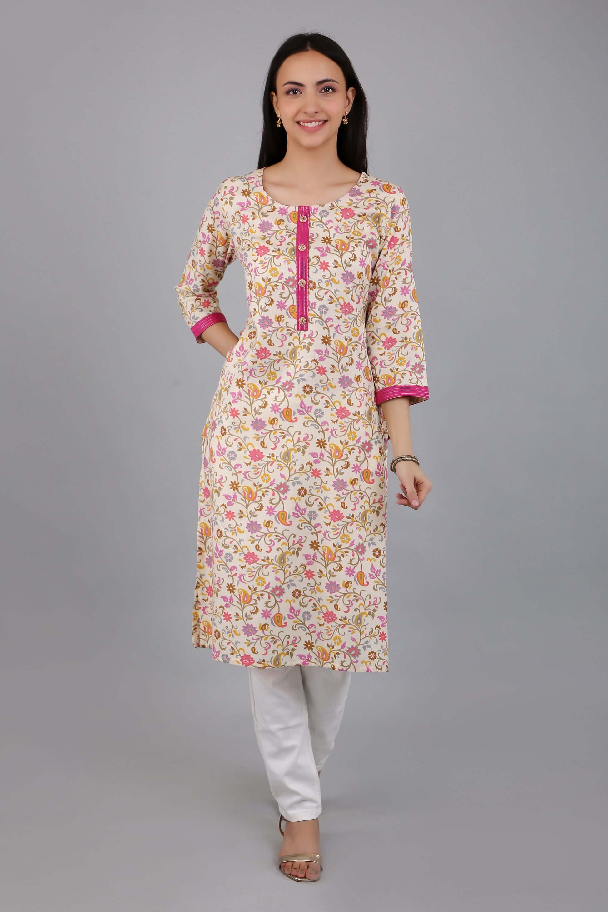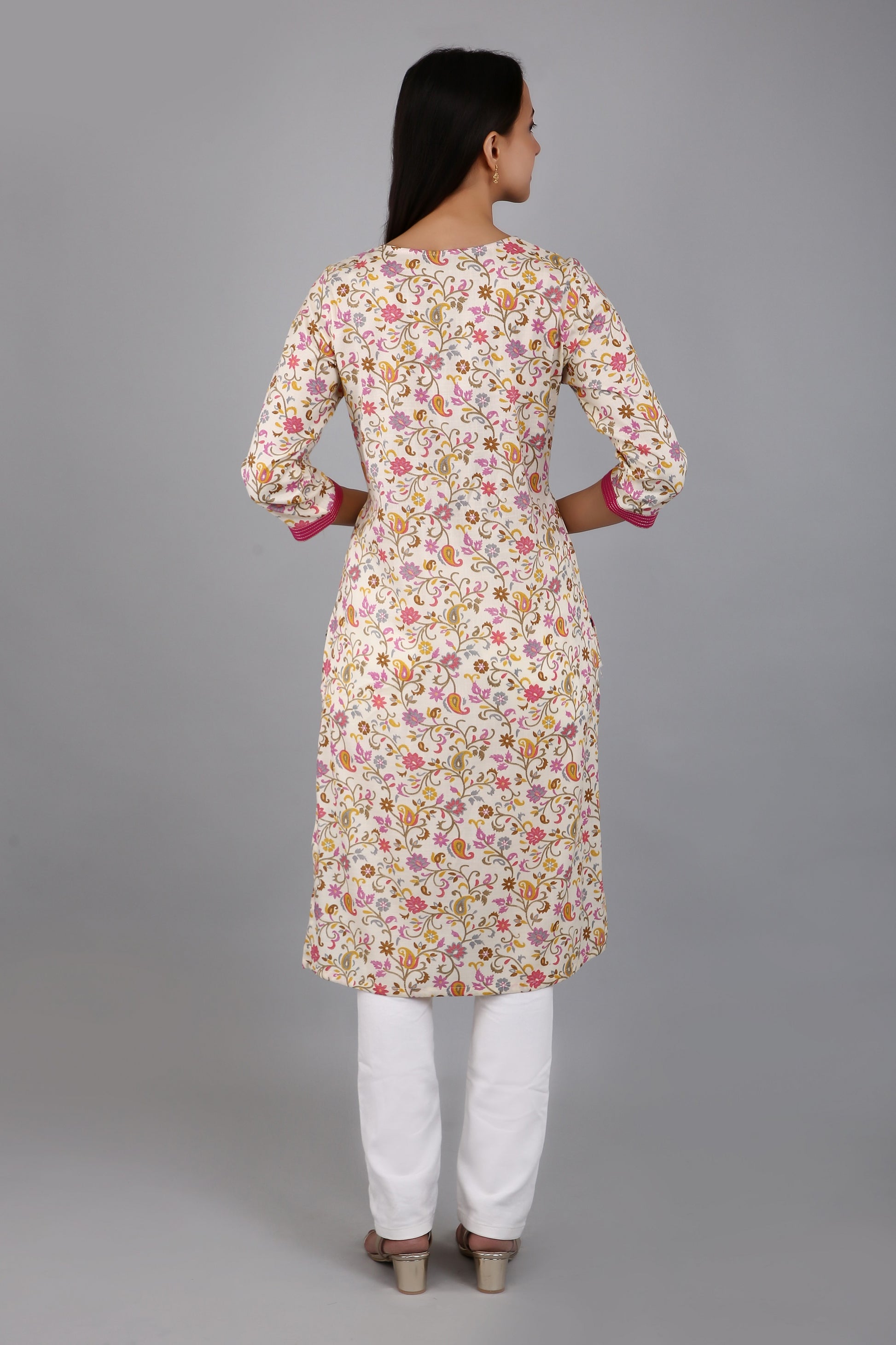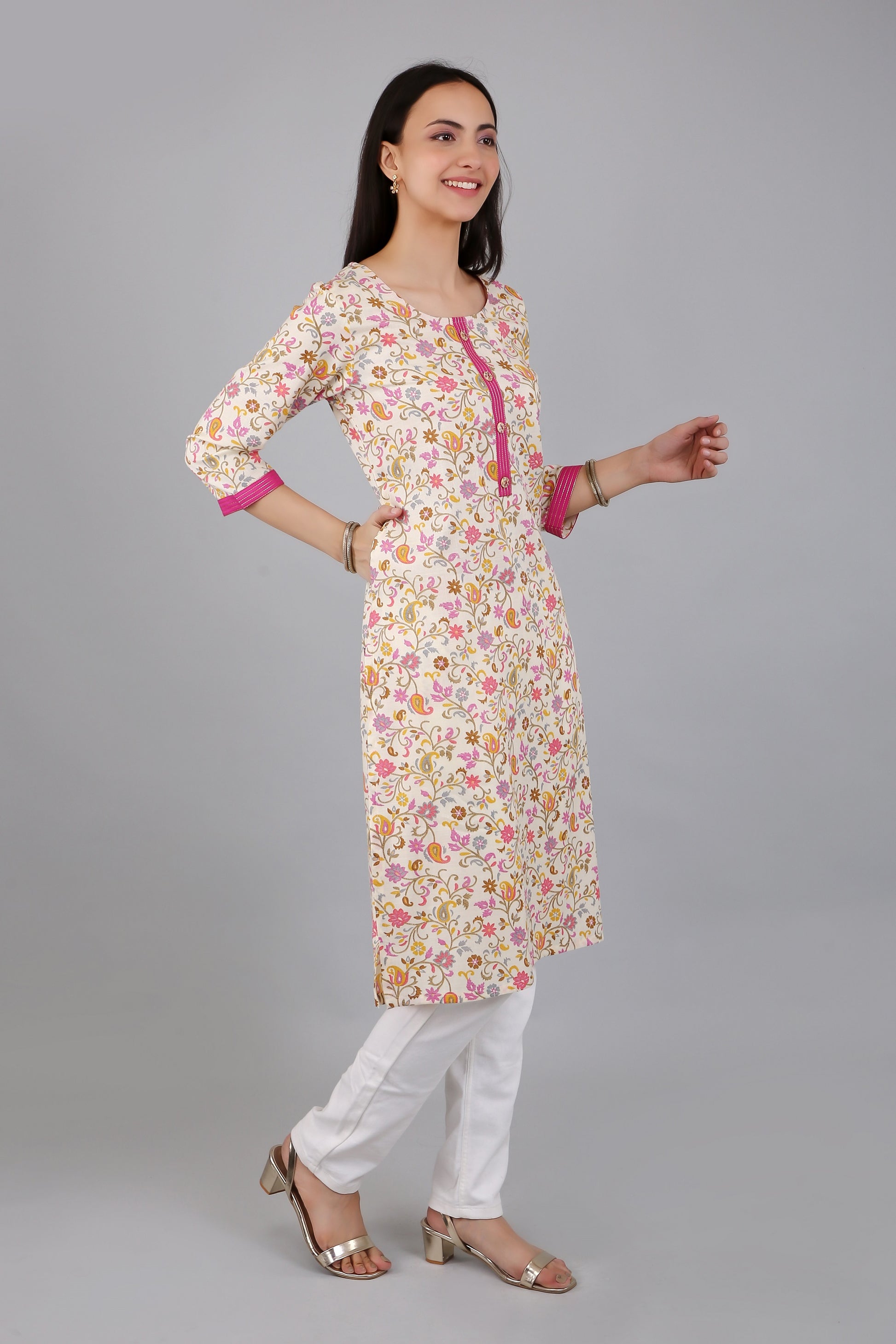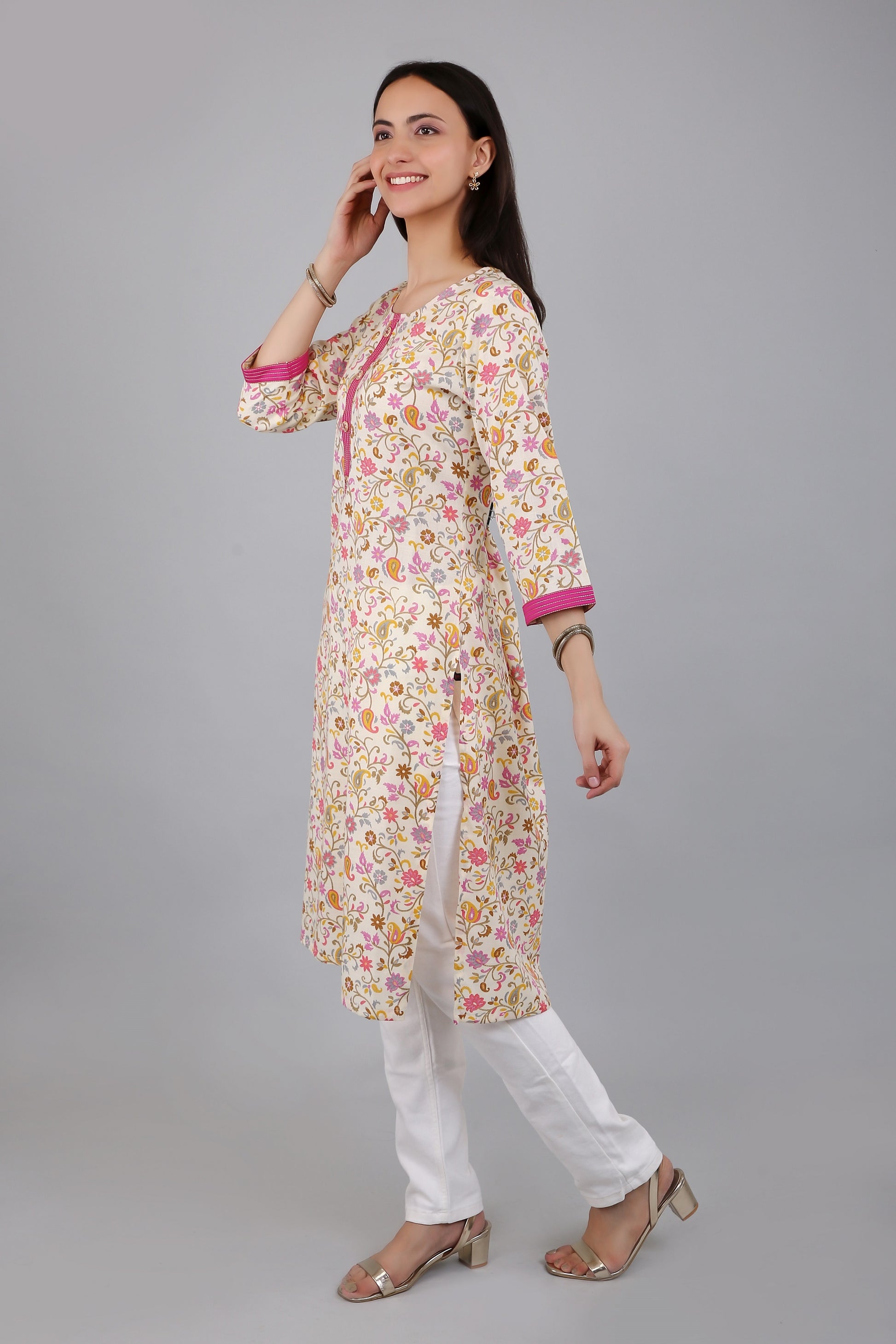 The floral print is intricately designed and printed onto the fabric, ensuring that the colors will not fade or bleed, even after multiple washes. The kurti is versatile and can be dressed up or down, making it perfect for any occasion.