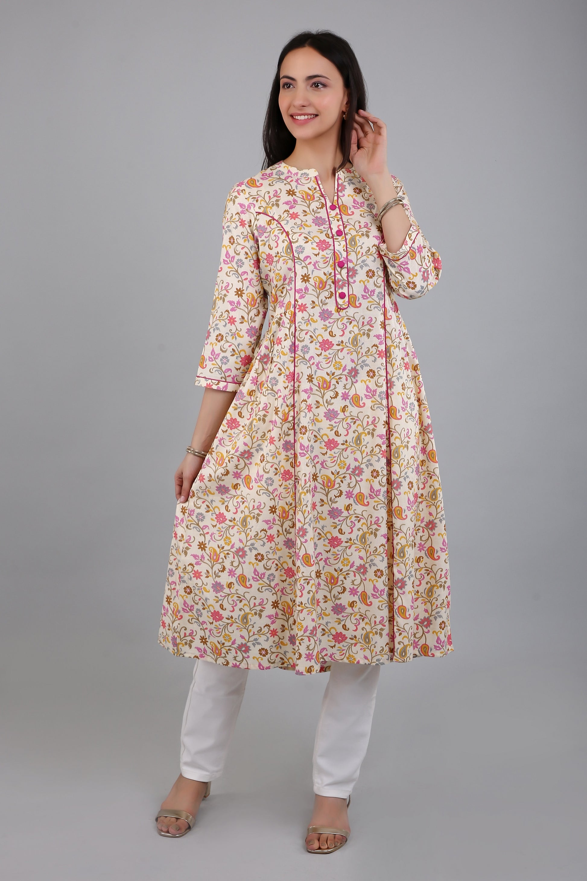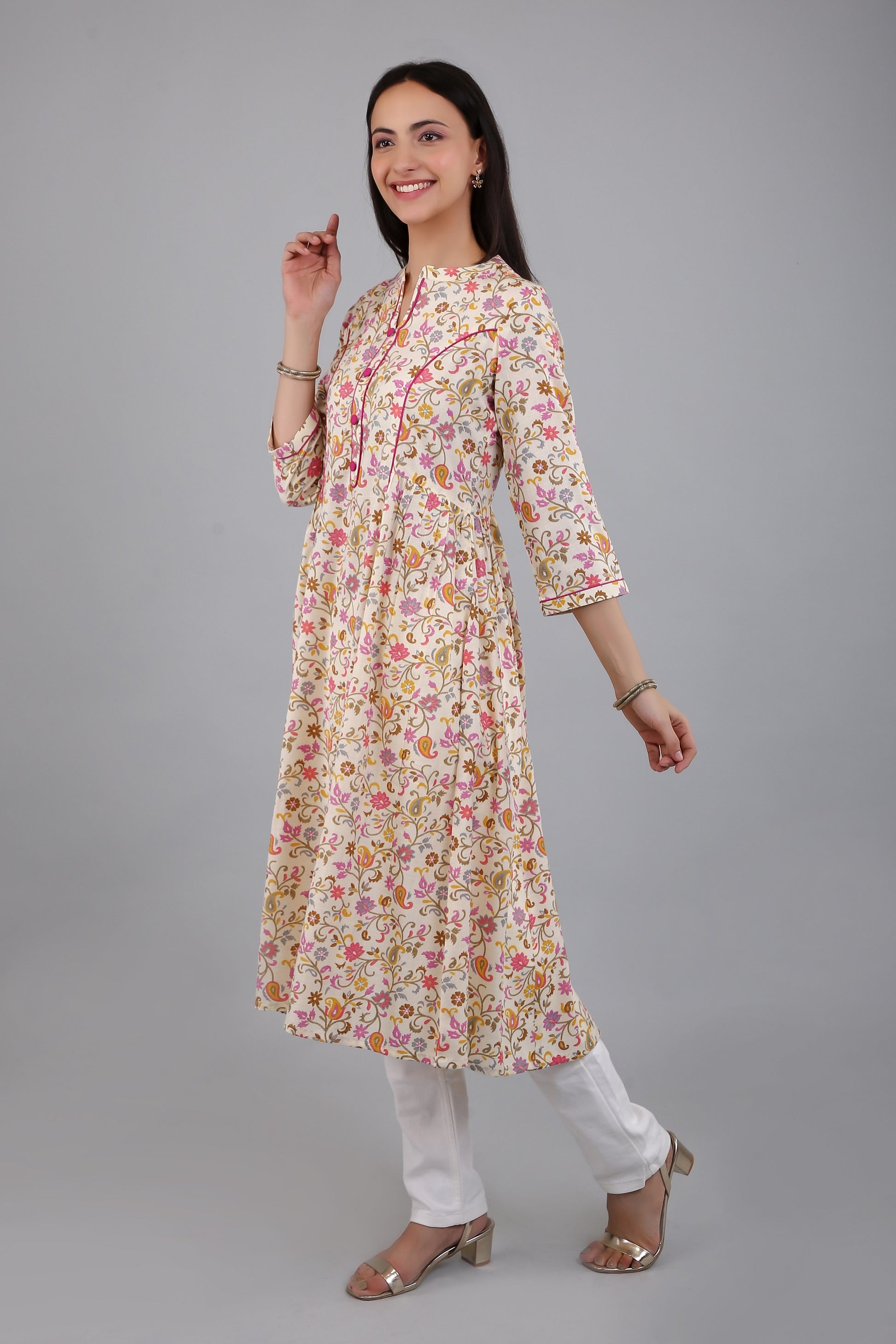 The Anarkali style silhouette of the kurti flares out gracefully from the waist, providing a comfortable fit for all body types. The side flares add a touch of elegance and sophistication to the kurti, while also allowing for ease of movement.