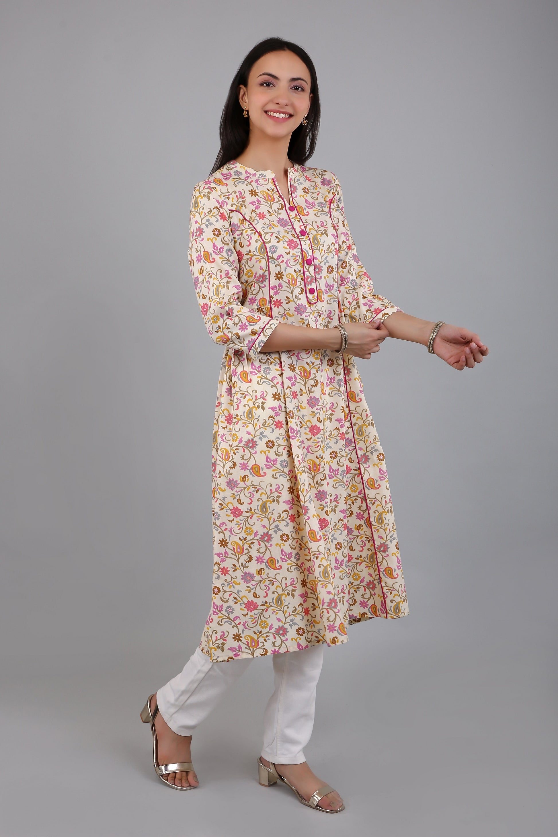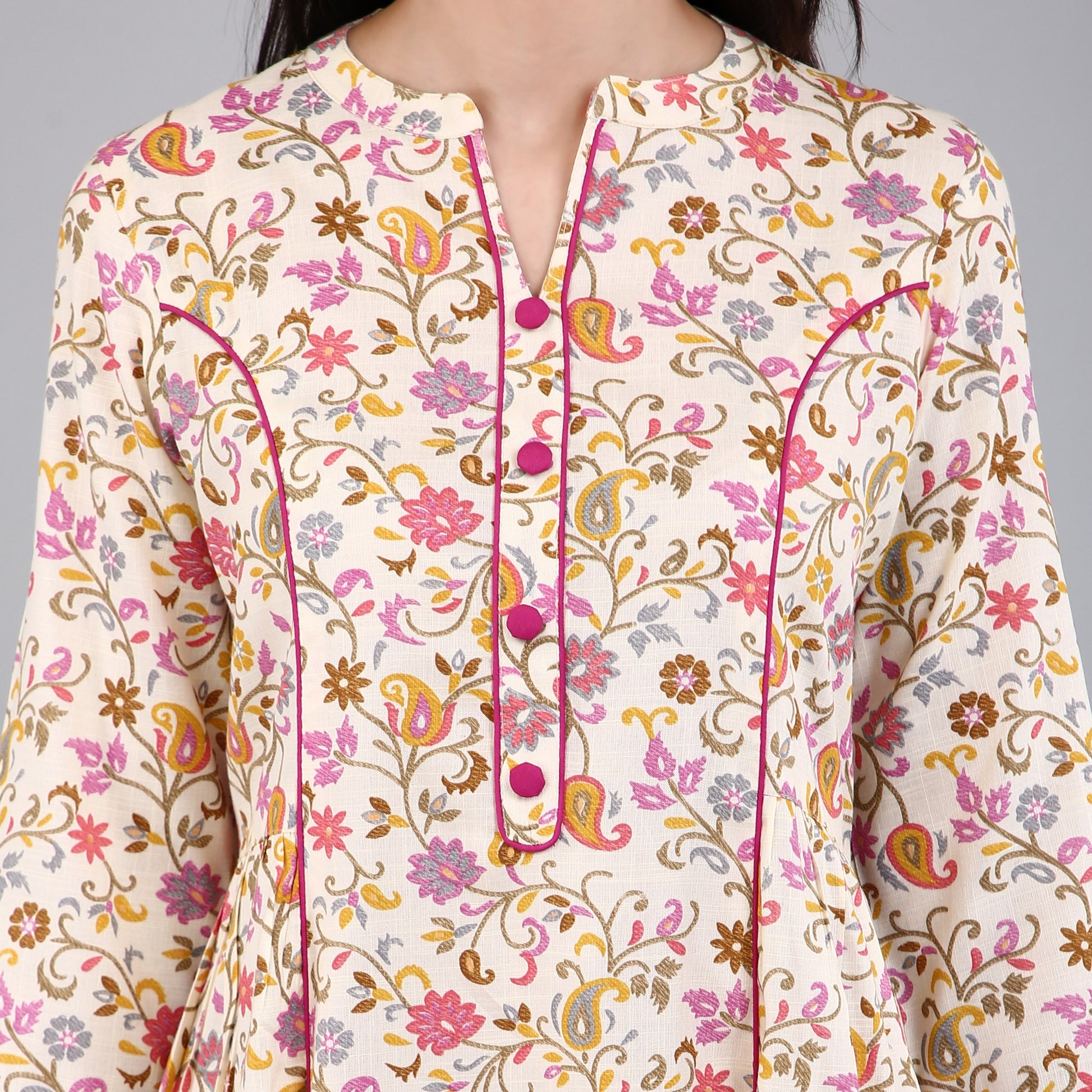 The floral print is intricately designed and printed onto the fabric, ensuring that the colors will not fade or bleed, even after multiple washes. The kurti is versatile and can be dressed up or down, making it perfect for any occasion.