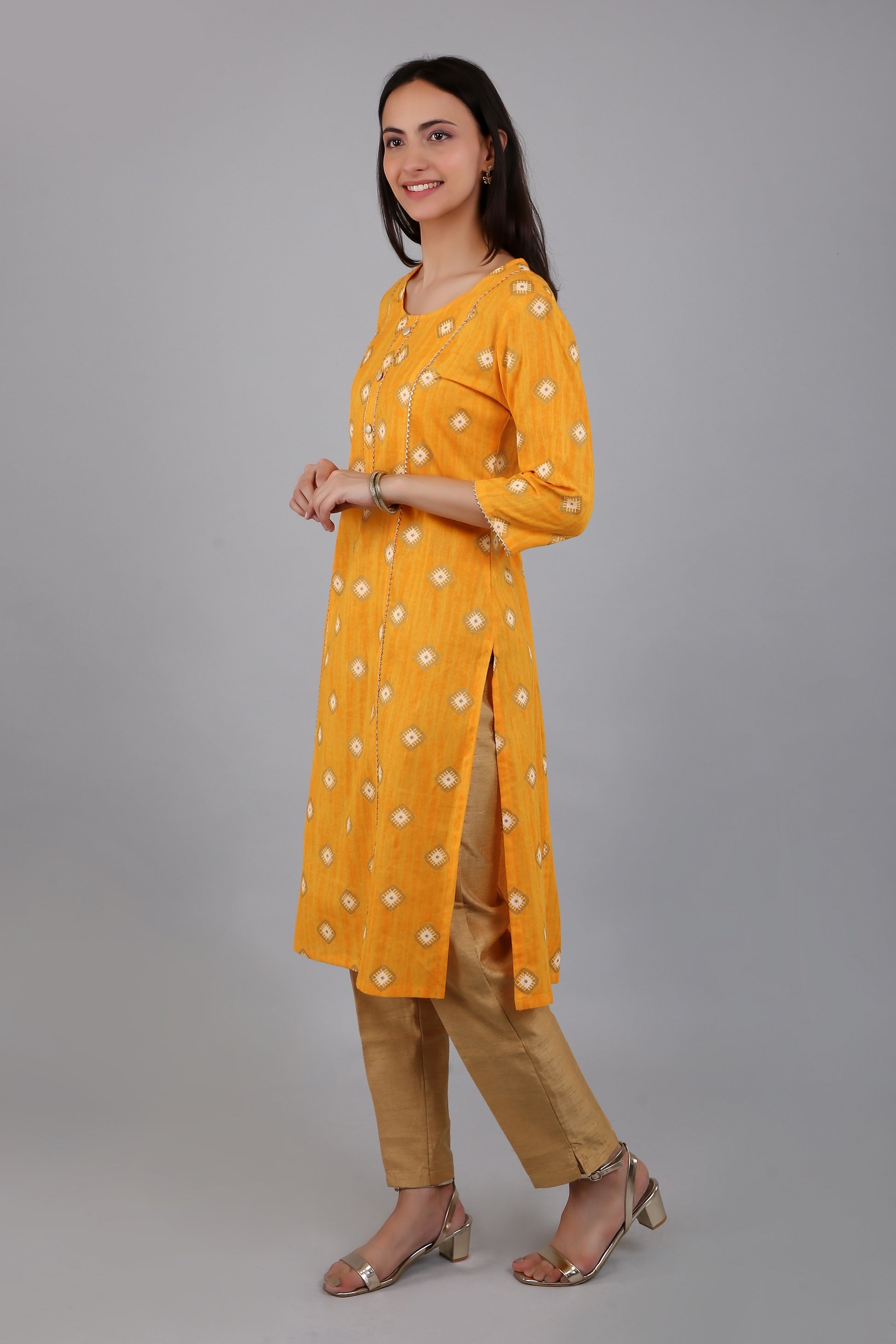 The A-line silhouette of the kurta flares out gracefully from the waist, providing a comfortable fit for all body types. The side slits add a touch of elegance and sophistication to the kurta, while also allowing for ease of movement.