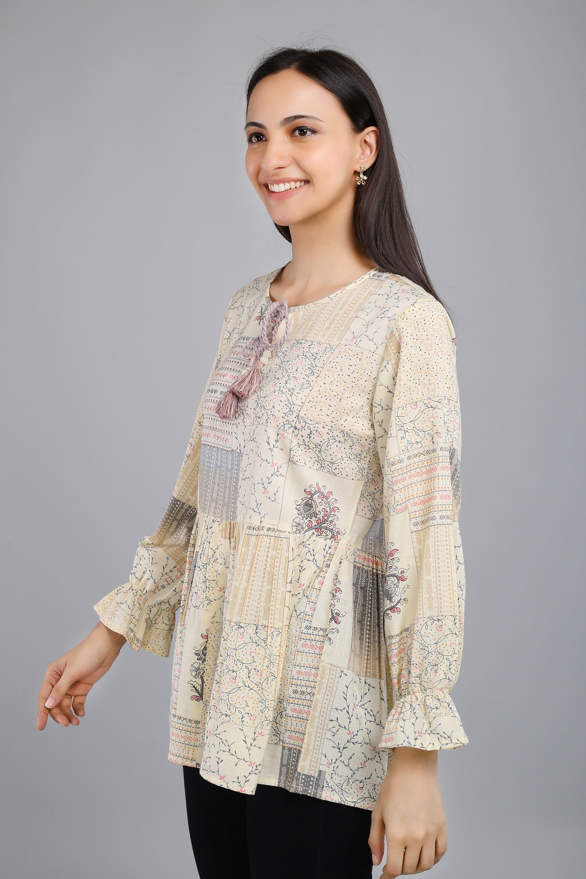 VAPPS Printed Cotton Flared Tie-Up Neck Tunic - Grey
