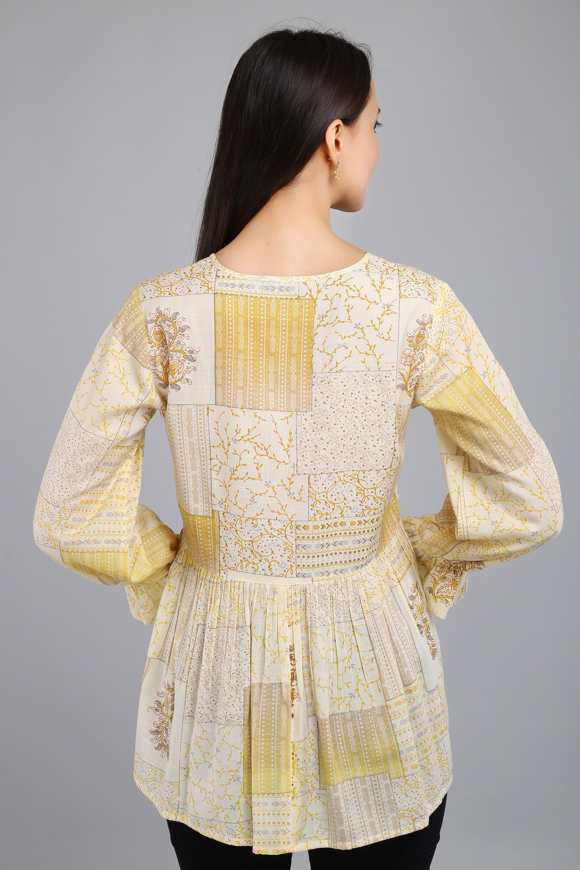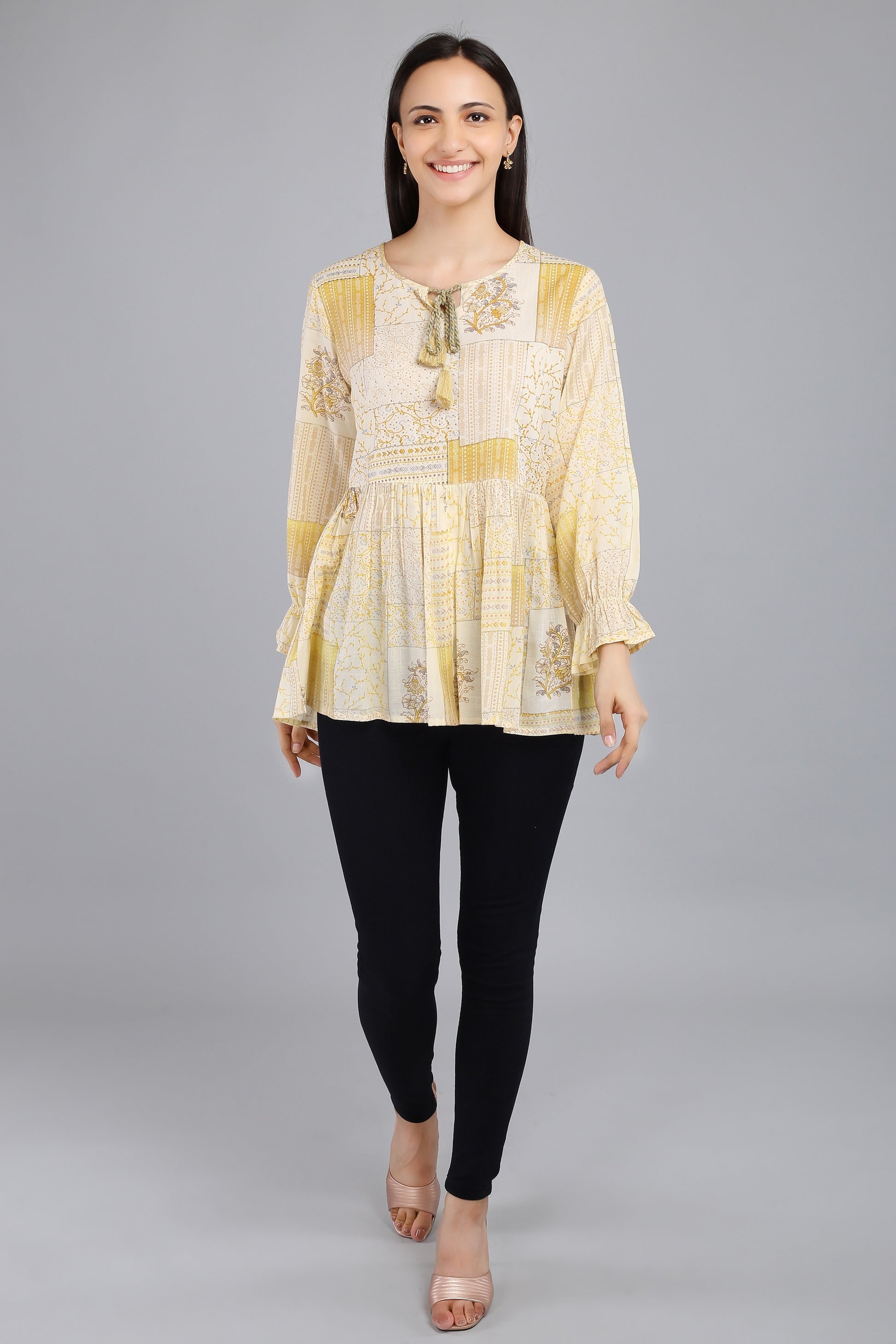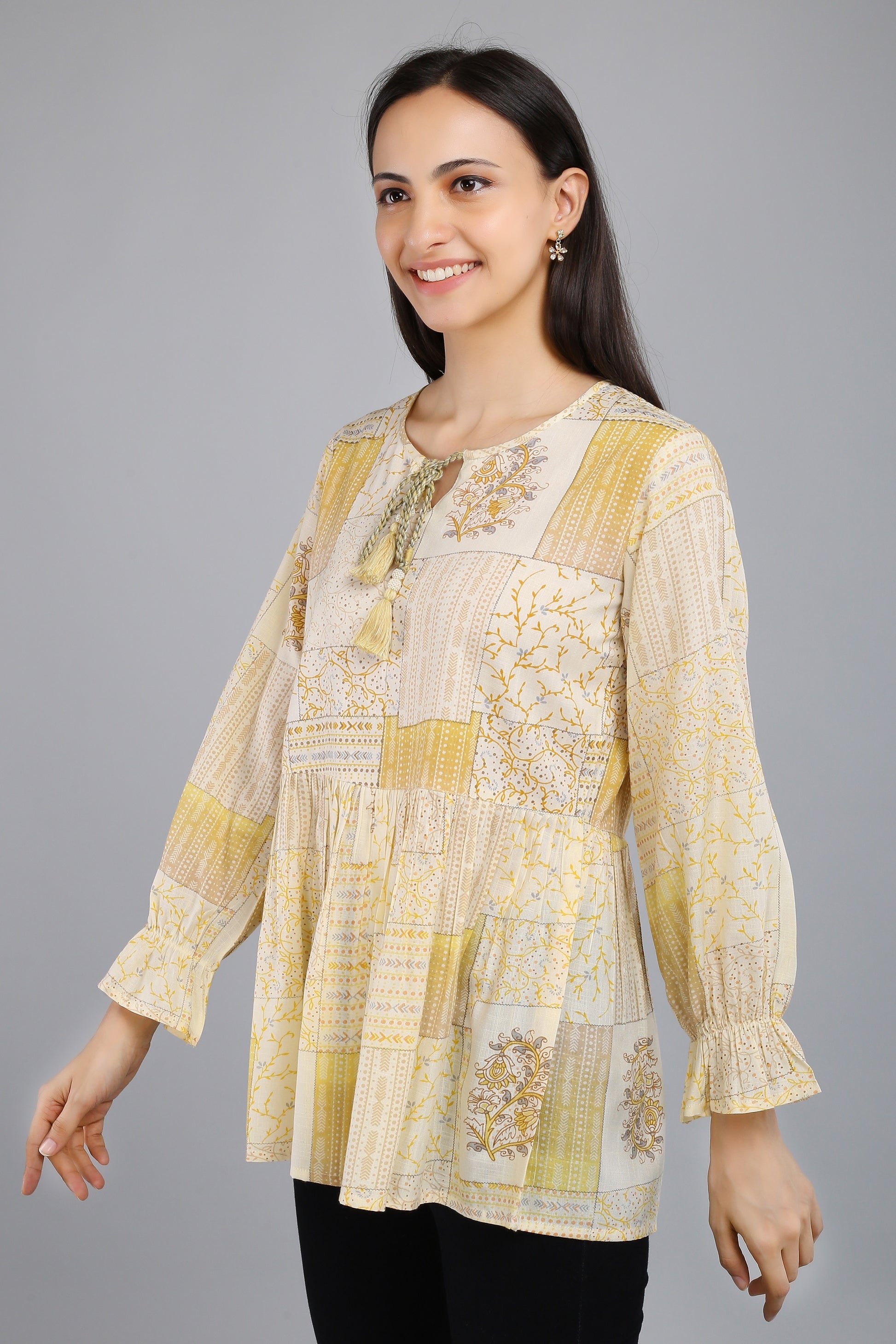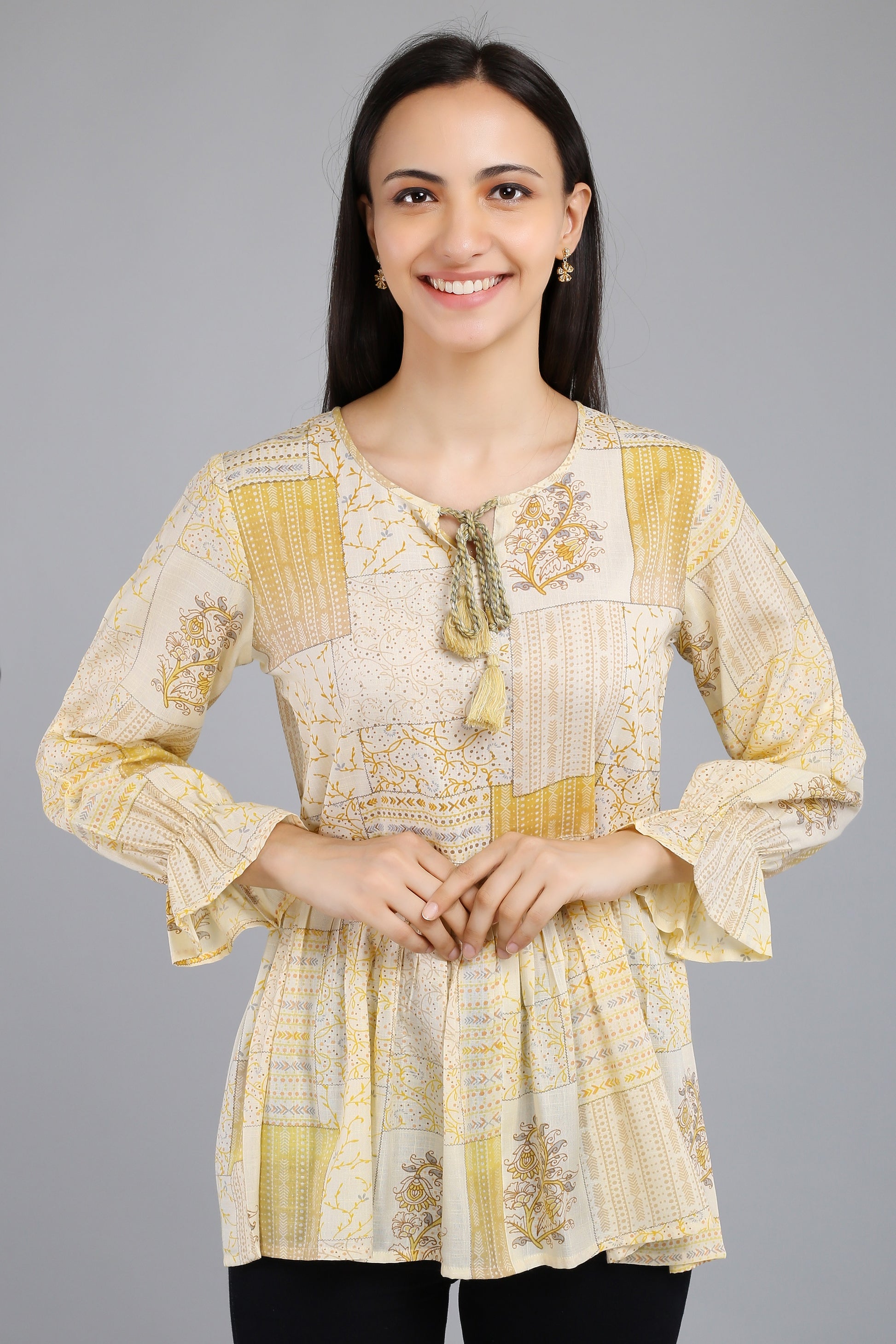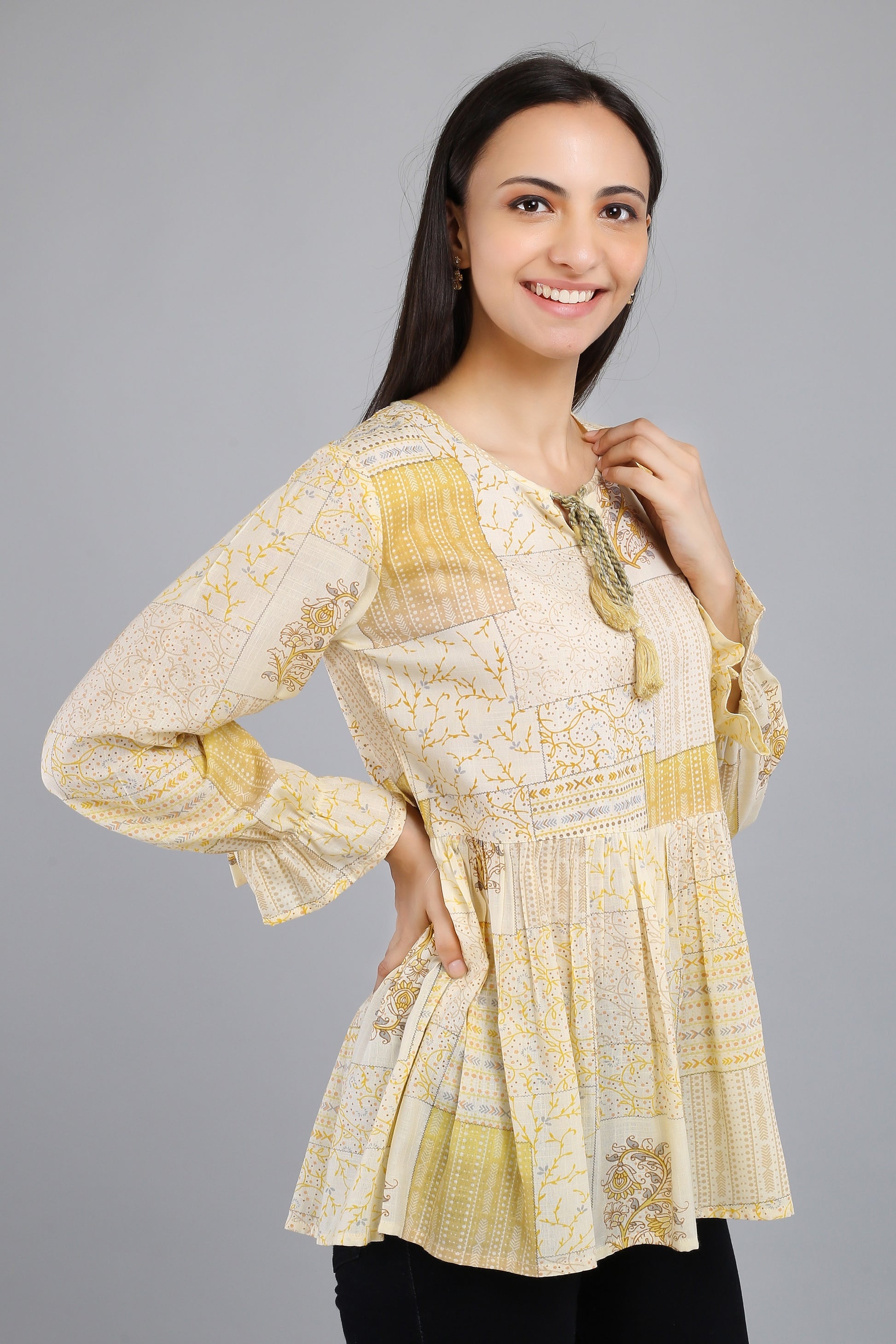 VAPPS Printed Cotton Flared Tie-Up Neck Tunic - Yellow