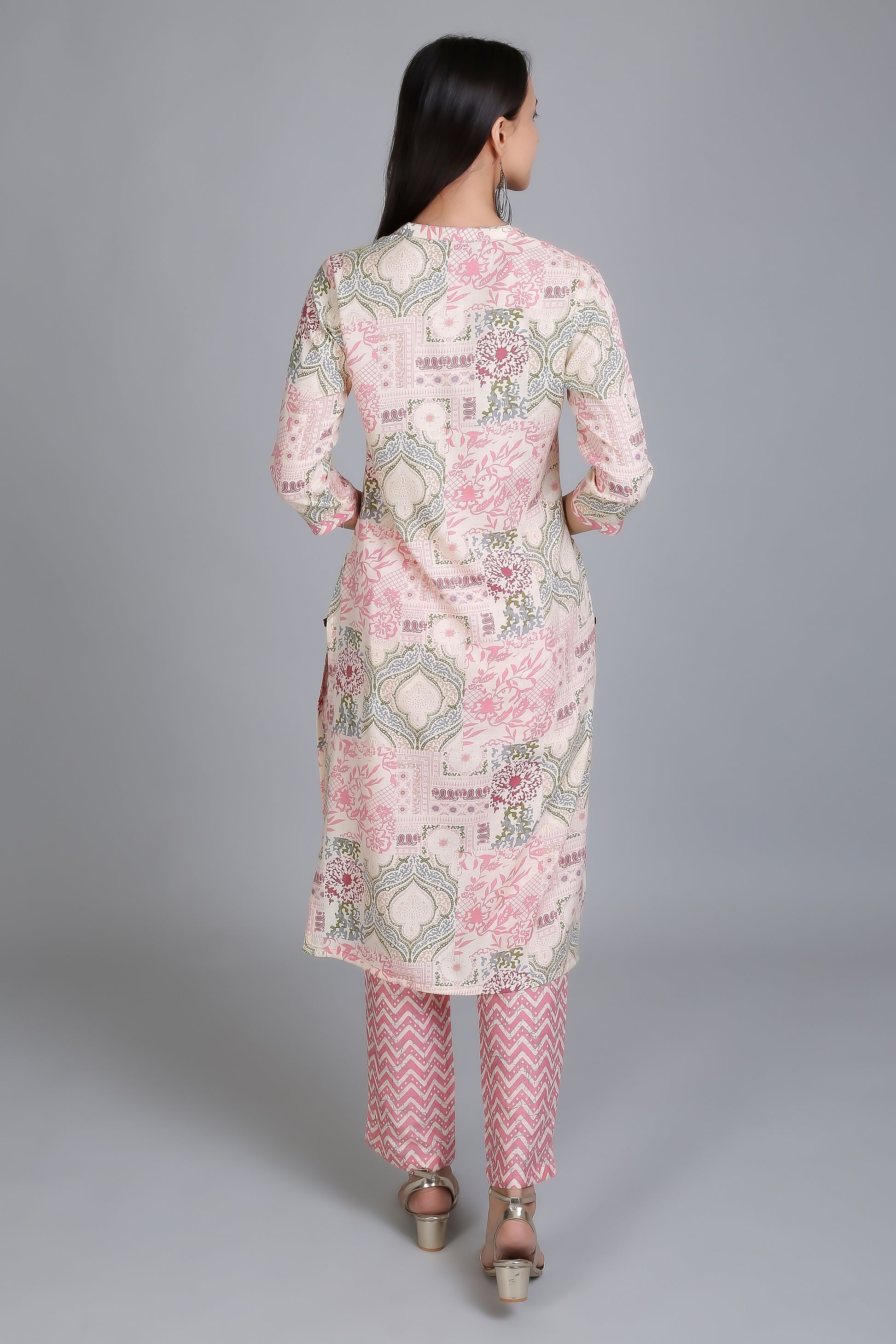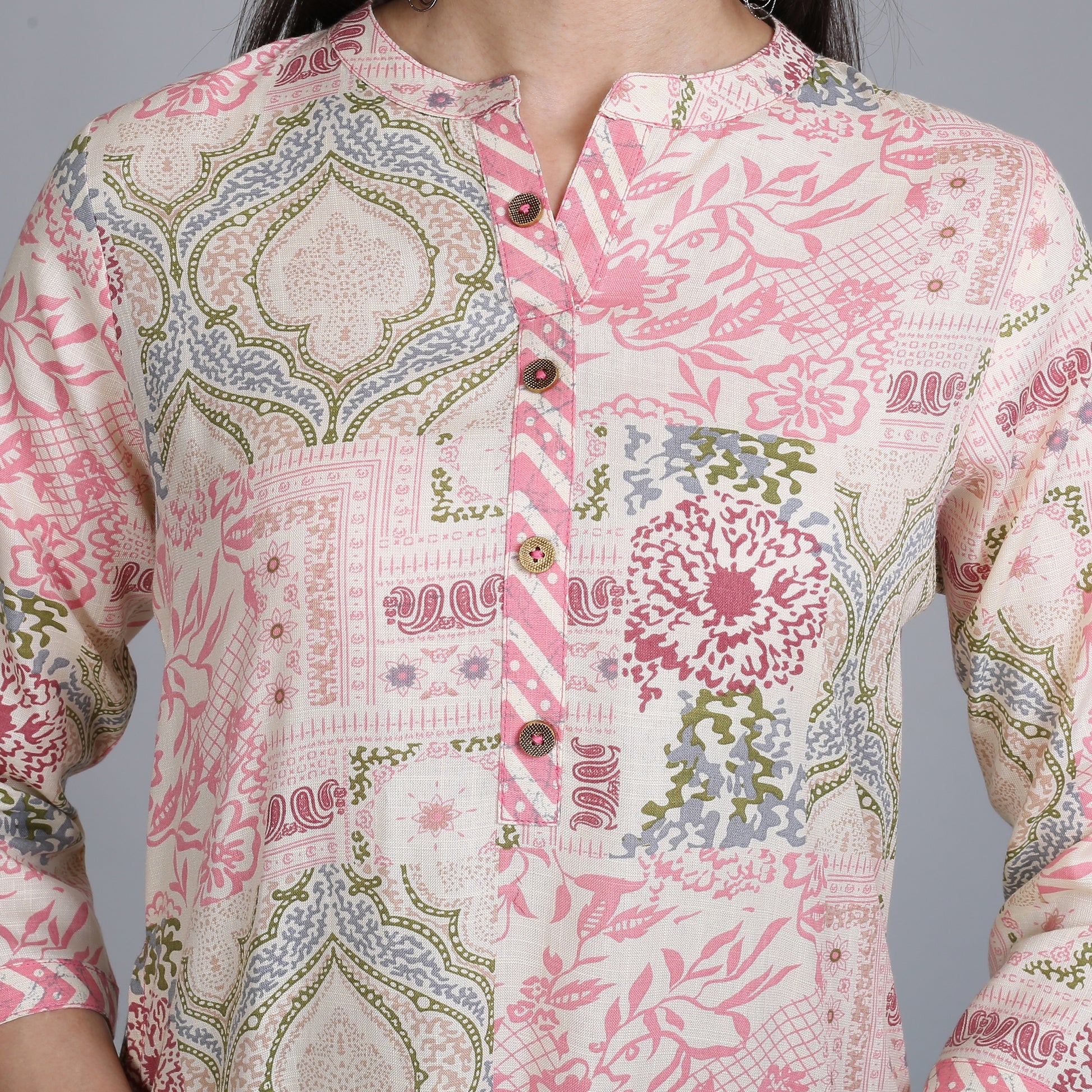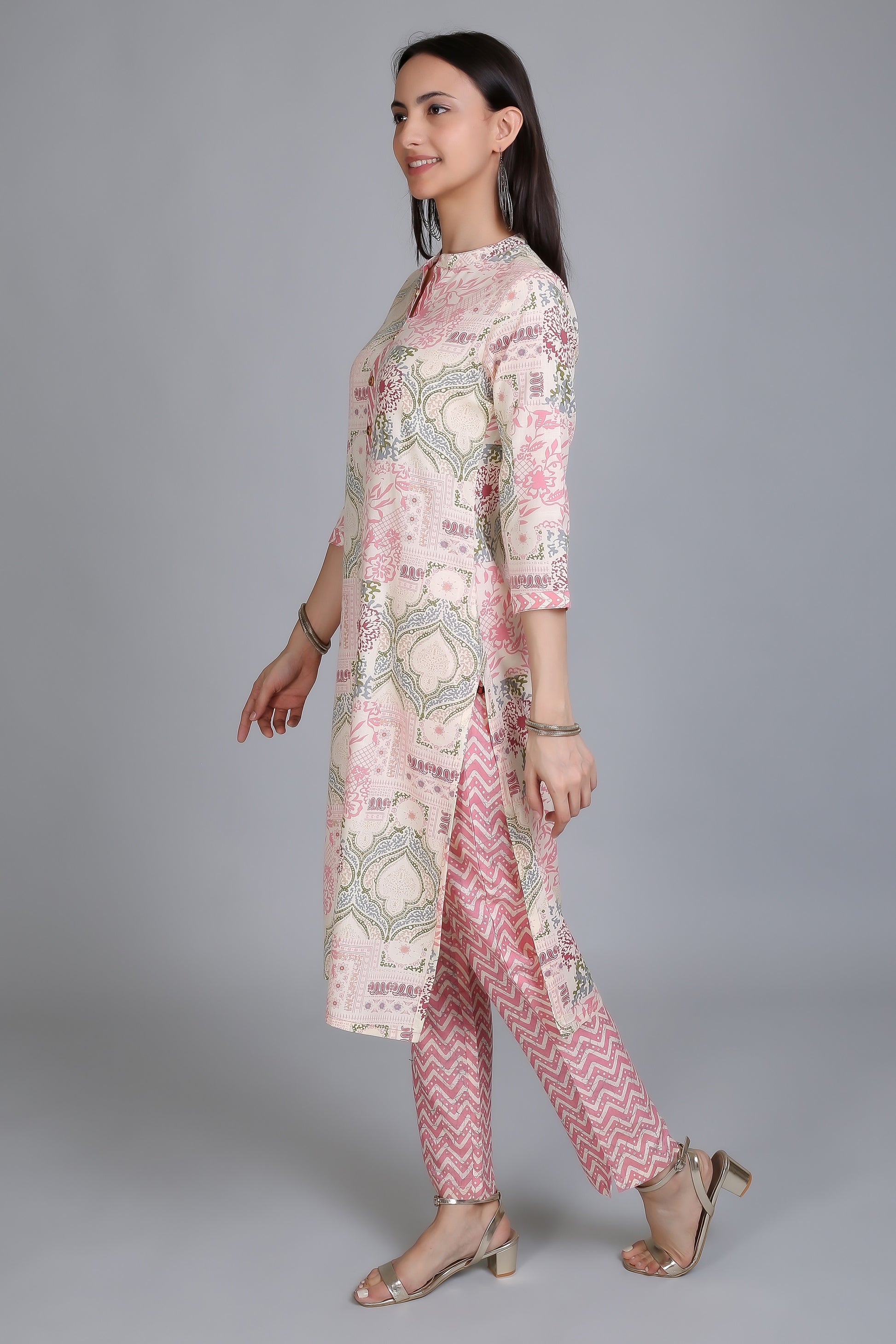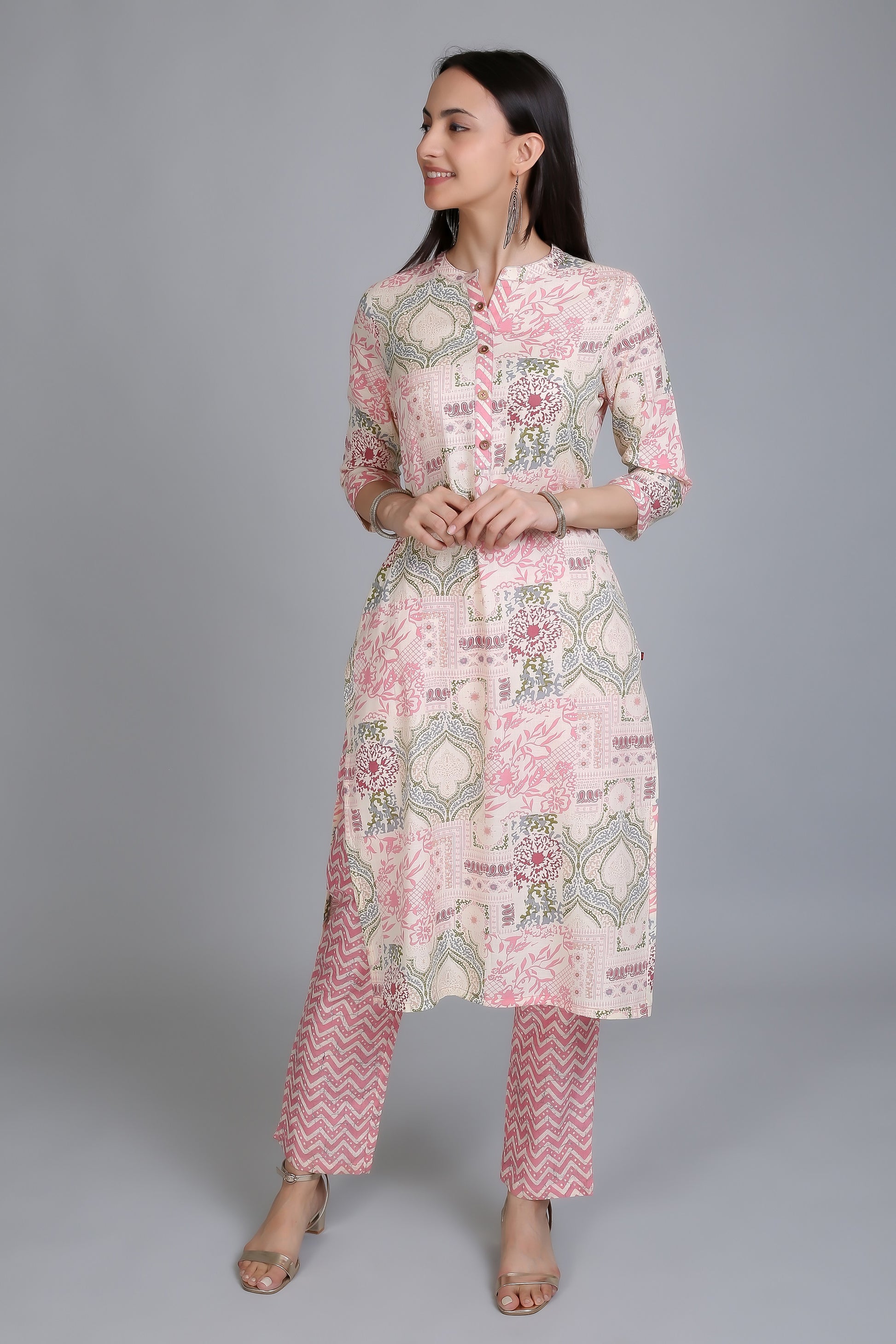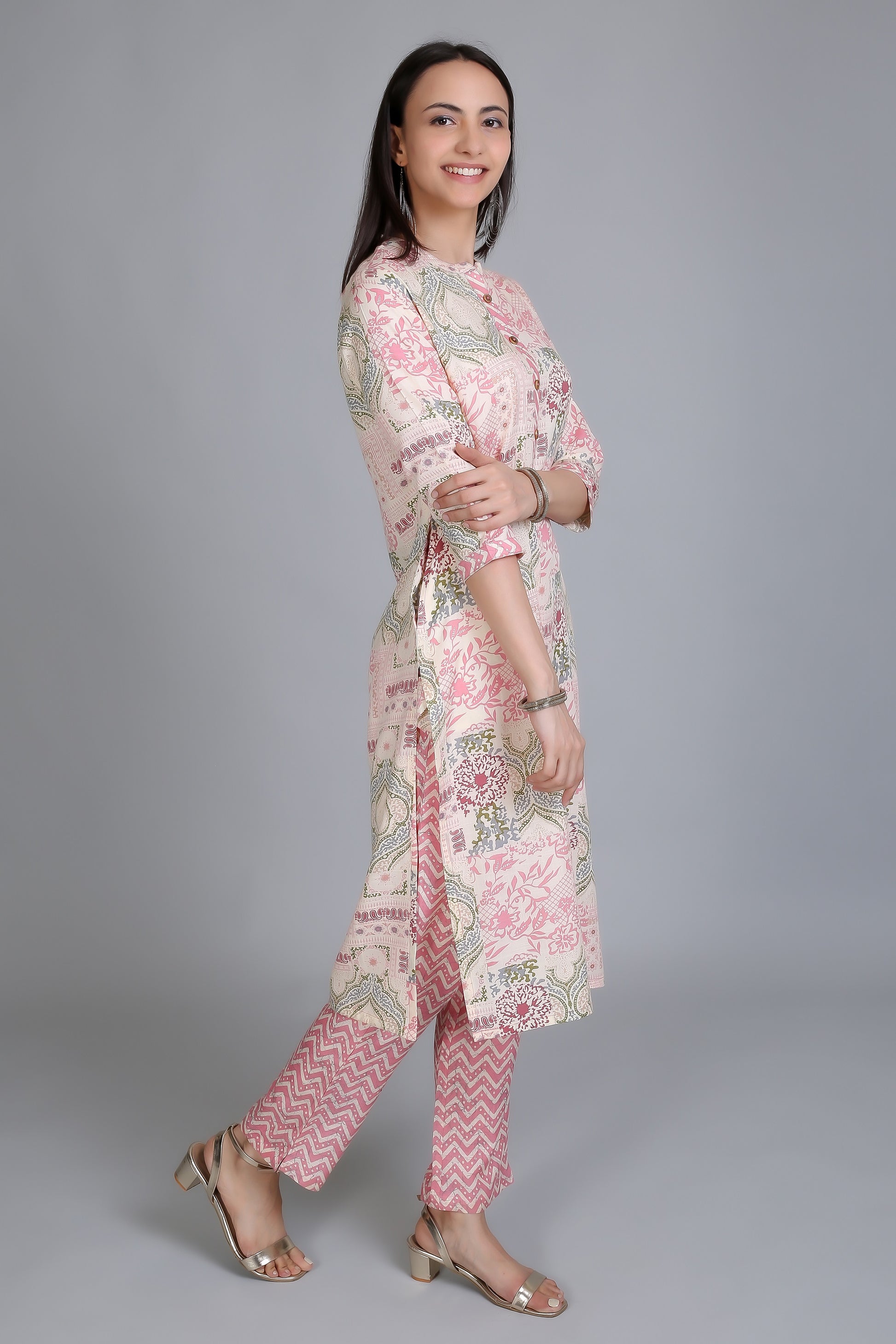 VAPPS Printed Cotton Mandarin Women's Knee Length Kurti with Pants Set -Pink