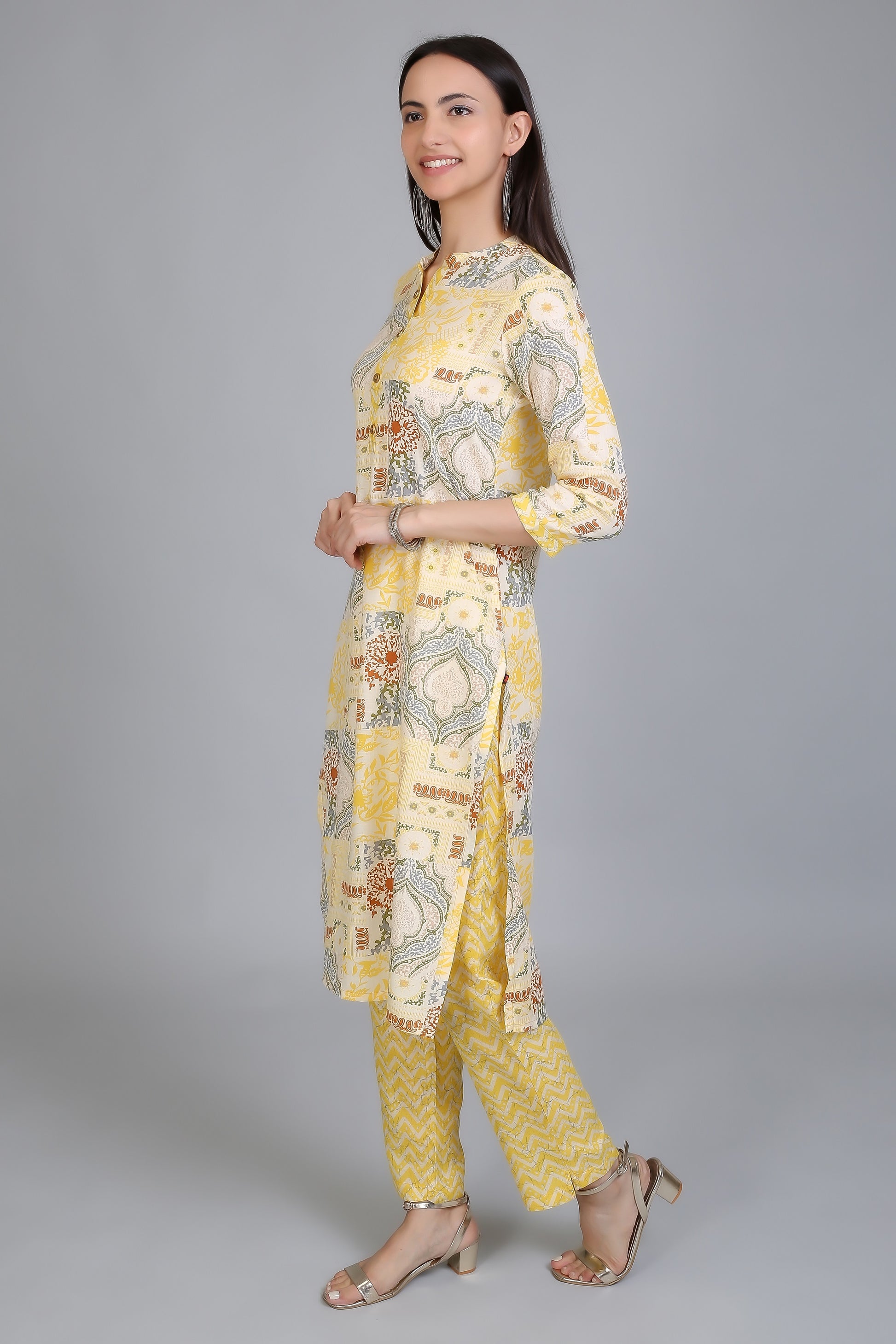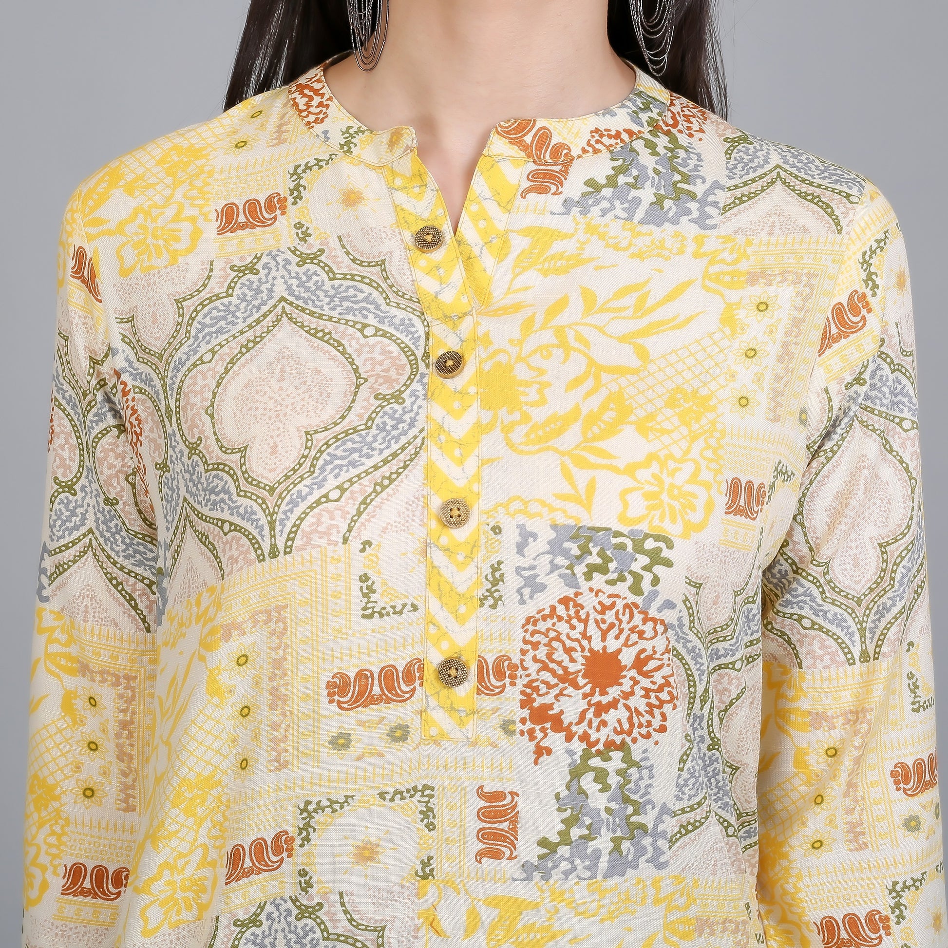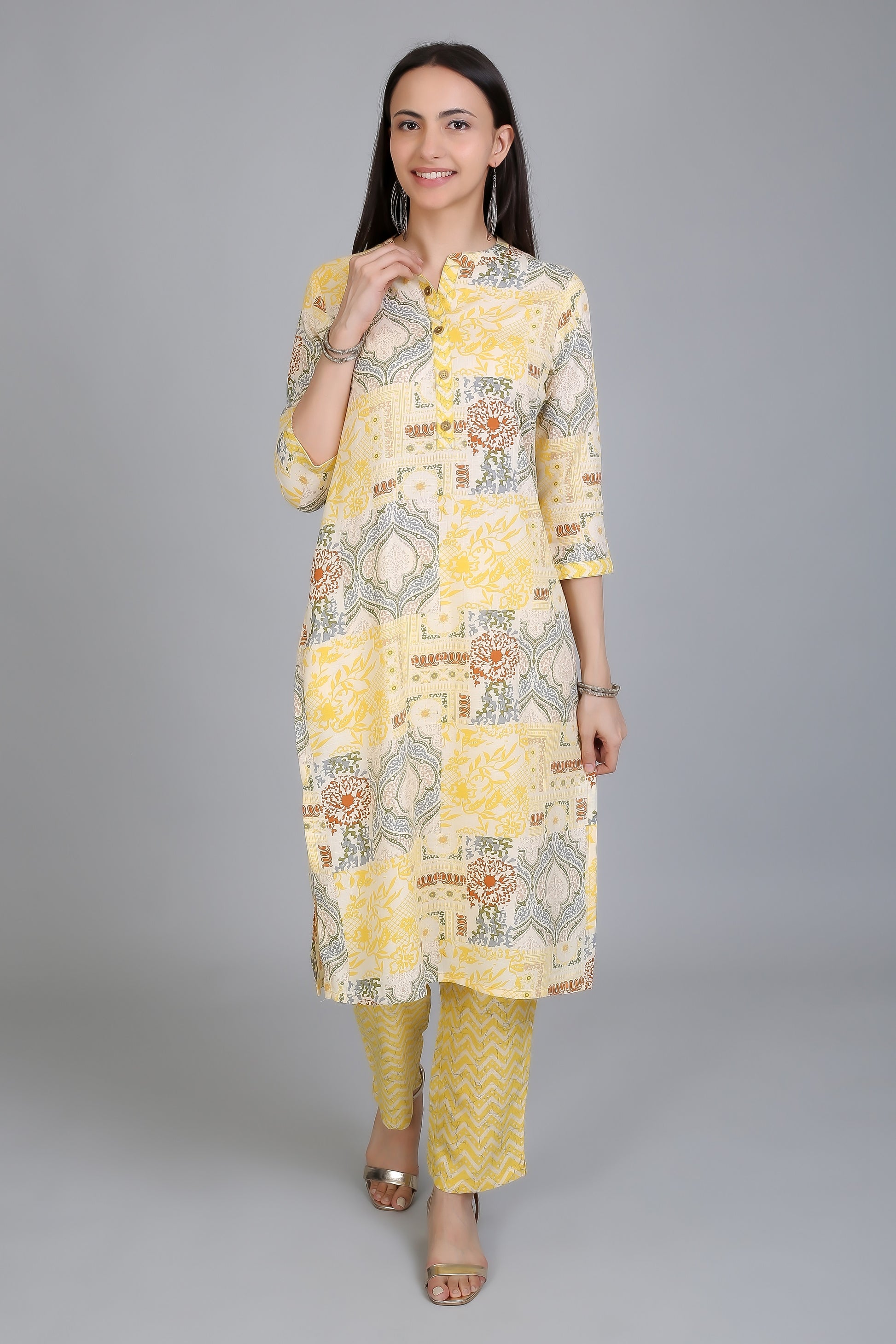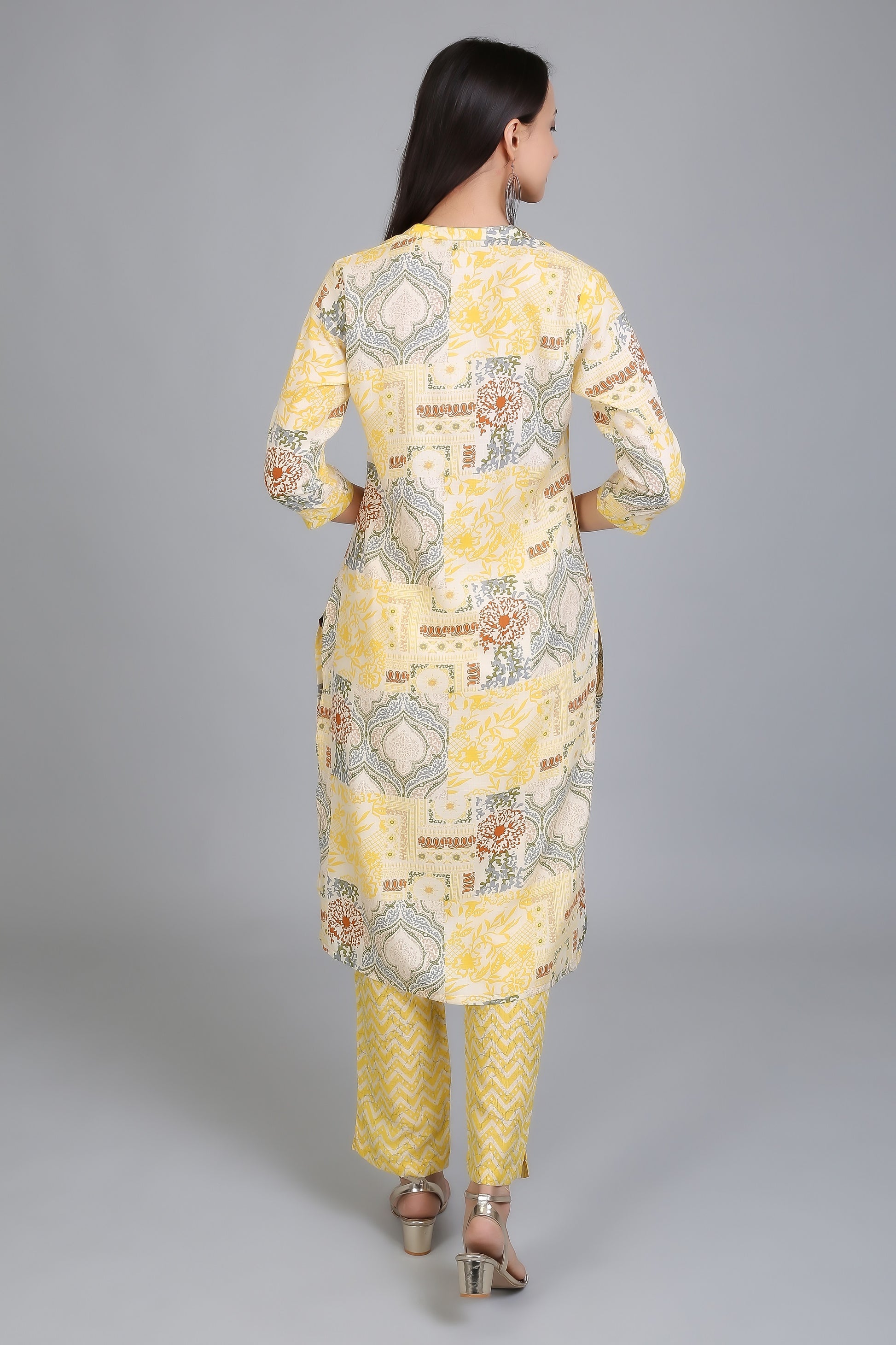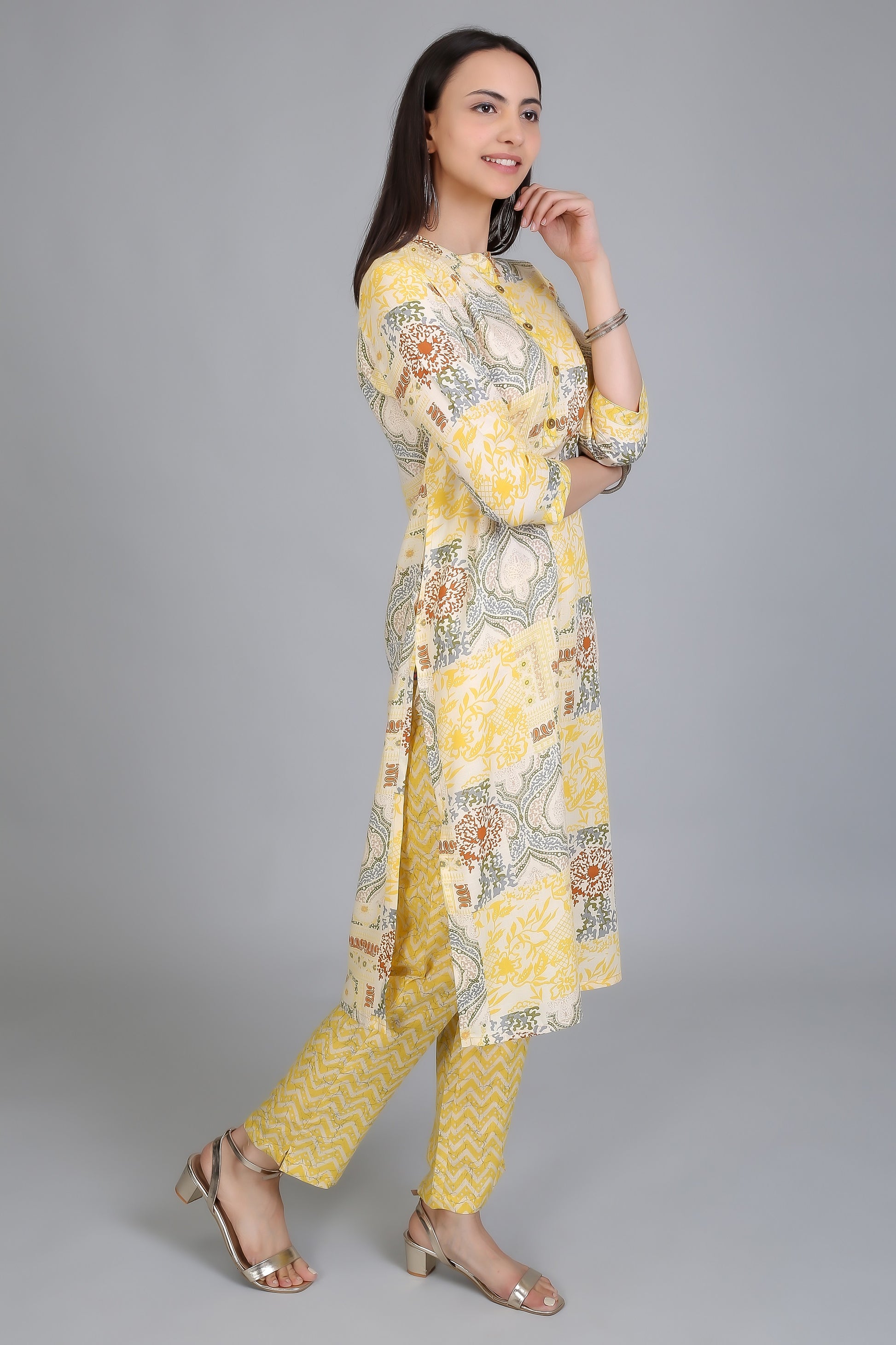 VAPPS Printed Cotton Mandarin Women's Knee Length Kurti with Pants Set - Yellow